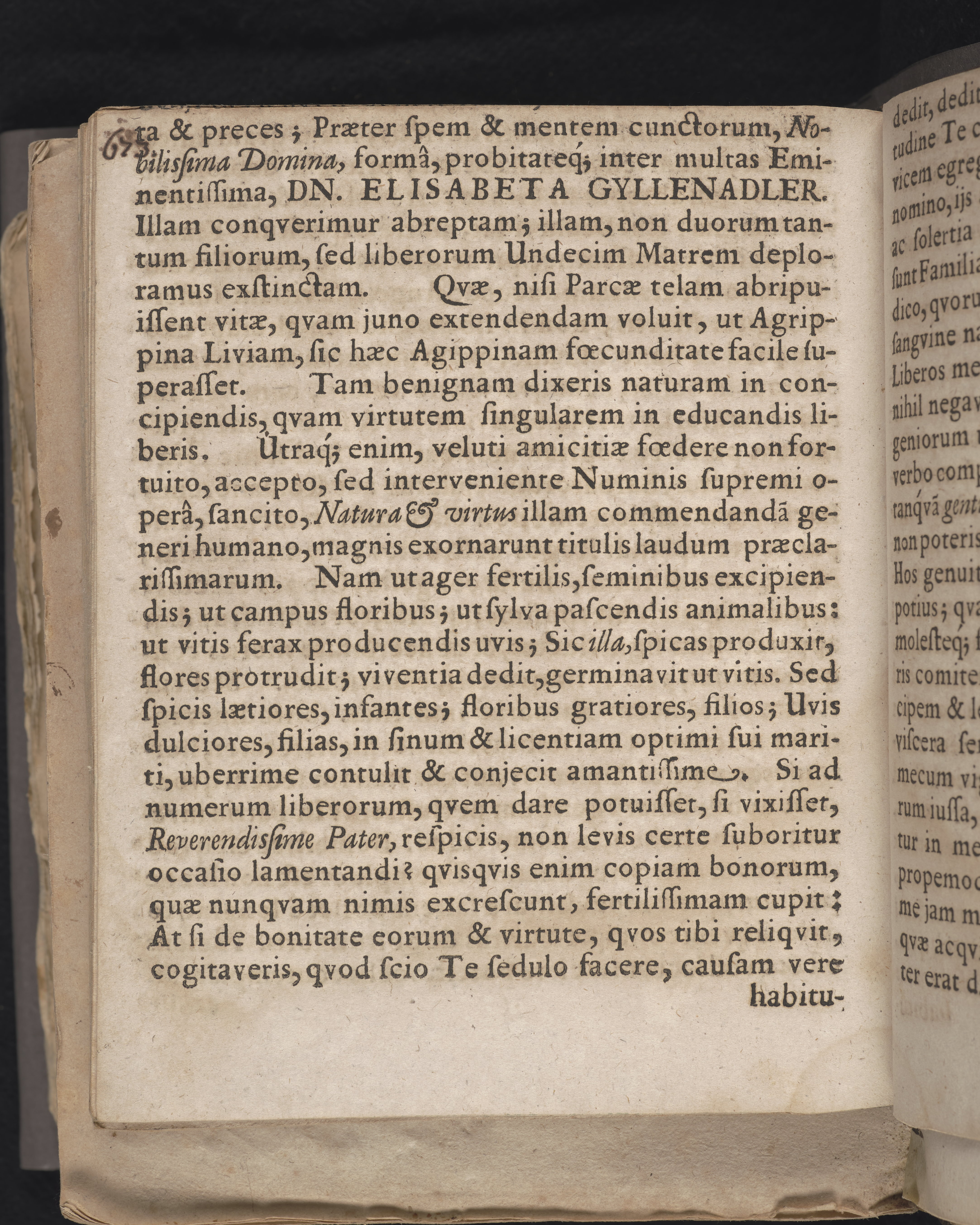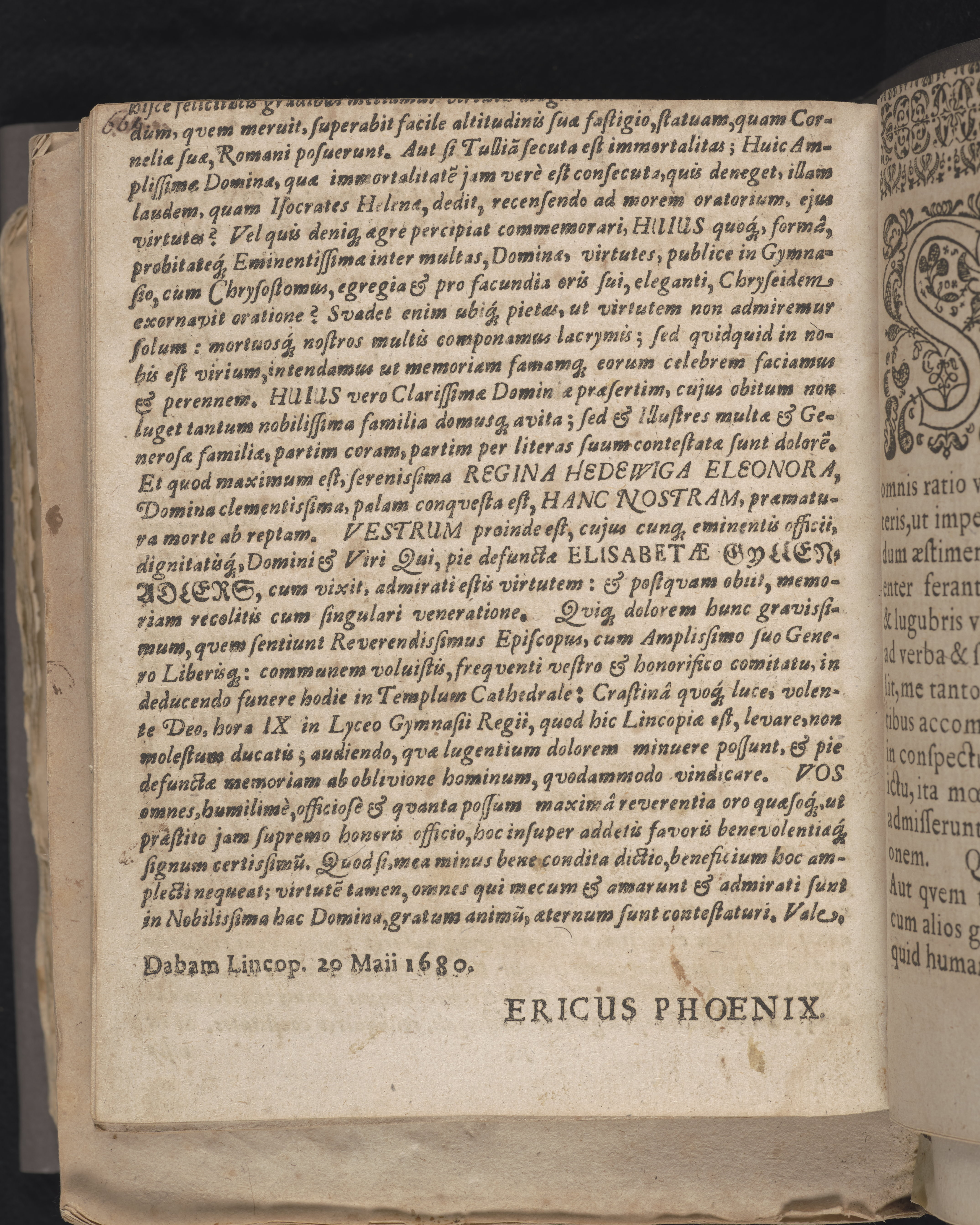 Memoria vitæ & mortis nobilissimæ dominæ Dn. Elisabetæ Gyllenadlers reverendissimi domini Dn. Olavi Swebilii ... uxoris, cum vixit svavissima brevi oratione comprehensa & in Lyceo gymn: Lincop: majoris anno 1680 d. 21. maij proclamata ab Erico Phoenix in gymn: Lincop: eloq: lect. Imprimebat, Lincop. Daniel Kempe.