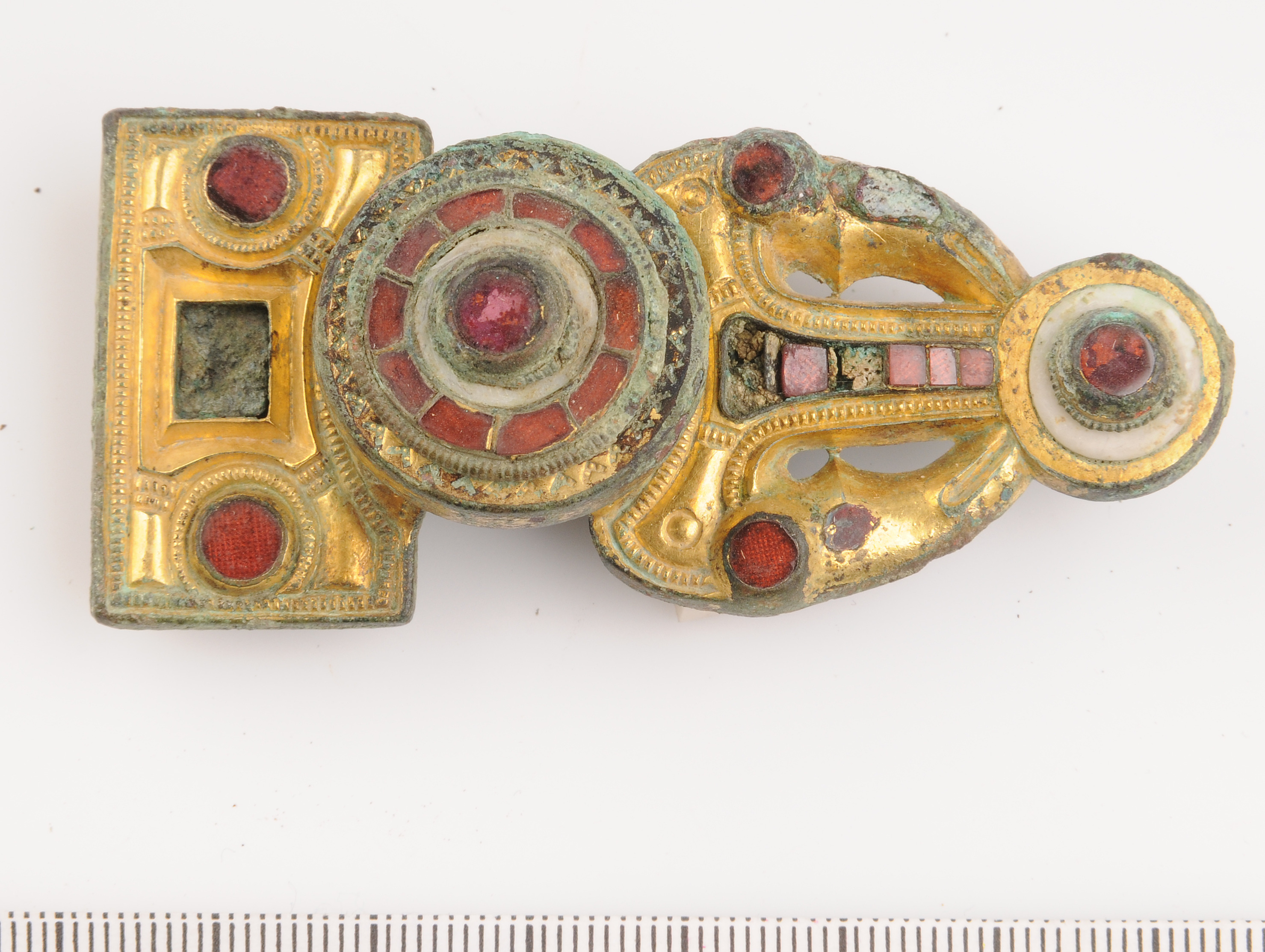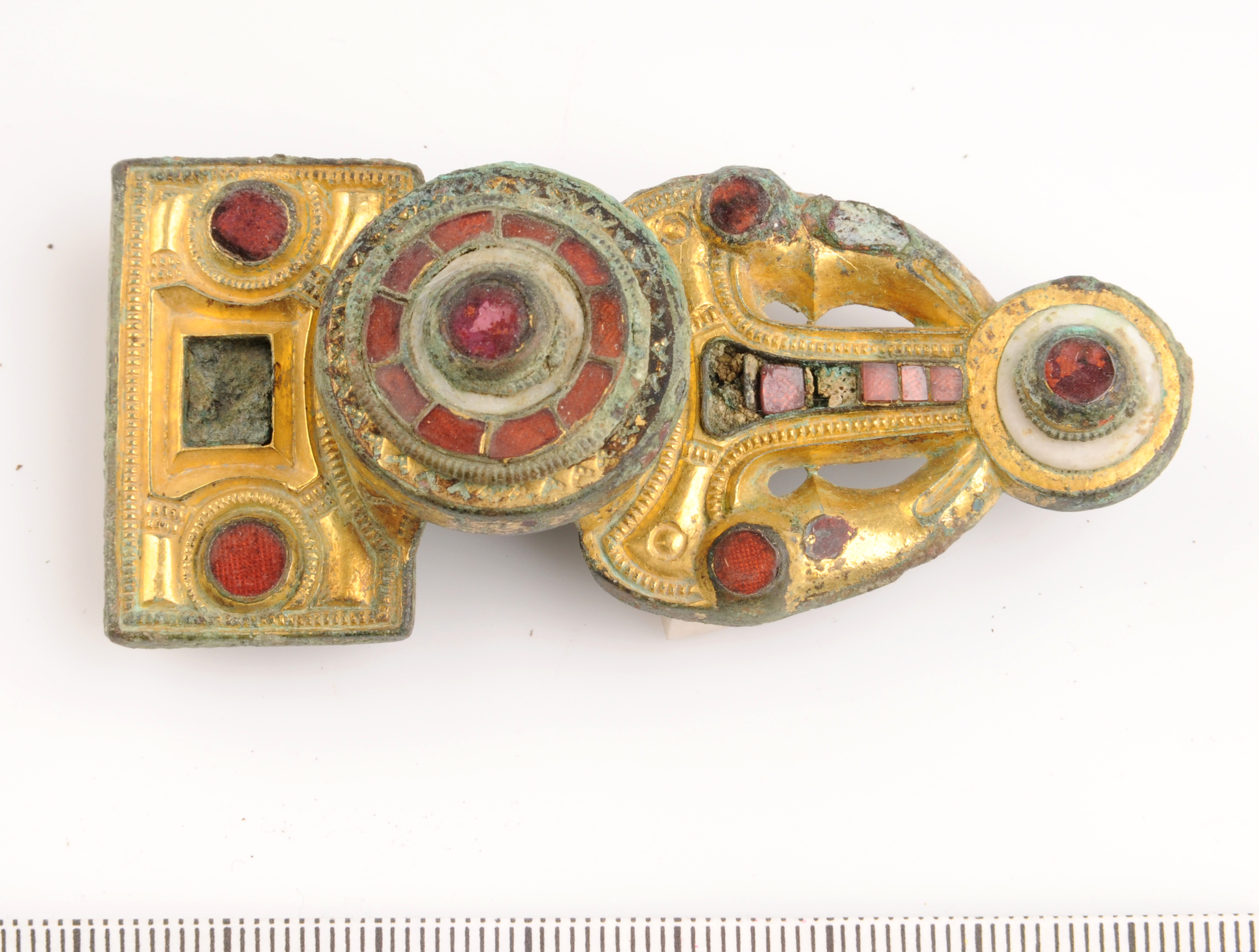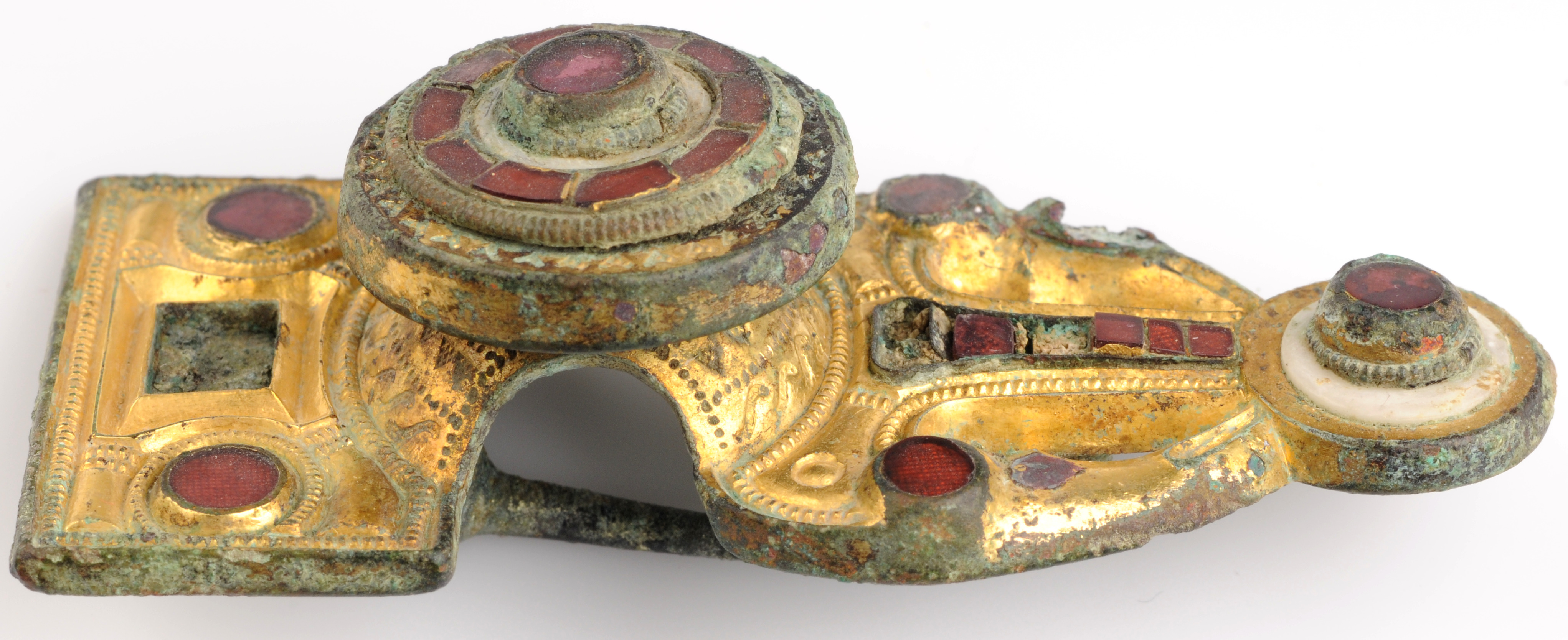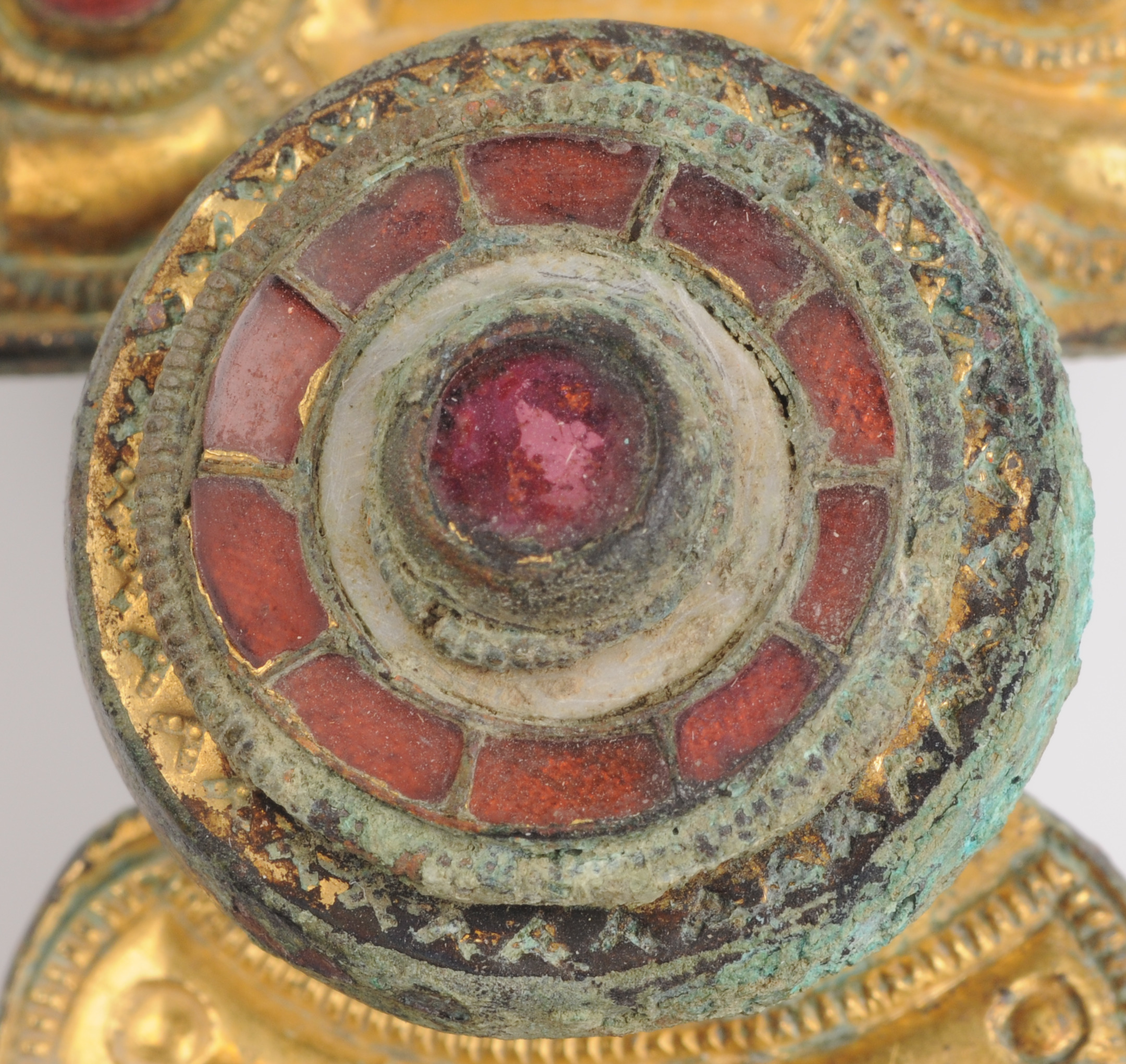 Ryggknappsspänne av cu-leg, förgyllt och med cloisonnéarbete med inlagda granater. Spännet är förgyllt och har inlagda granater.