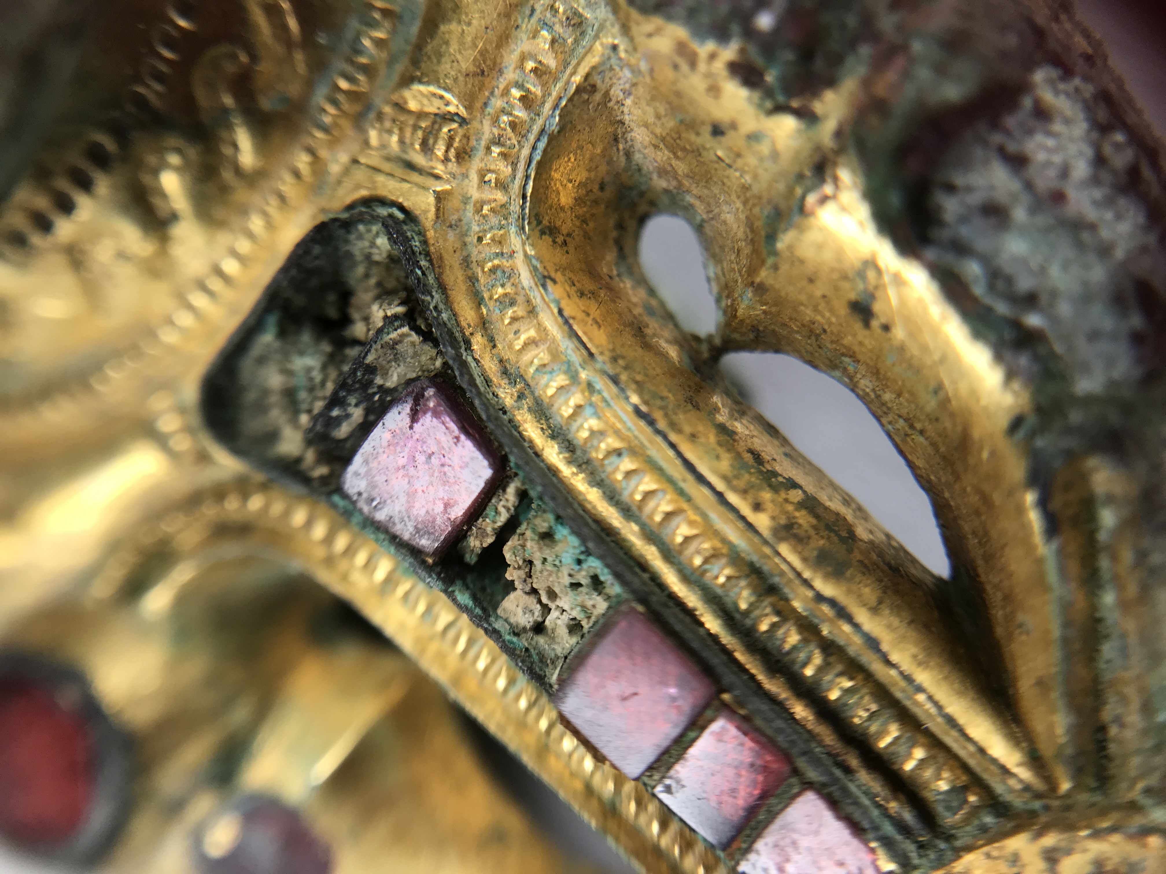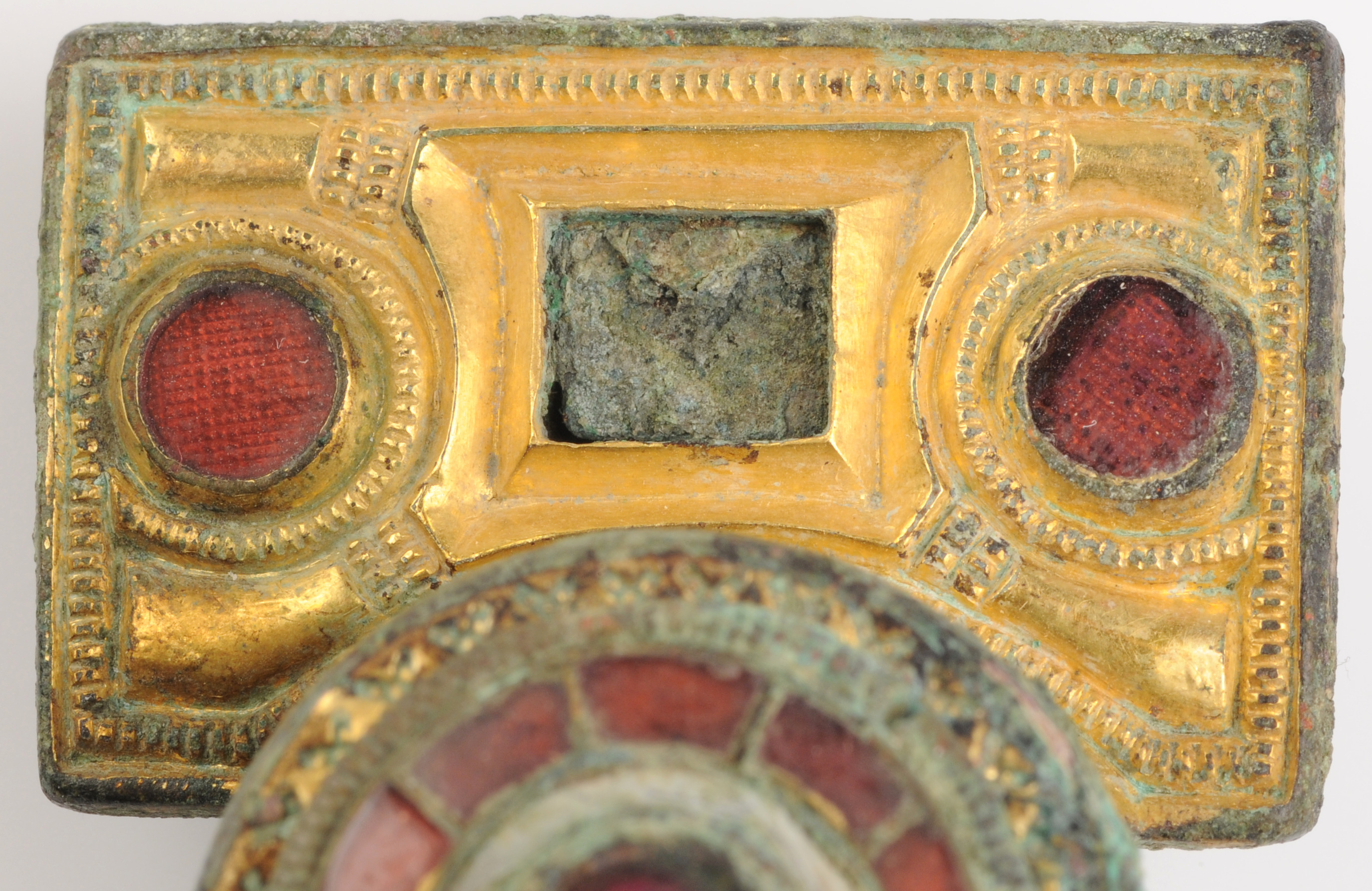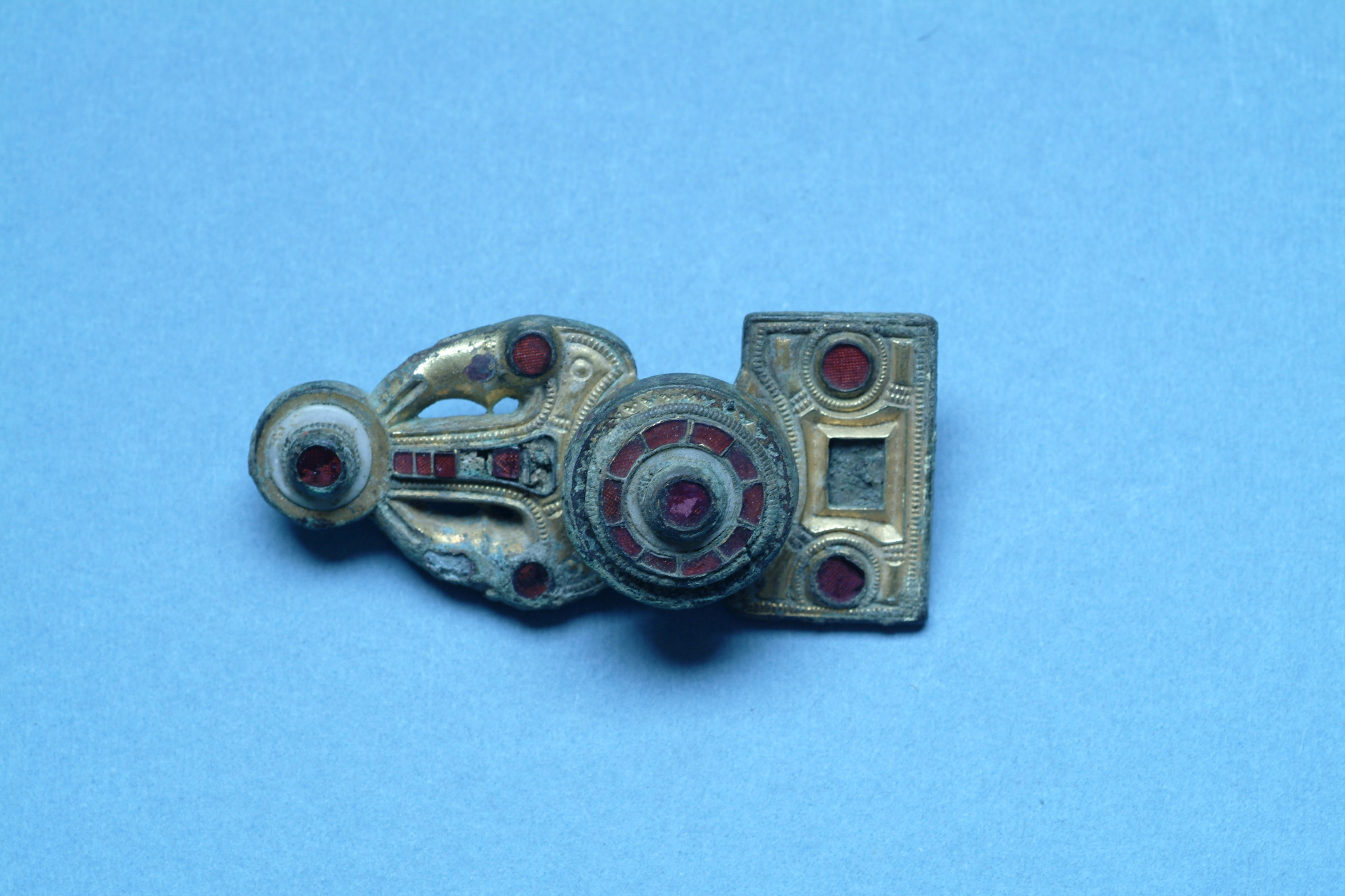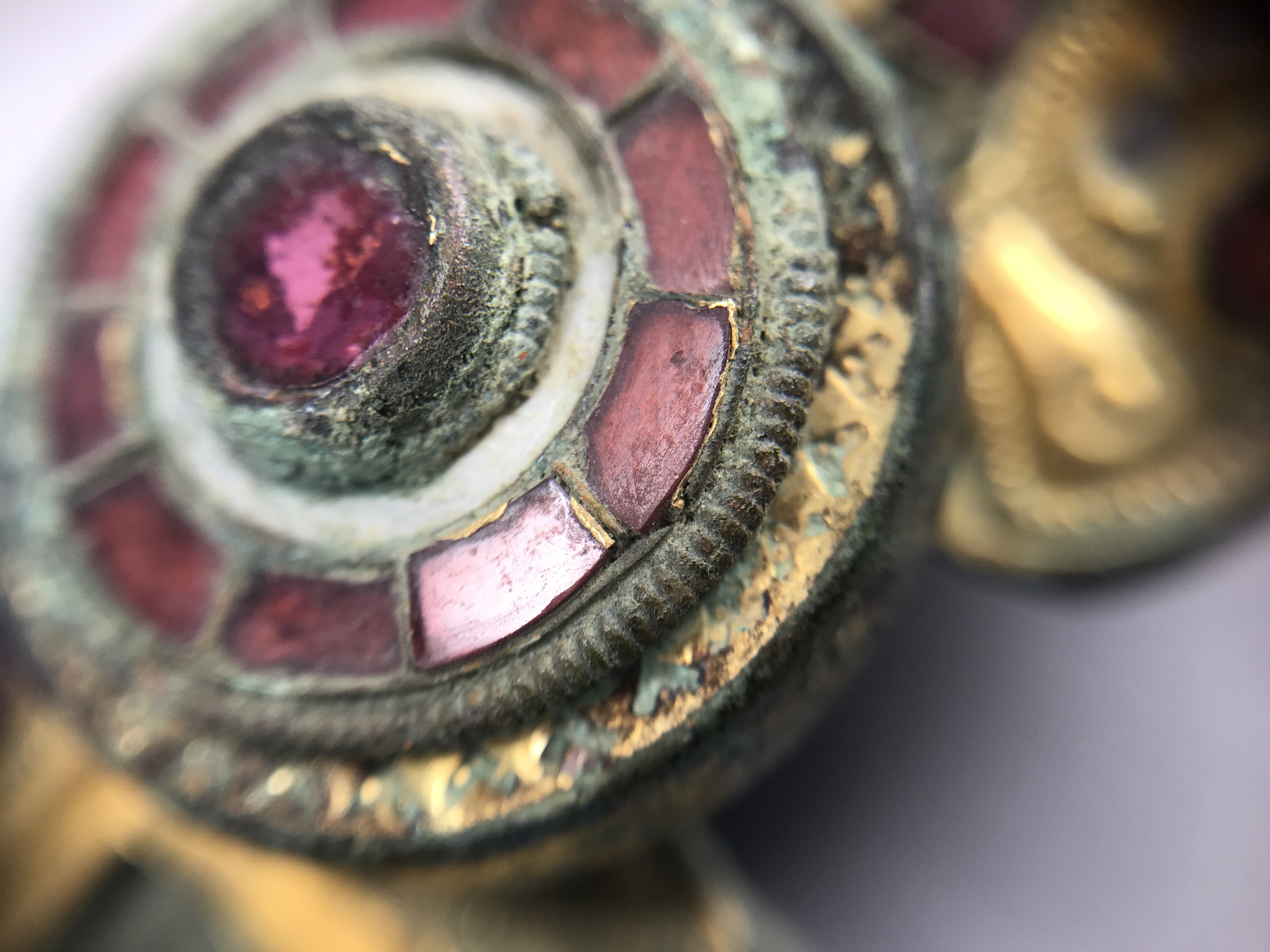 Ryggknappsspänne av cu-leg, förgyllt och med cloisonnéarbete med inlagda granater. Spännet är förgyllt och har inlagda granater.