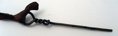 Rensnål av koppartråd (?) med uptill tvinnad ögla. Vid öglan fäst läderband, till kruttyget.