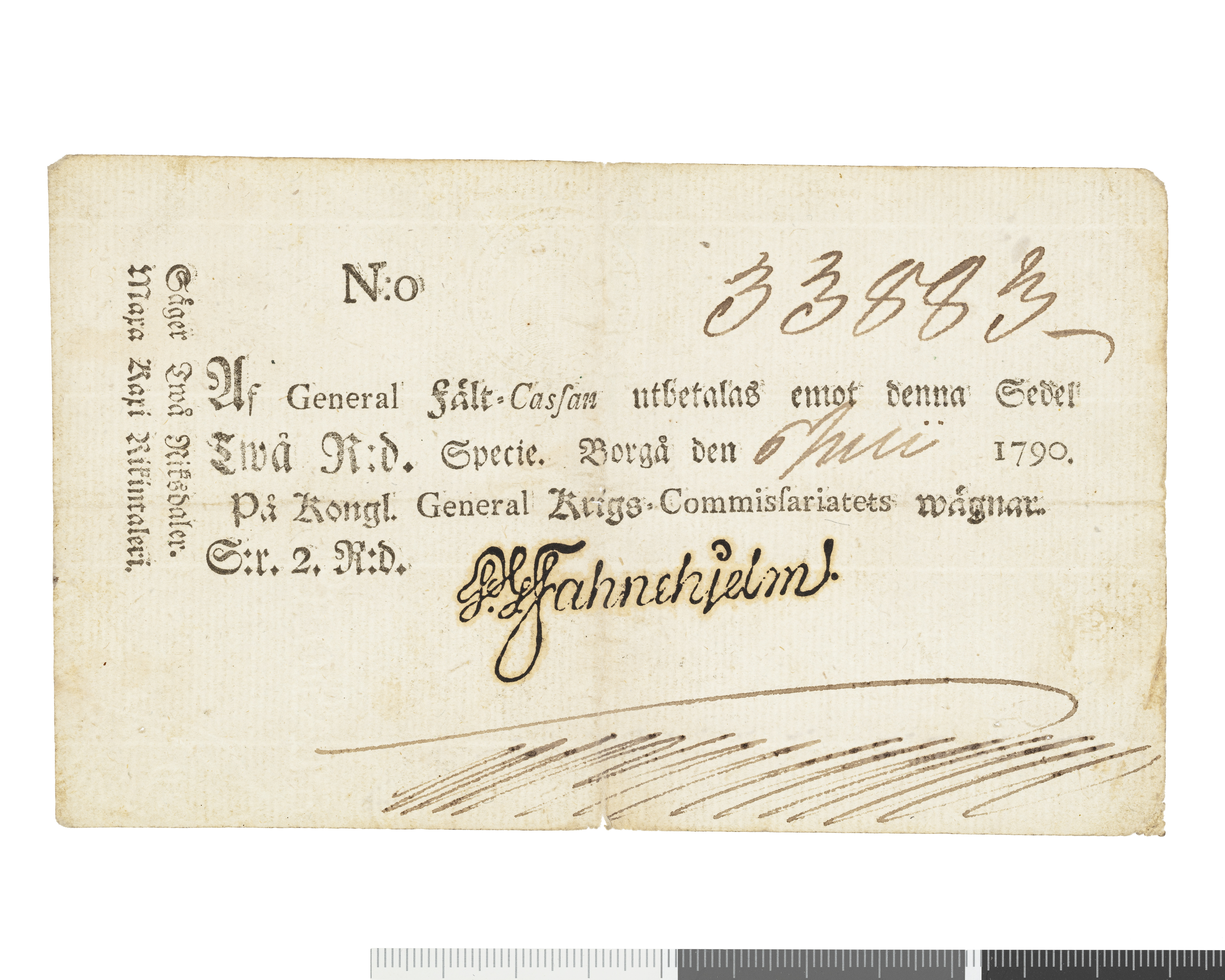 Fahnehielmssedel N:o 33883 - Två riksdaler specie