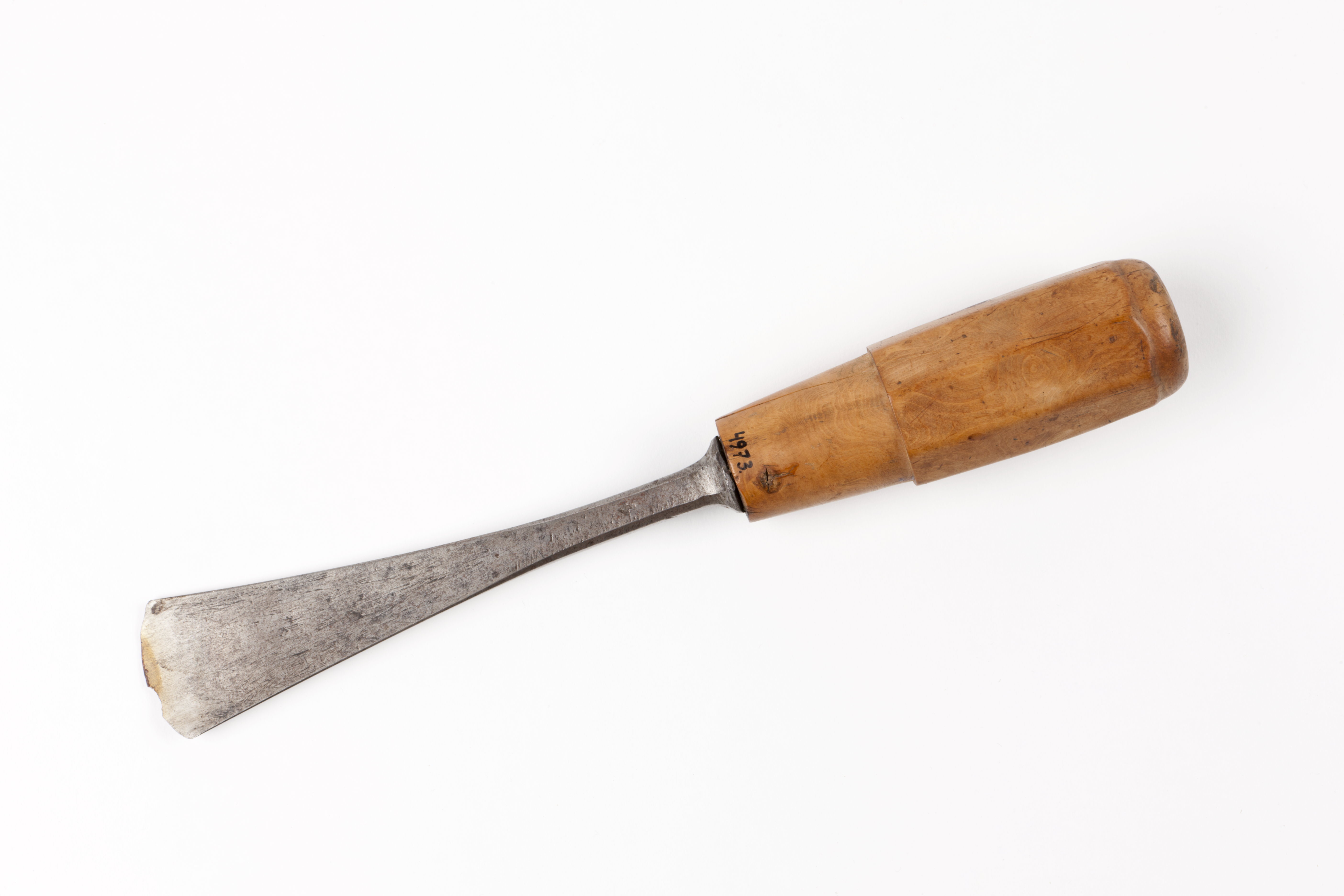 Bildhuggarjärn: svängd skölp. Klinga med rektangulär genomskärning och avfasade kanter. I änden finns en rundad undersida och en svagt hålig ovansida. Rundad egg med en vidgad bas. Skuret, åttasidigt skaft av buxbom. Skaftet har haft en skaftring, troligen av horn. Stämplat på klingan: "4".