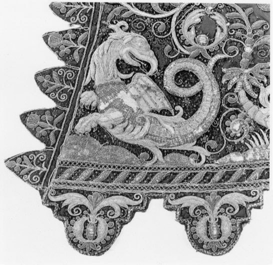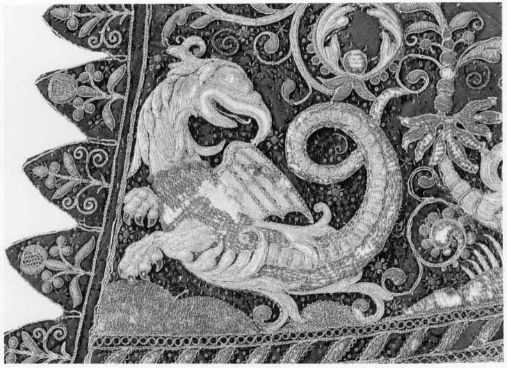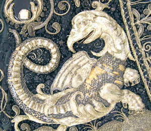 Ett fabeldjur på vardera sida av Vasavapnet. Fabeldjuren liknar en grip vars bakdel mynnar ut i blad och voluter. Samtliga figurer dvs lejon och fabeldjur är ca 200 x 160 mm stora och står som på en liten kulle. De är utförda i relief av silkeskärna överdragen med gulvitt linnetyg.