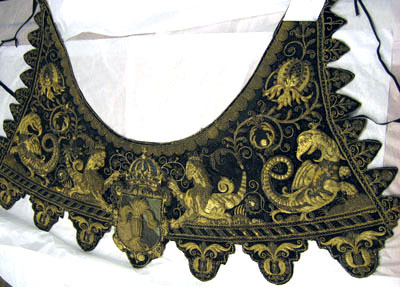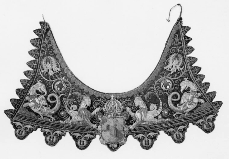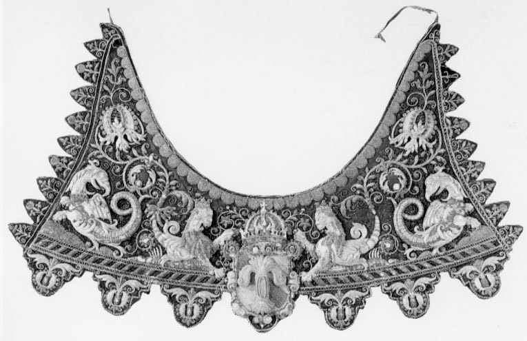 En Halskappa med smala Gull Frantsar omkring och åtta st behåldne Qwastar uppå af Gull och Swart Silcke, på berörde Hallskappa äro på den ena Sidan brodderat ett Upplands Wapn på rödt Atlask, men på den andra sidan ett Leijon Wapen på rödt Atlask, Kronorna(?) på de 2ne af största Leijonen finnes afstötte och förkommne som förre Inwentario Folio 22 förmäler.