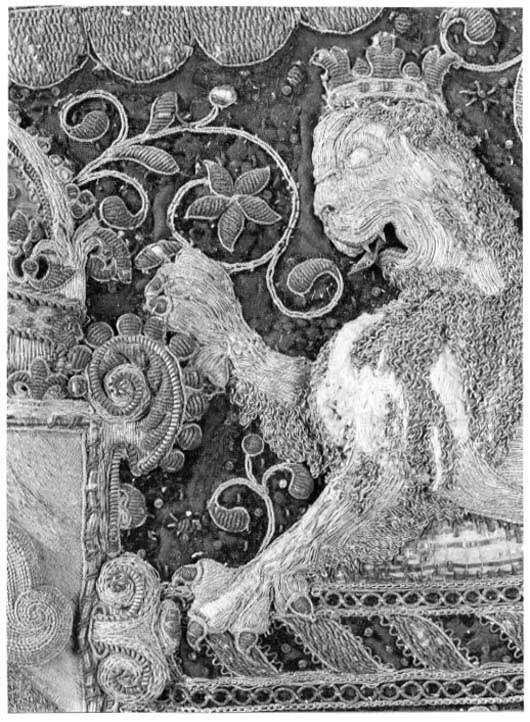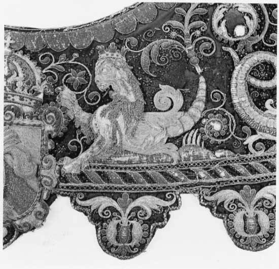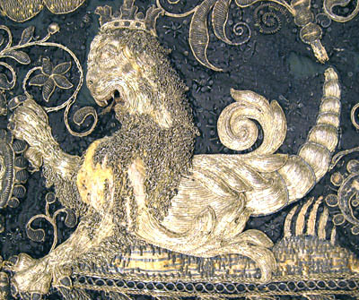 På vardera sida av vapnet ett sköldhållande lejon med en fantasifullt utformad bakdel som mynnar ut i blad och voluter. Lejonen är broderade av guldtråd med man av krusad guldtråd och klor av svart silkestråd samt tunga av blekt röd silkestråd. Lejonens tänder är av valbard.