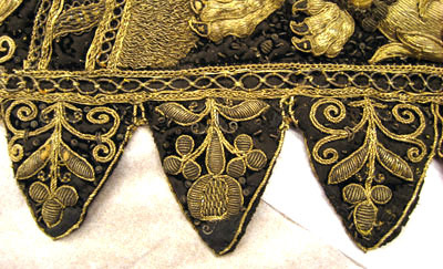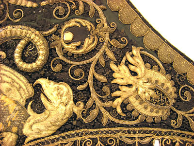 Ett guldbroderi av guldtråd, guldlan, silvertråd och silverlan i läggsöm och i relief på silkeskärna.