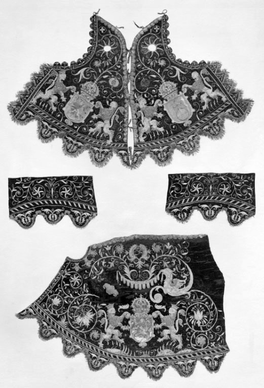 1 st Kostbart Torner (nyttjadt af Konung Gustaf Adolpåh den 2:ra) af swart Samet broderadt bestående af Bring stycke 2 st Halsstycken 2ne benfoder ett dubbelt Ländstycke, ett wapen och en kjortel