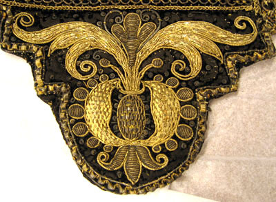 På sidorna löper ett band av silverlan i ett kedjemönster, inramade av ett band med guldtråd broderat till mindre kedjestygn. Flikarna på sidorna har ett broderi av blommor och blad i ett växlande mönster. Flikarna kantas av guldsnöre. I nederkanten ett broderat band i två rader i ett kedjemönster och däremellan ifyllda spolformade blad. På vardera flik i nederkanten är broderat ett stiliserat granatäpple och kärnor samt med yviga blad upptill. Flikarna kantas av guldlan lagt i ett veckat mönster.