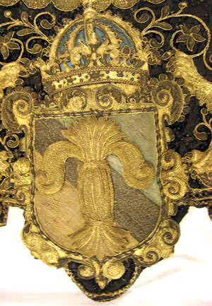 Ett Stort Stycke äfwer Hästländerne på ena sidan broderadt Ett Sweriges Wapen af Tre Kronor ochpå andra Sidan Ett Dito Rikes Wapen af Lejon på blått Atlast och med Guldfrantsar runt omking samma Täcke; Härå finnes allenast Elfva stycken Qvastar af Guld och svart Silke behållne, de Trenne stycken Qvastar som felar, finnes efter förra Inventarii innehåll vara förkomne.