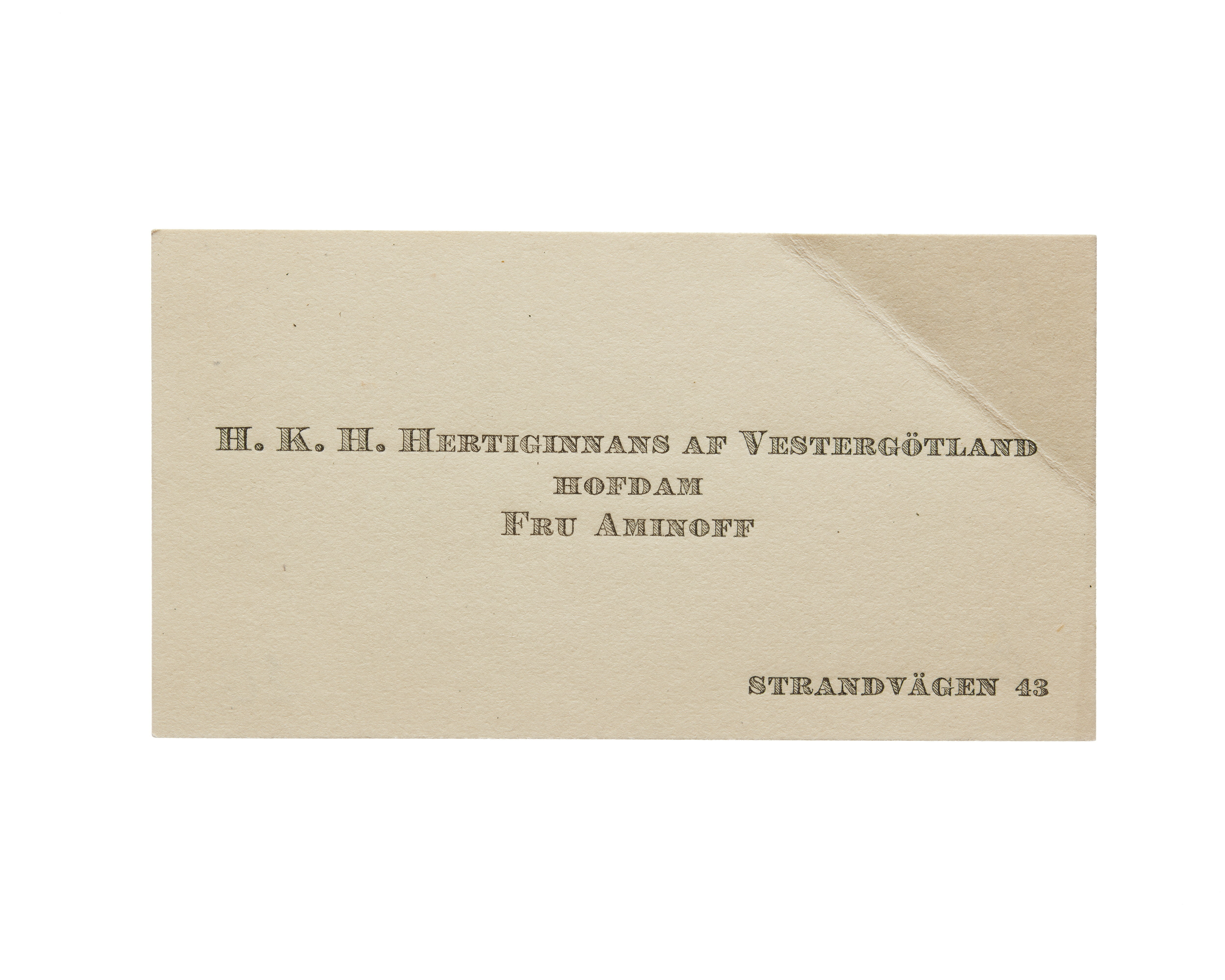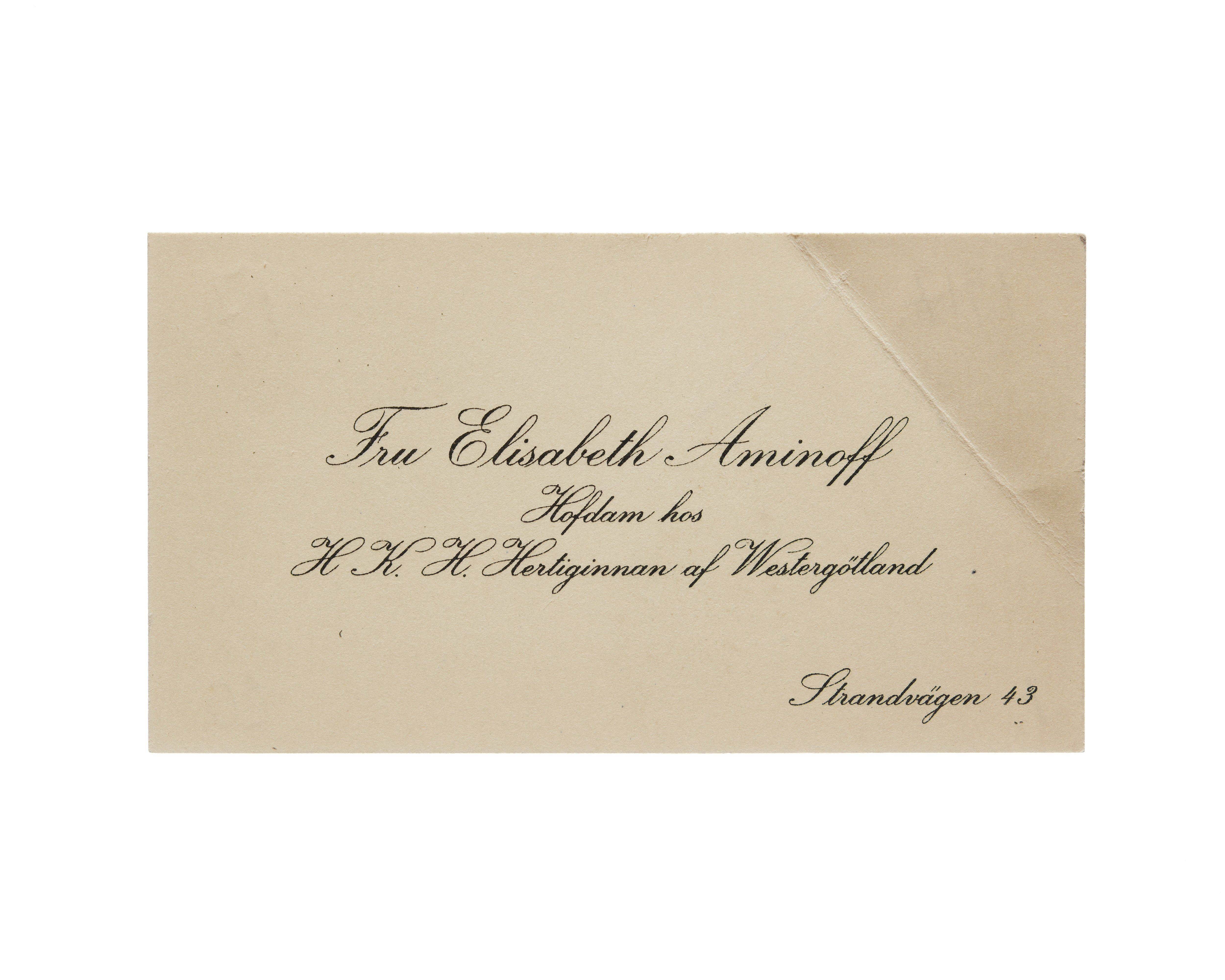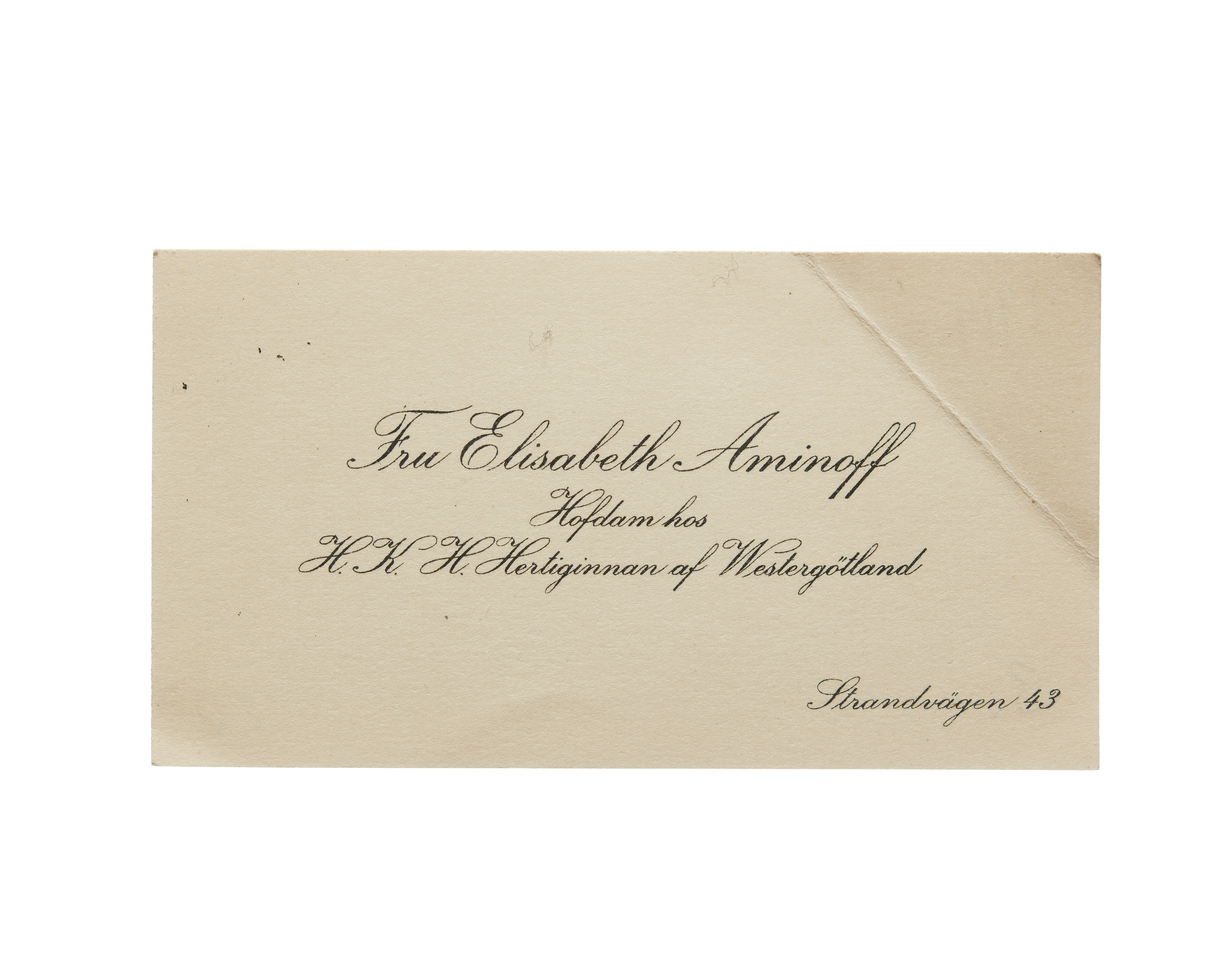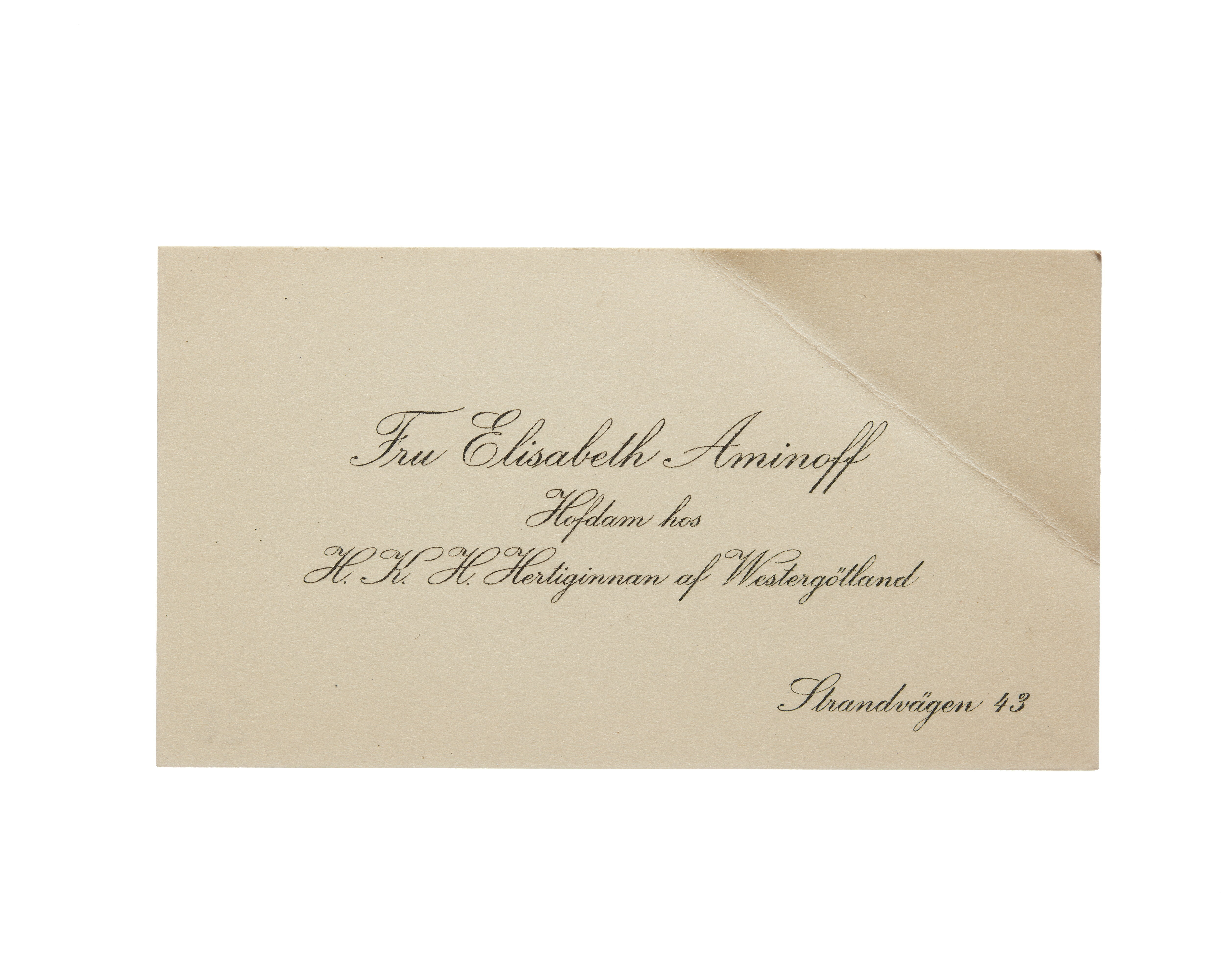 Tolv visitkort från Elisabeth Aminoff född af Edholm, hovdam hos H. K. H. Hertiginnan av Westergötland. Första kortet daterat1917, adress (nedre högra hörnet) Strandvägen 43, vikt i övre högra hörnet. Andra kortet är utan datum, vikt i övre högra hörnet. Tredje kortet daterat 1919, vikt i övre högra hörnet. Fjärde kortet daterat 1922. Femte kortet daterat 1922, vikt i nedre vänstra hörnet. Sjätte kortet daterat 1923, vikt i övre högra hörnet. Sjunde kortet daterat 1924, vikt i övre högra hörnet. Åttonde kortet daterat 1925, vikt i övre högra hörnet. Nionde kortet daterat 1925, vikt i övre högra hörnet. Tionde kortet daterat 1927, vikt i övre högra hörnet. Elfte kortet är utan datum, vikt i nedre vänstra hörnet. Tolfte kortet daterat 1930, vikt i övre högra hörnet.