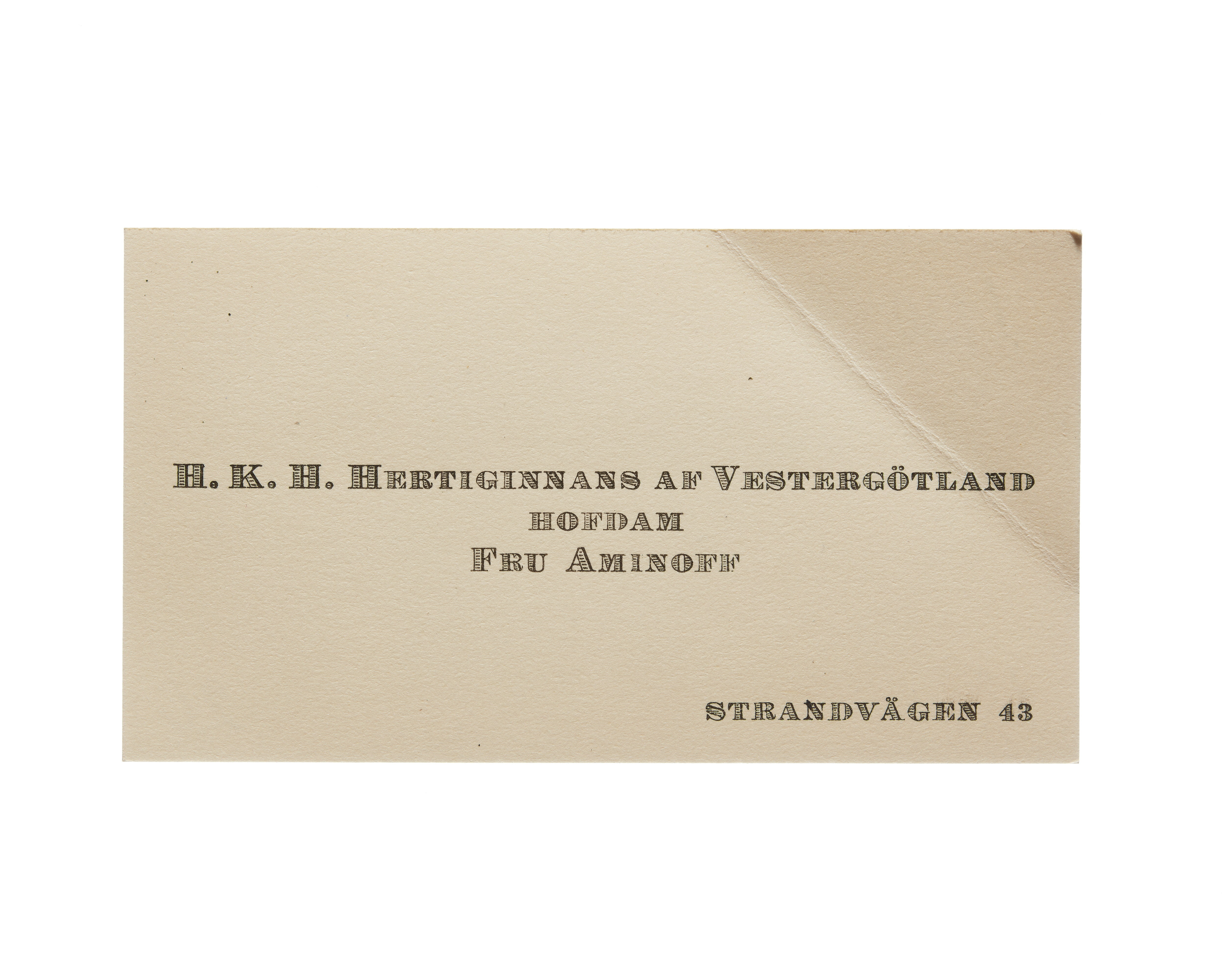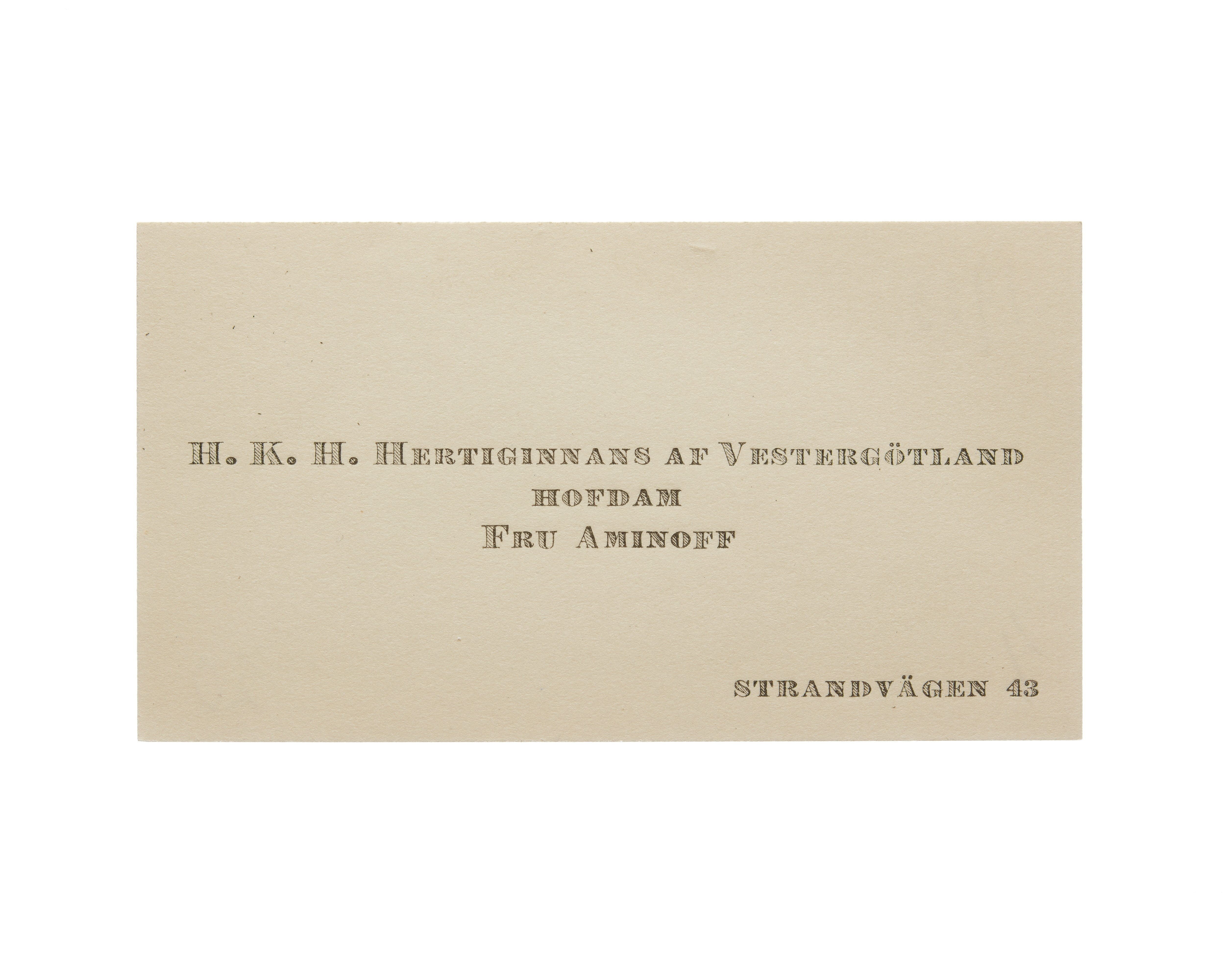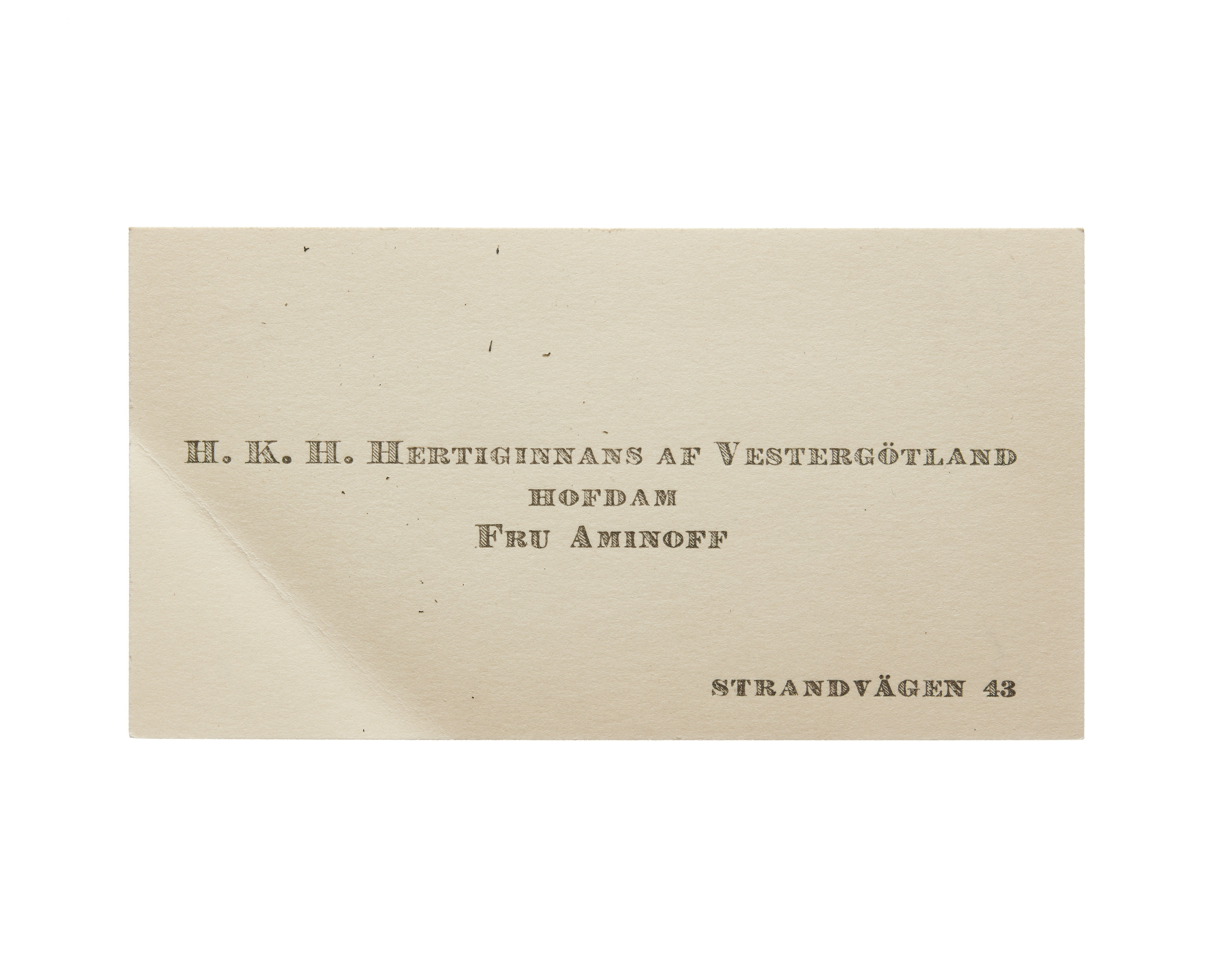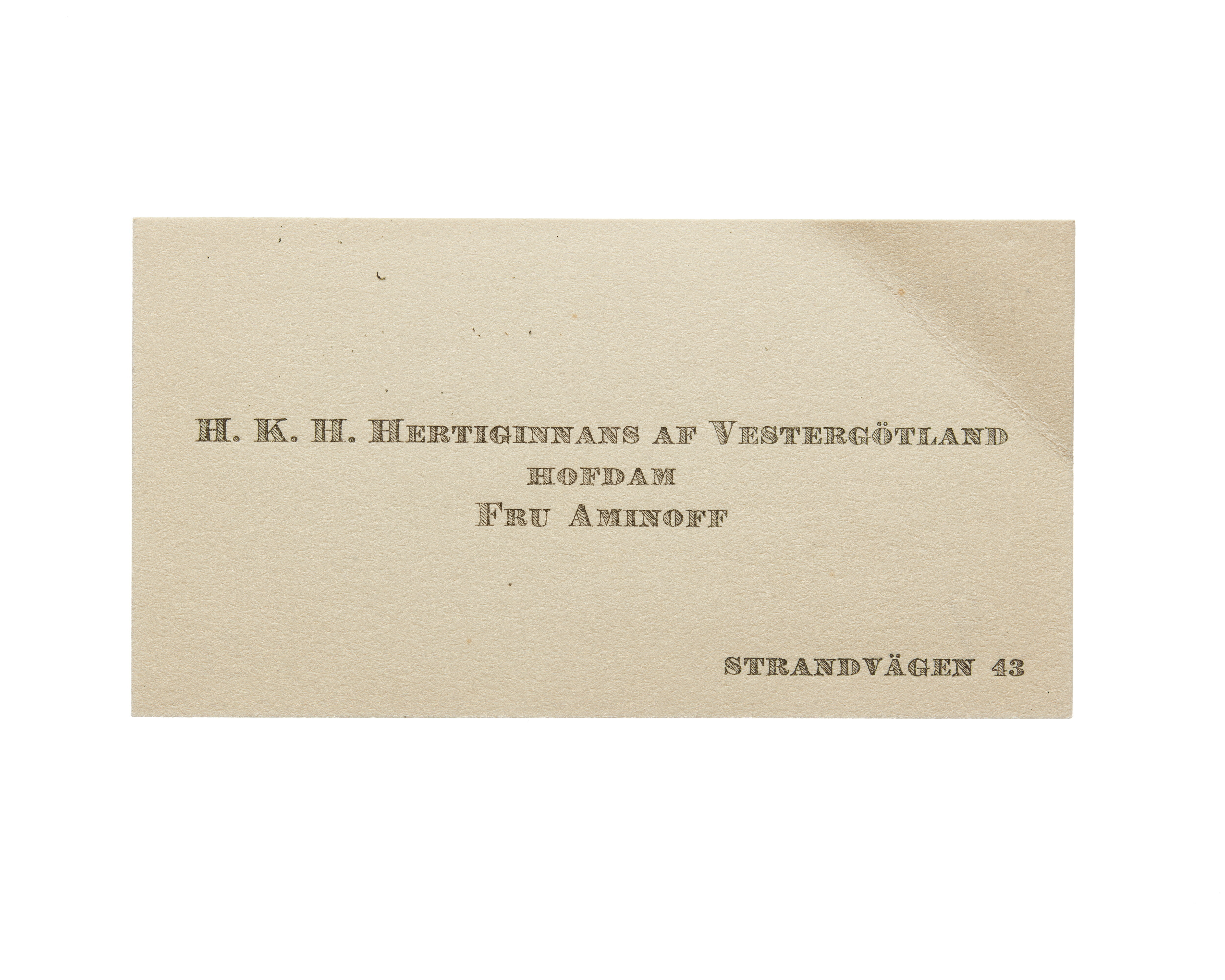 Tolv visitkort från Elisabeth Aminoff född af Edholm, hovdam hos H. K. H. Hertiginnan av Westergötland. Första kortet daterat1917, adress (nedre högra hörnet) Strandvägen 43, vikt i övre högra hörnet. Andra kortet är utan datum, vikt i övre högra hörnet. Tredje kortet daterat 1919, vikt i övre högra hörnet. Fjärde kortet daterat 1922. Femte kortet daterat 1922, vikt i nedre vänstra hörnet. Sjätte kortet daterat 1923, vikt i övre högra hörnet. Sjunde kortet daterat 1924, vikt i övre högra hörnet. Åttonde kortet daterat 1925, vikt i övre högra hörnet. Nionde kortet daterat 1925, vikt i övre högra hörnet. Tionde kortet daterat 1927, vikt i övre högra hörnet. Elfte kortet är utan datum, vikt i nedre vänstra hörnet. Tolfte kortet daterat 1930, vikt i övre högra hörnet.