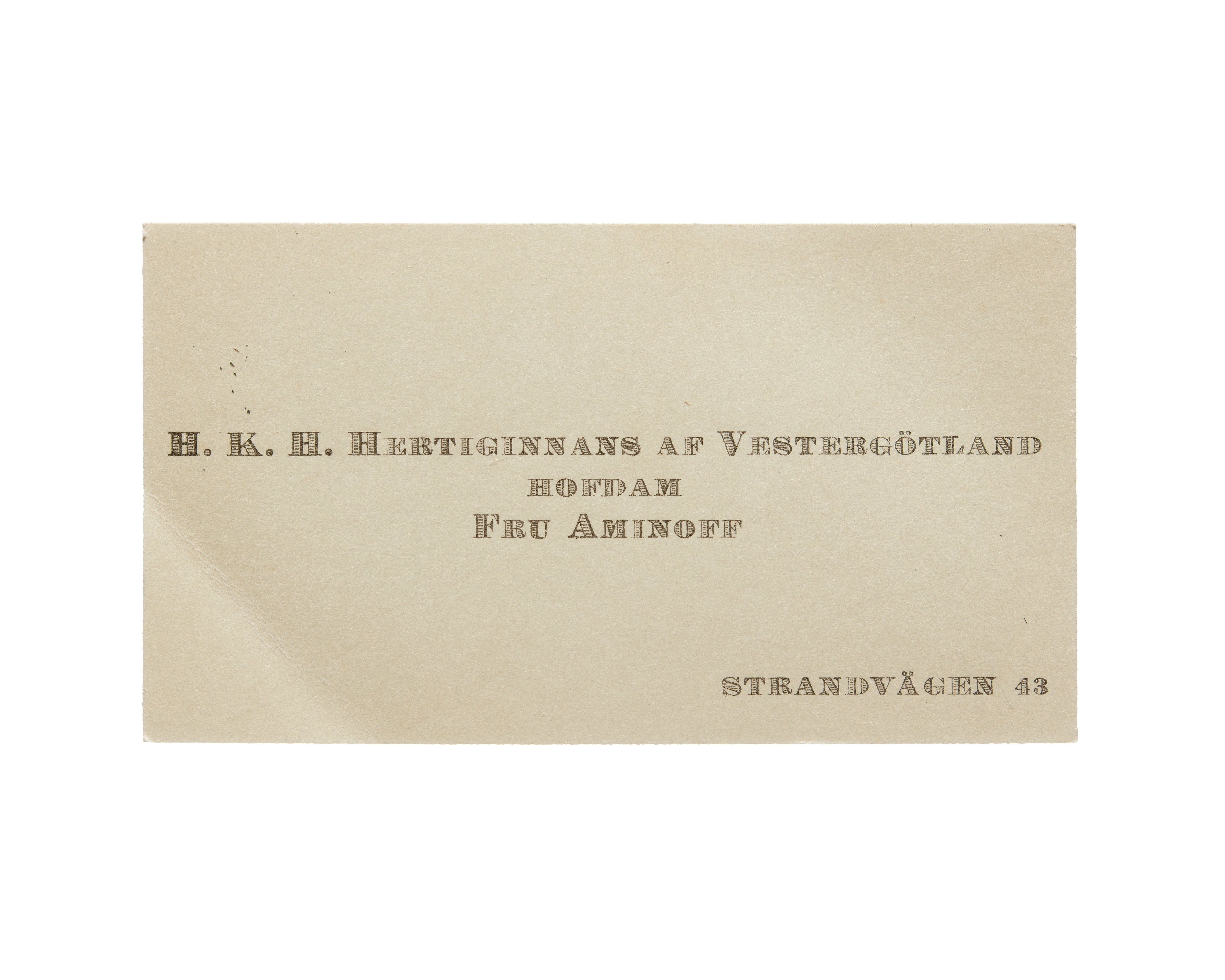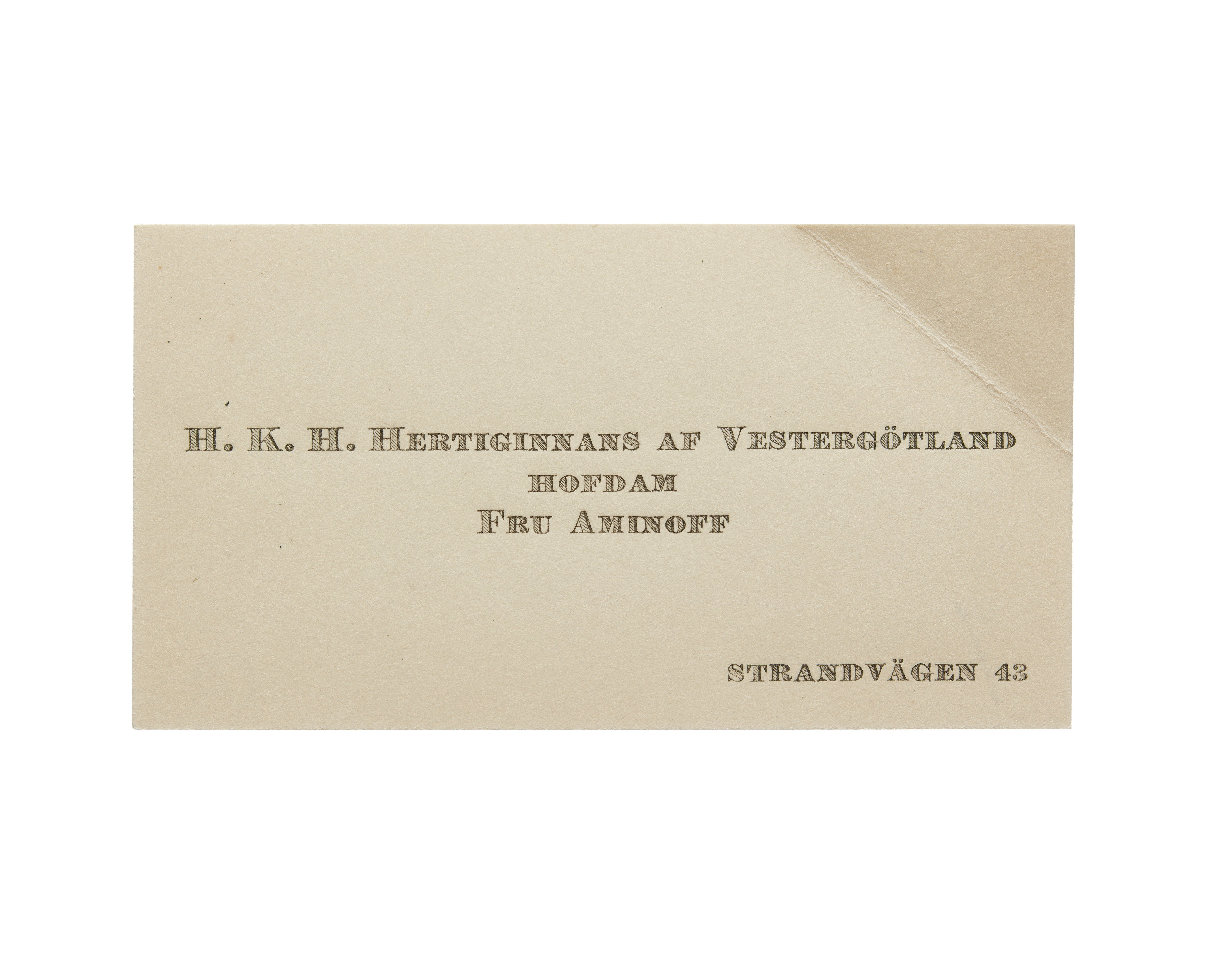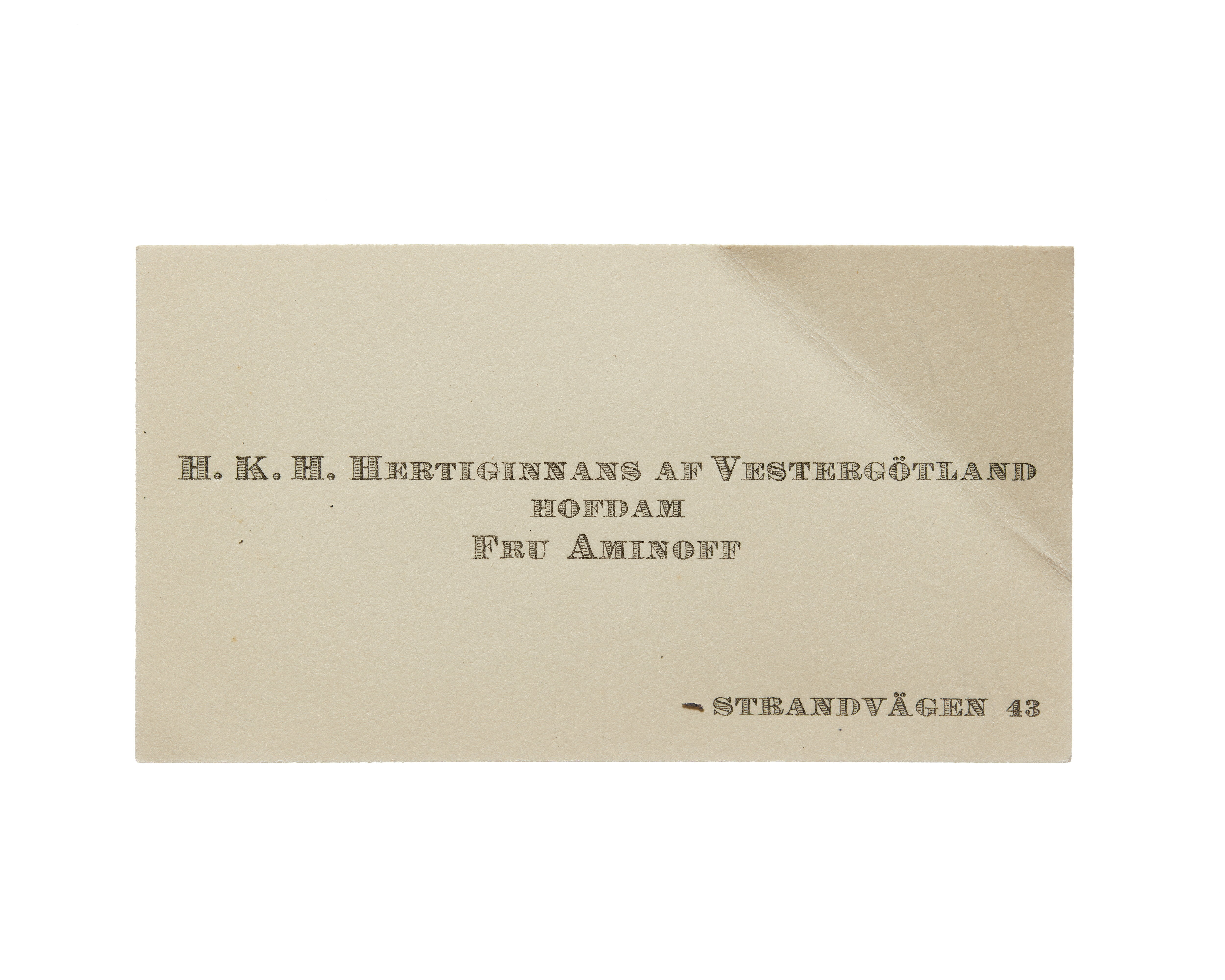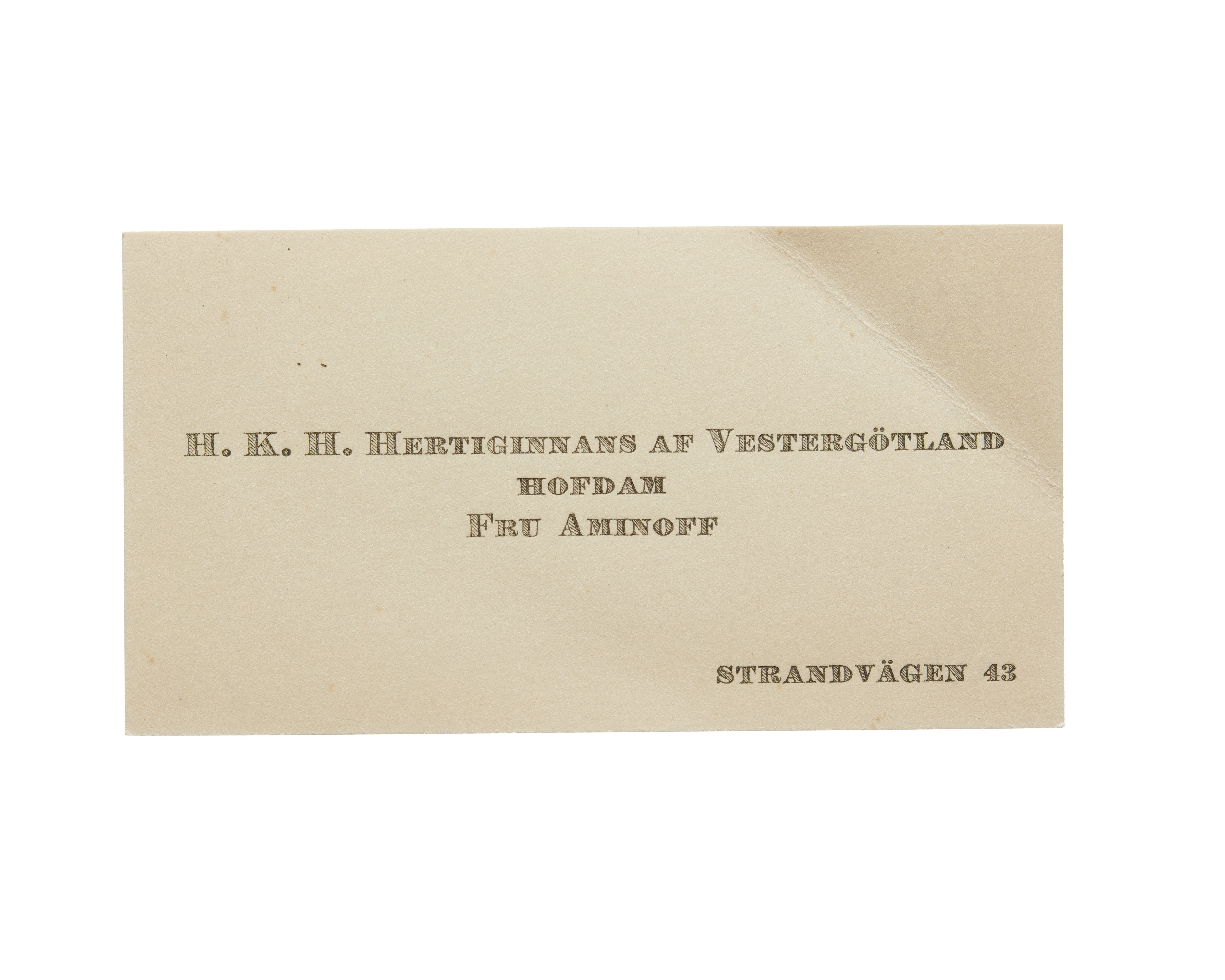Tolv visitkort från Elisabeth Aminoff född af Edholm, hovdam hos H. K. H. Hertiginnan av Westergötland. Första kortet daterat1917, adress (nedre högra hörnet) Strandvägen 43, vikt i övre högra hörnet. Andra kortet är utan datum, vikt i övre högra hörnet. Tredje kortet daterat 1919, vikt i övre högra hörnet. Fjärde kortet daterat 1922. Femte kortet daterat 1922, vikt i nedre vänstra hörnet. Sjätte kortet daterat 1923, vikt i övre högra hörnet. Sjunde kortet daterat 1924, vikt i övre högra hörnet. Åttonde kortet daterat 1925, vikt i övre högra hörnet. Nionde kortet daterat 1925, vikt i övre högra hörnet. Tionde kortet daterat 1927, vikt i övre högra hörnet. Elfte kortet är utan datum, vikt i nedre vänstra hörnet. Tolfte kortet daterat 1930, vikt i övre högra hörnet.
