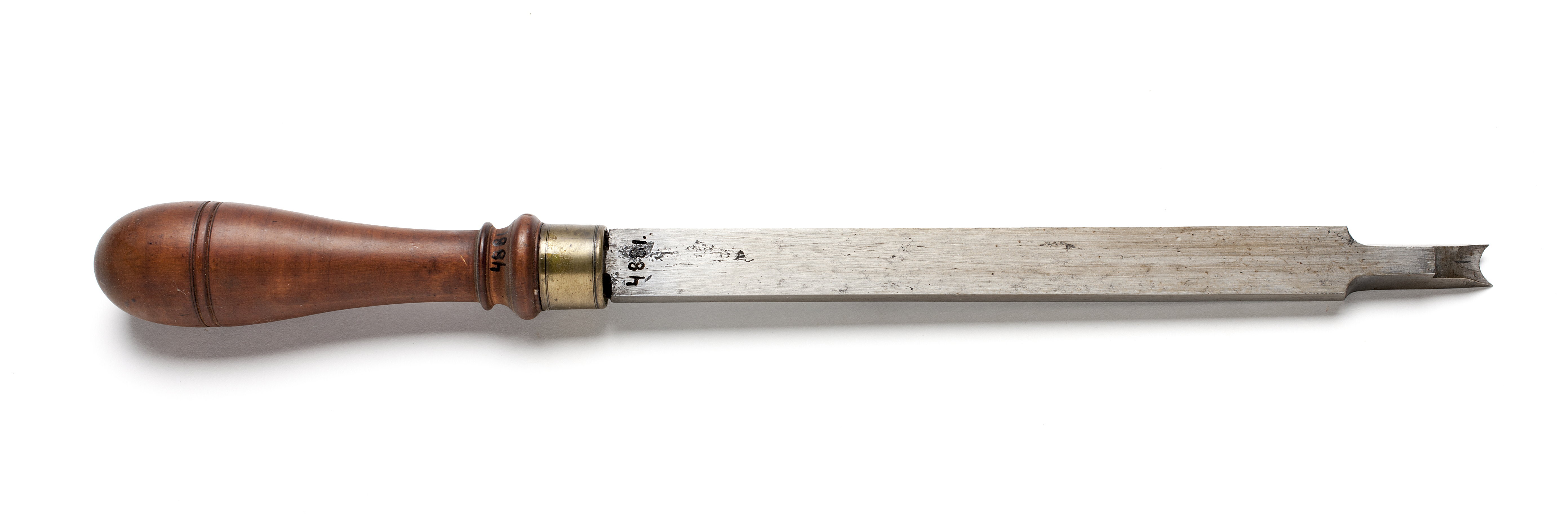 Klinga med rektangulär genomskärning, avsmalnande i änden via en konkavitet på vardera sidan. Konkav egg. Svarvat skaft av päronträ med två vulster nedtill ("skoklostertyp"). Mässingsring. Stämpel på skaftets ände vid fästet: fyra punkter.