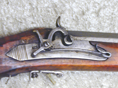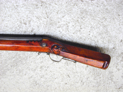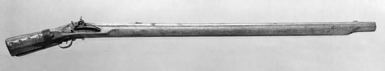 Åttsidig pipa av stål med åtta räfflor, på undersidan slagmärken från smidet. Rektangulärt, nedåtböjt svansskruvblad med två små skruvhål. Kammarens ovansida ornerad med ett punsat sicksackmönster. Mellan sikte och korn en igenfylld laxning. På kammarens h. sida en snäcka med plunderskruv, skruvhuvud i form av en oval platta med ett runt hål. Cylindrisk kagge med plunderskruv med platt huvud på utsidan. Riktmedel: Inlaxat ståndsikte med v-skåra, bredare än pipans ovansida. Inlaxat stolpkorn av mässing. Fästning: Ett häfte intakt, ett nedfilat och ett bortfallet. Pipan fäst med krysskruv underifrån (varbygelns skruv) och ett pipstift bestående av en modern trådspik. Slagsnapplås, hälspännare med plant låsbleck, rundat framtill, urtag för snäckan, spetsigt baktill med tvärräffling. S-formig, platt hane med harmynt slaghuvud, tumgrepp och långt utdragen hanfot med lagningar av stål och mässing. Utvändig slagfjäder, bakåt-uppåtböjd framtill samt uppböjd bakom hanen. Studeln bandformig med baktill en fastsmidd skruv för fäste i låsblecket. Fästning: En låsskruv. Bred, rak, bockad avtryckare. Helstock av ljust, rödbetsat trä med rak kolv med liggande ovalt tvärsnitt, plant kindstöd och kolvlåda. Över kolvlådelocket går ett i stocken fastspikat läderband. Locket dekorerat med fyra tvärställda nedskärningar. Lockets insida har en fastspikad läderbit som tätning på kortsidan och en låsfjäder. Locket är lagat med trälister. Kolvlådan är indelad i två olikstora fack. På kindstödet två inskuren voluter. Sluten laddstocksränna med insågat, längsgående dräneringshål. Hål för endast ett pipstift. Skålformig, bred varbygel av stål, skruv med kulformigt huvud genom främre armen, som avslutas med en upprullad spets. Bakre armen skålad, tvärstrecksornering, fäst under en märla mot en spik med omböjt huvud.