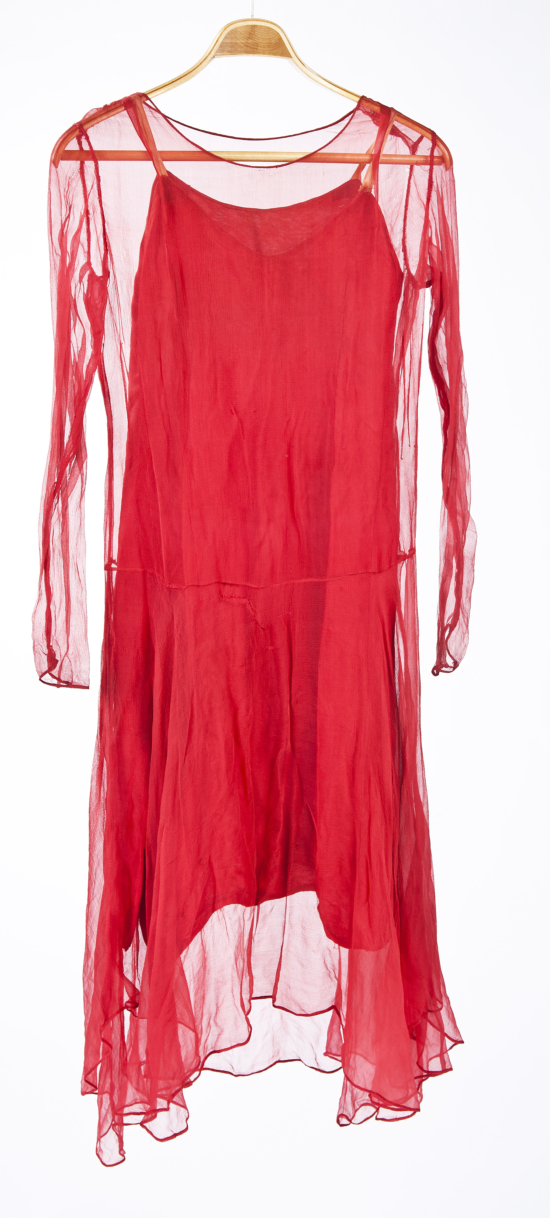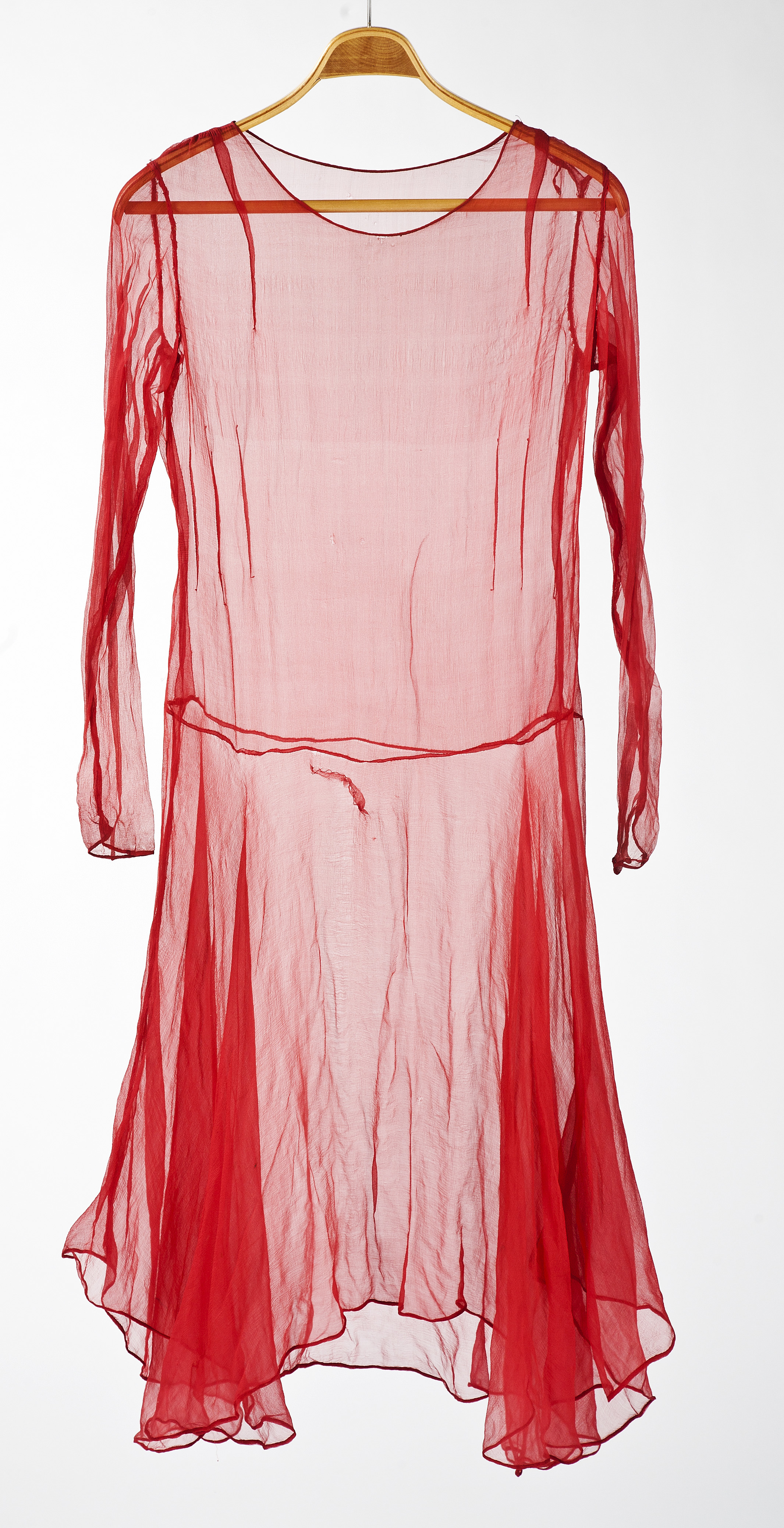 Tunn långärmad klänning i röd chiffong. Rund i halsen med ganska rakt liv och låg midja. Avtagen i midjan med en kjoldel som har sömmar i sidorna där vardera våd är skuren som en halvcirkel. Detta gör den vid och klockande med intrycket av att vara kortare mitt fram, mitt bak och i sidorna och längre där emellan. Ärmen är hellång och smal med en sneddad avslutning vid handleden. I intervju med Linde von Rosen berättade hon den 15 september 1997 att hon lät sy klänningen i Rom 1928 hos en sömmerska eller ateljé som hette Olympia. Linde berättar vidare att hon inte var mycket för fina tillställningar. Men att hon var tvungen att ha en festklänning för finare tillställningar. Bäst trivdes hon på landsvägarna där alla luffare mm var besläktade med varandra "vi landsvägsstrykare höll ihop". Klänningen låg i den vänstra bakpacksfickan samhörande med saden 32589. Den skänktes av Linde von Rosen till Livrustkammaren i april 1997. Användes av henne då hon som ung red genom Europa och ibland behövde klä om till fest. Tog lite plats i bagaget. Se vidare sadeln.
