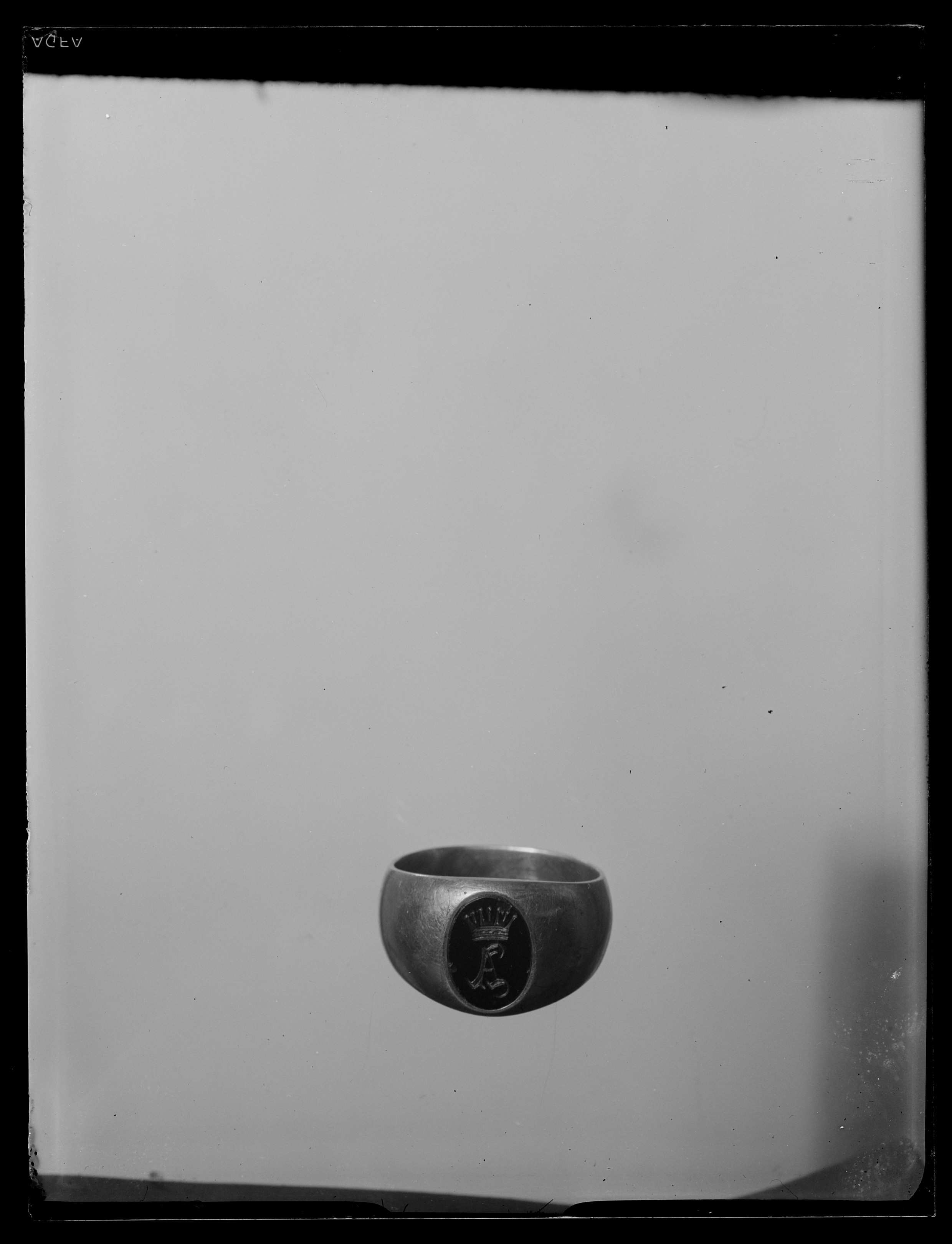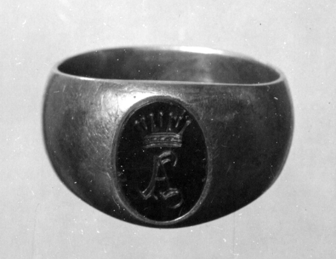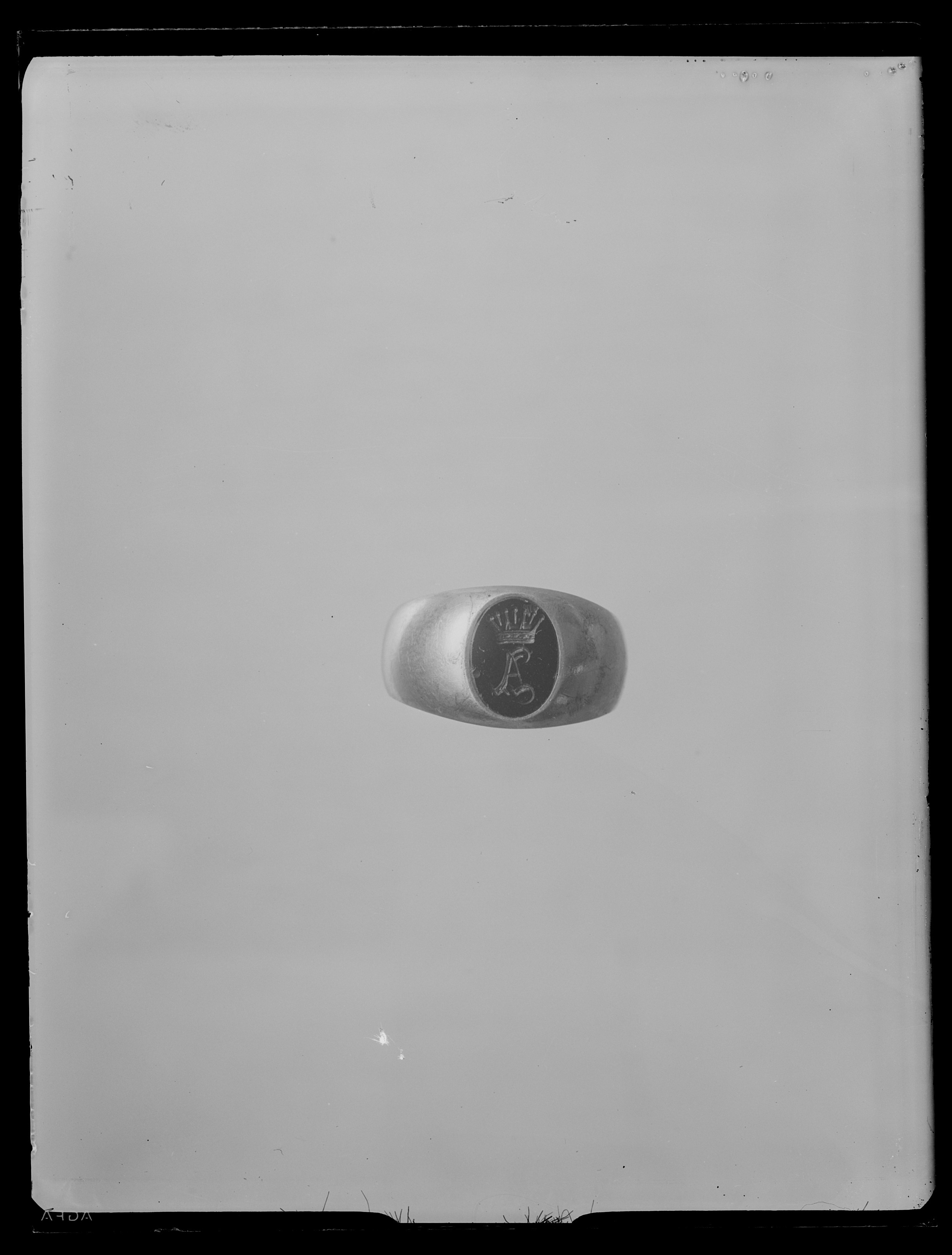 Bred, tunn guldring, upptill utvidgad och förtjockad, däri infattat oval onyx med graverat namnchiffer, fraktur-A krönt av hertigkrona, kistfattning. På ringens insida stämplat: 18 K, tre kronor, CFC, S:t Erik, R 5 (C F Carlman, Stockholm 1871).