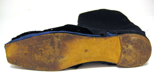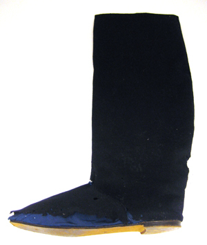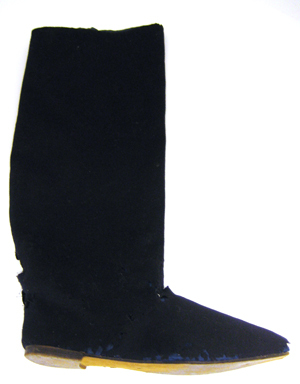 Höger stövel av snäv modell med rak tå och ett högt, rakt och brett skaft. Stöveln är av mörkblått kläde. Sulan är lång och smal, av brunt pressat skinn med en låg bred klack. Under sulan förekommer två tillverkningshål. Innersulan är av vitt pressat skinn. På insidan är fodrat med mellanblått sidenrips. Uppe vid stövelskaftet sitter två dubbelvikta hällor av samma tyg som fodret.