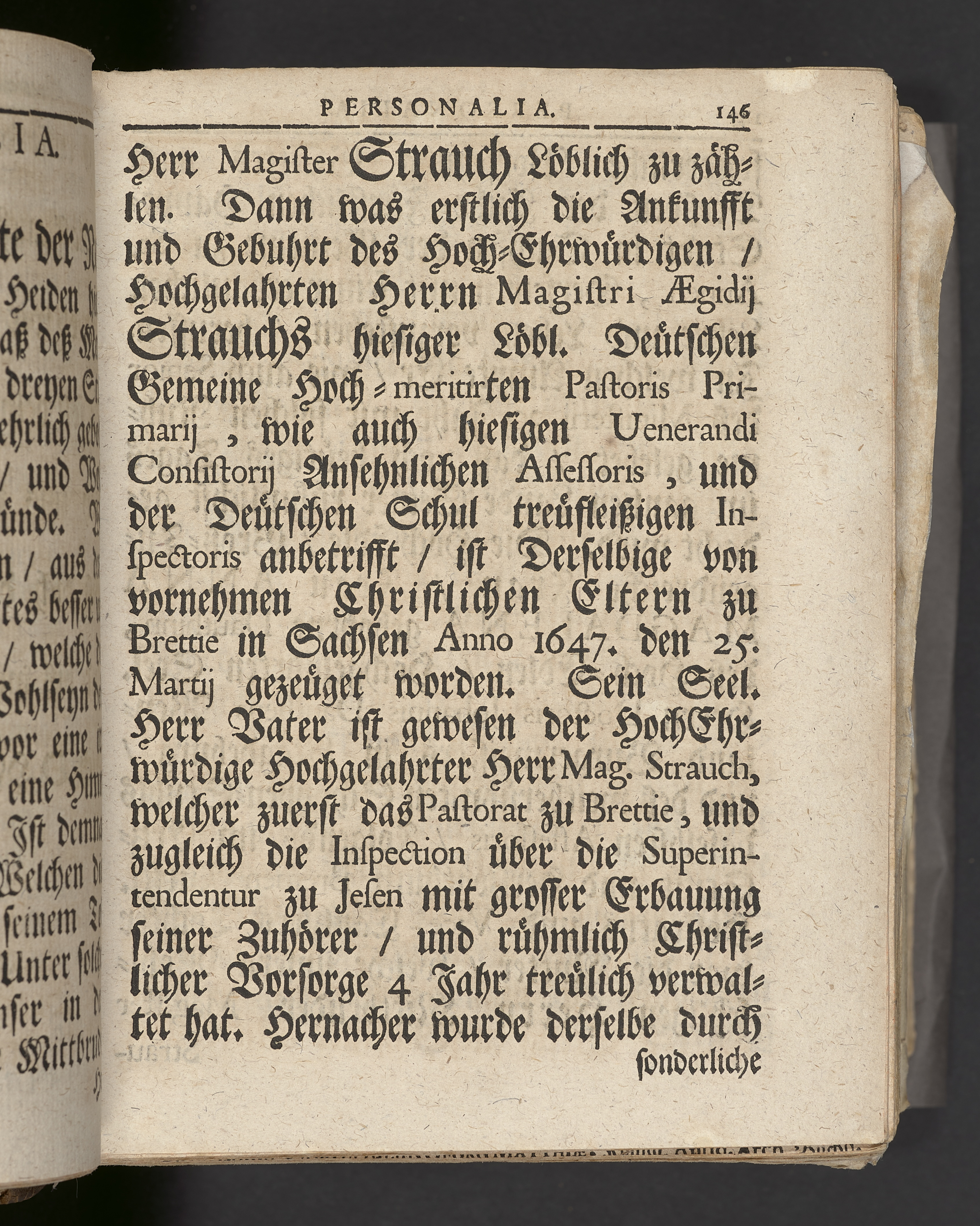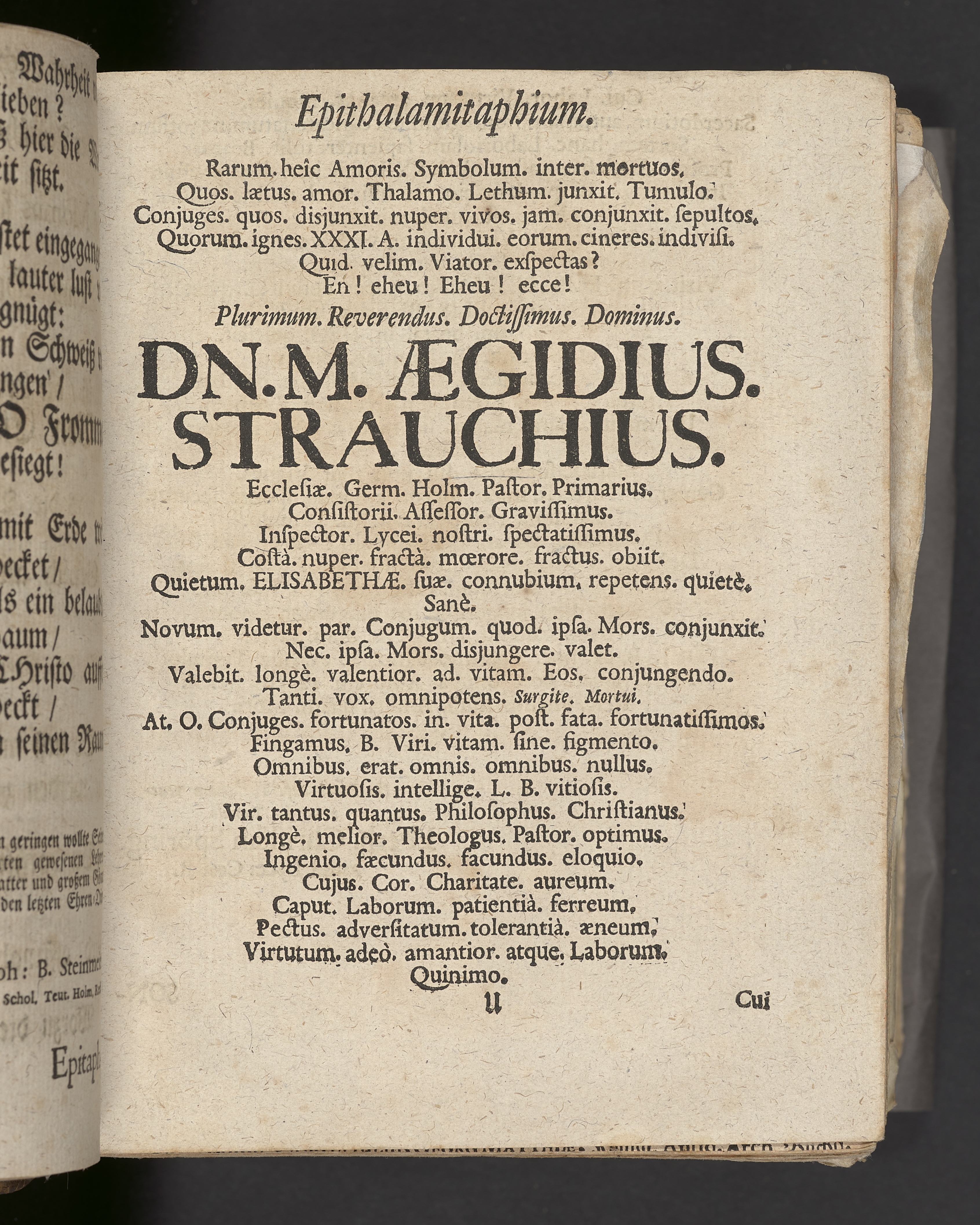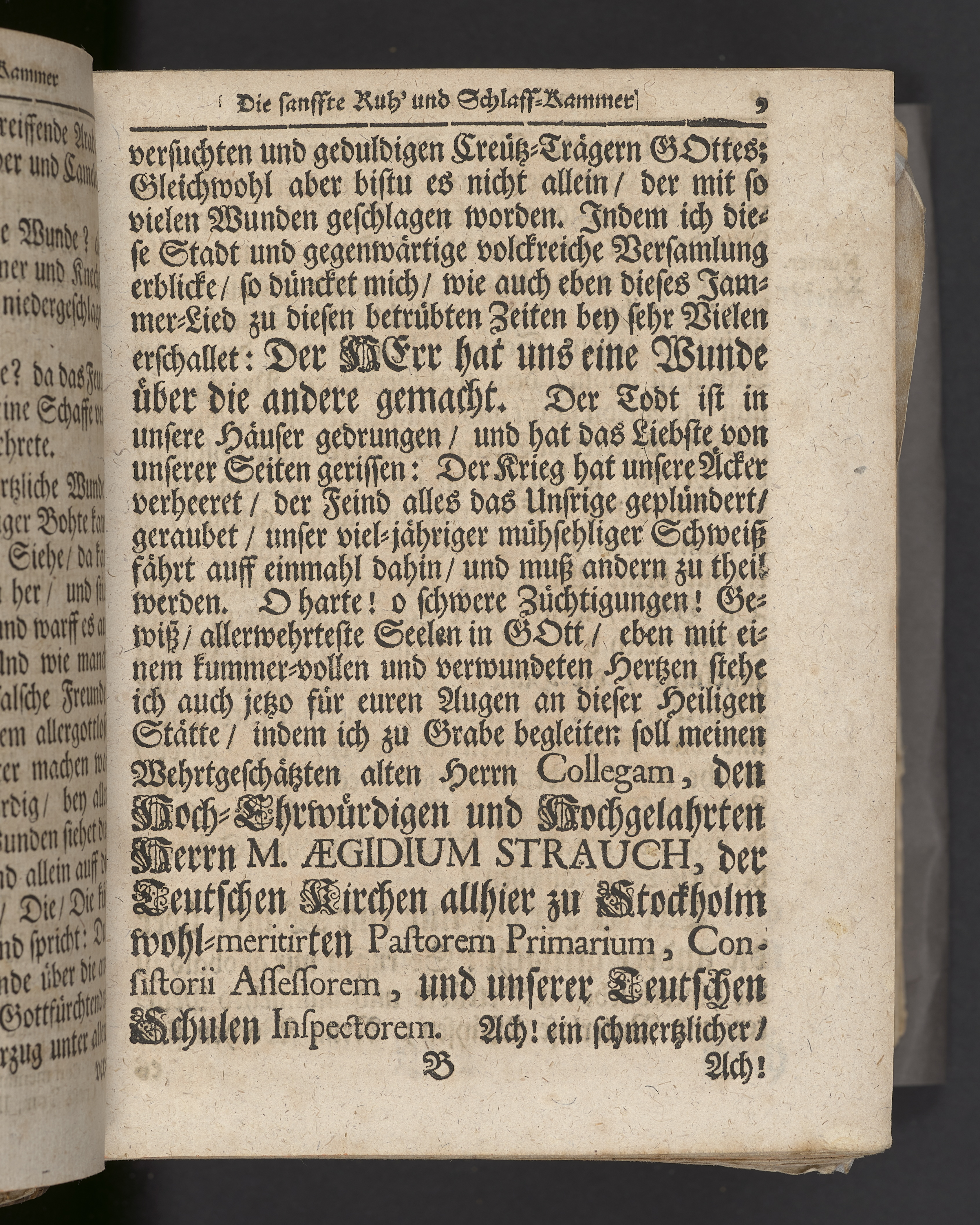 Die sanffte Ruh- und Schlaff-Kammer ... des weyland hoch-whrwürdigen und hochgelahrten Herrn, Hrn. M. Ægidii Strauchs ... als dessen erblaster Leichnam ... den 13. junii anno 1709. zu seiner Ruhe begleitet ... in der Haupt-Kirchen zu St. Nicolai ... fürgestellet von Timotheo Lütkemann ... Stockholm, druckts Julius Georg Matthiæ ...