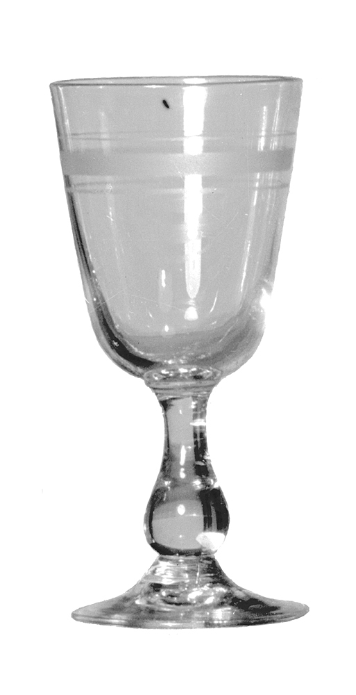 VINGLAS på hög fot, fyra stycken, av färglöst glas. Kuppa omvänt konisk, med rundad botten, kring kuppan något ovanför mitten etsat en bred rand mellan två smala; ben (skaft) balusterformigt; fotplatta svagt kupig. Mått: H: 10,4 - 10,6; D: 4,8 - 4,9 cm. Fot: D: 4,6 - 4,9 cm.