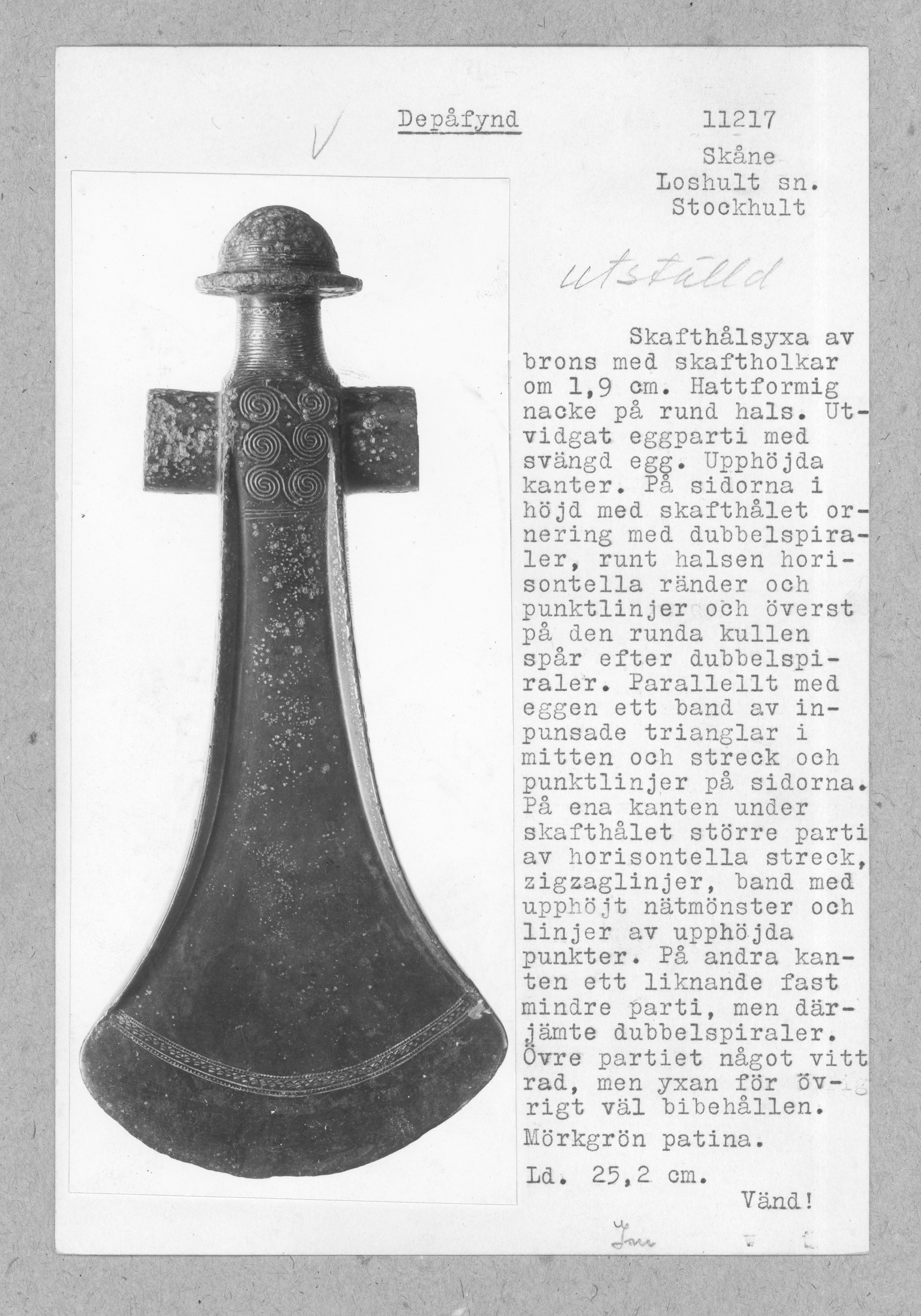 Skafthålsyxa av brons med skaftholkar om 1.9 cm. Hattformig nacke med rund hals. Utvidgat eggparti med svängd egg. Upphöjda kanter. På sidorna i höjd med skafthålet ornering med dubbelspiraler, runt halsen horisontella ränder och punktlinjer och överst på den runda kullen spår efter dubbelspiraler. Parallellt med eggen ett band av inpunsade trianglar i mitten och streck och mittpunkter på sidorna. På ena kanten under skafthålet ett större parti av horisontella streck, sicksacklinjer, band med upphöjt nätmönster och linjer av upphöjda punkter. På andra kanten ett liknande fast mindre parti, men därjämte dubbelspiraler. Övre partiet är något vittrad, men yxan är för övrigt väl bibehållen.
