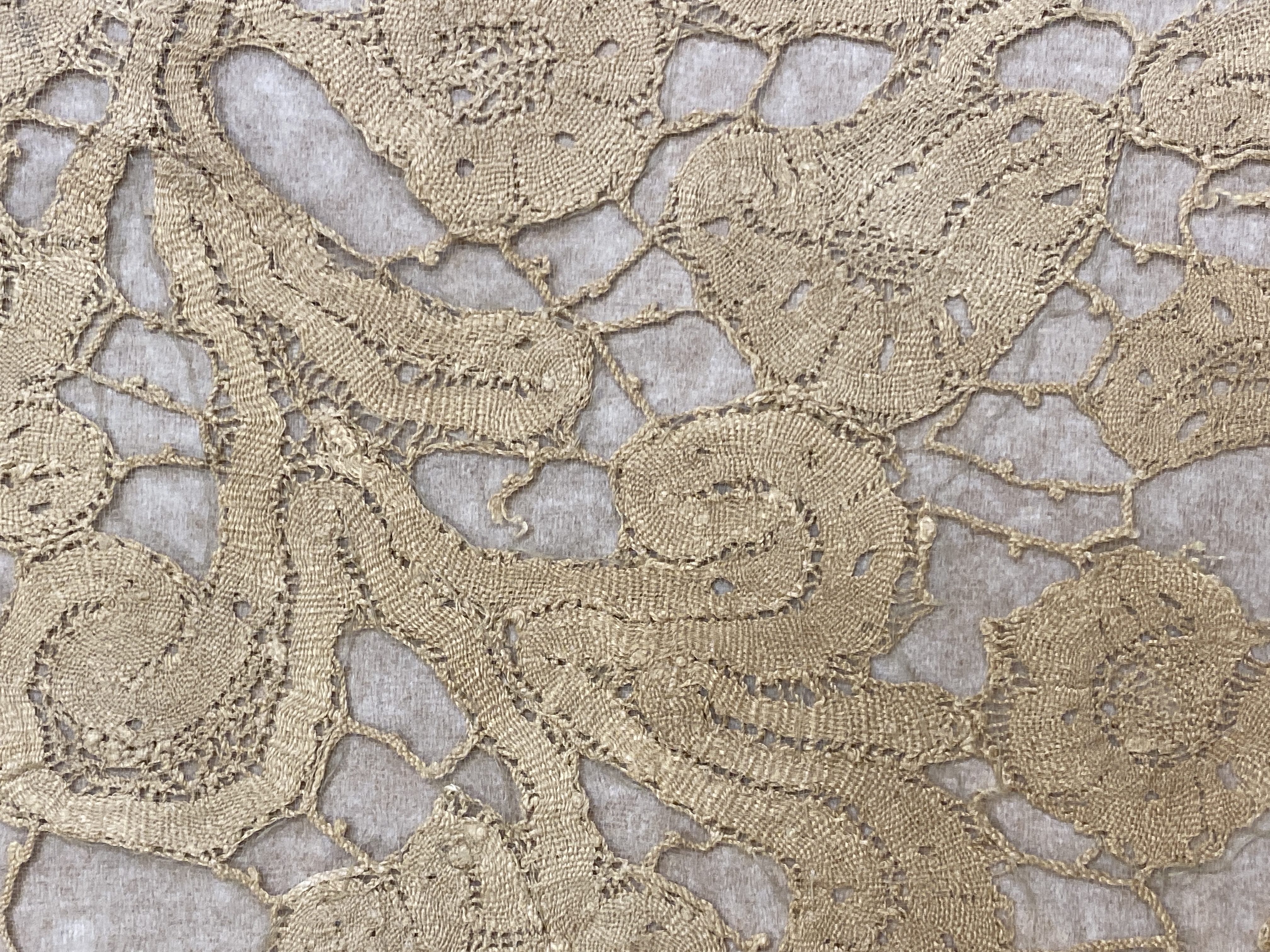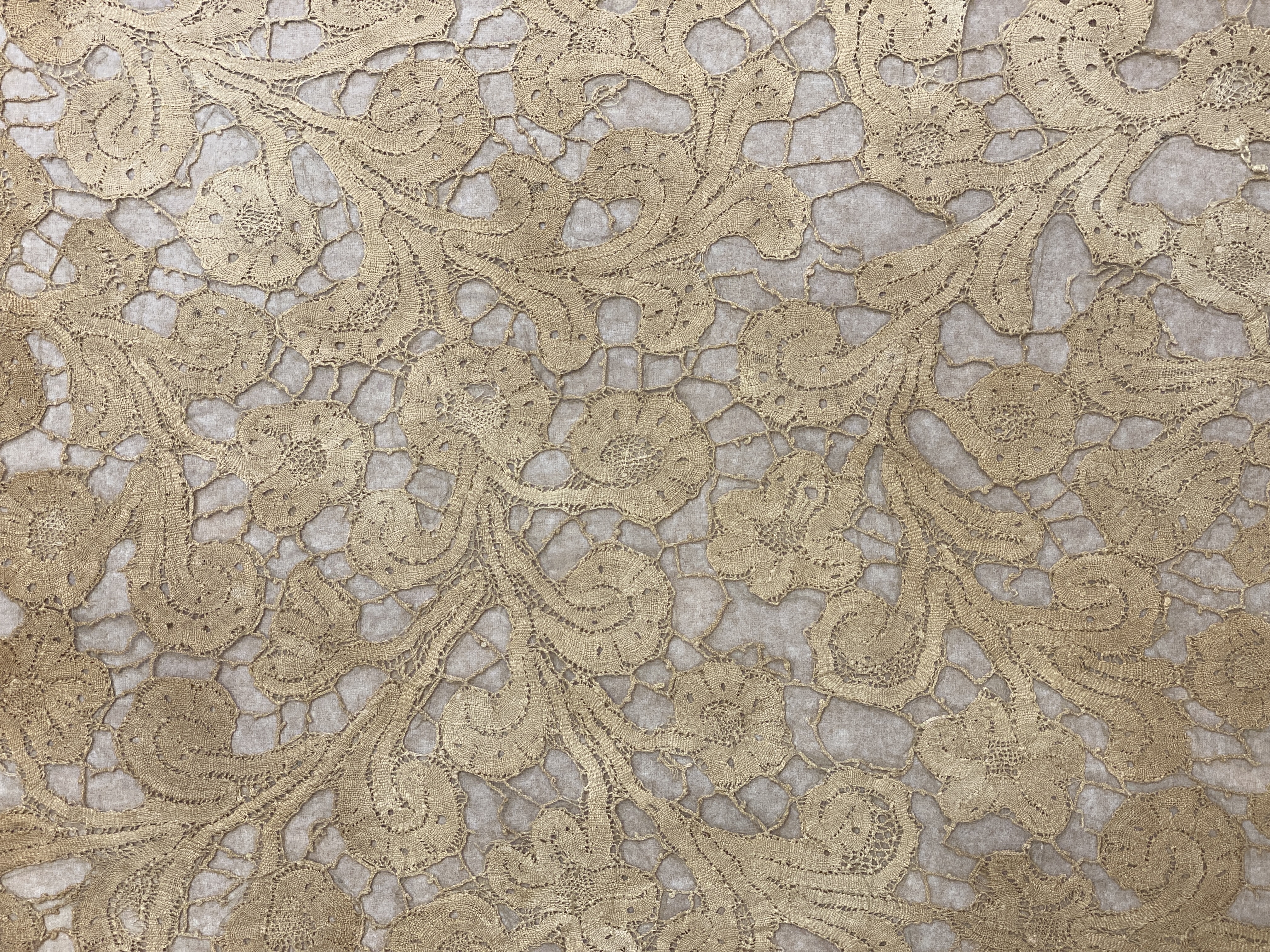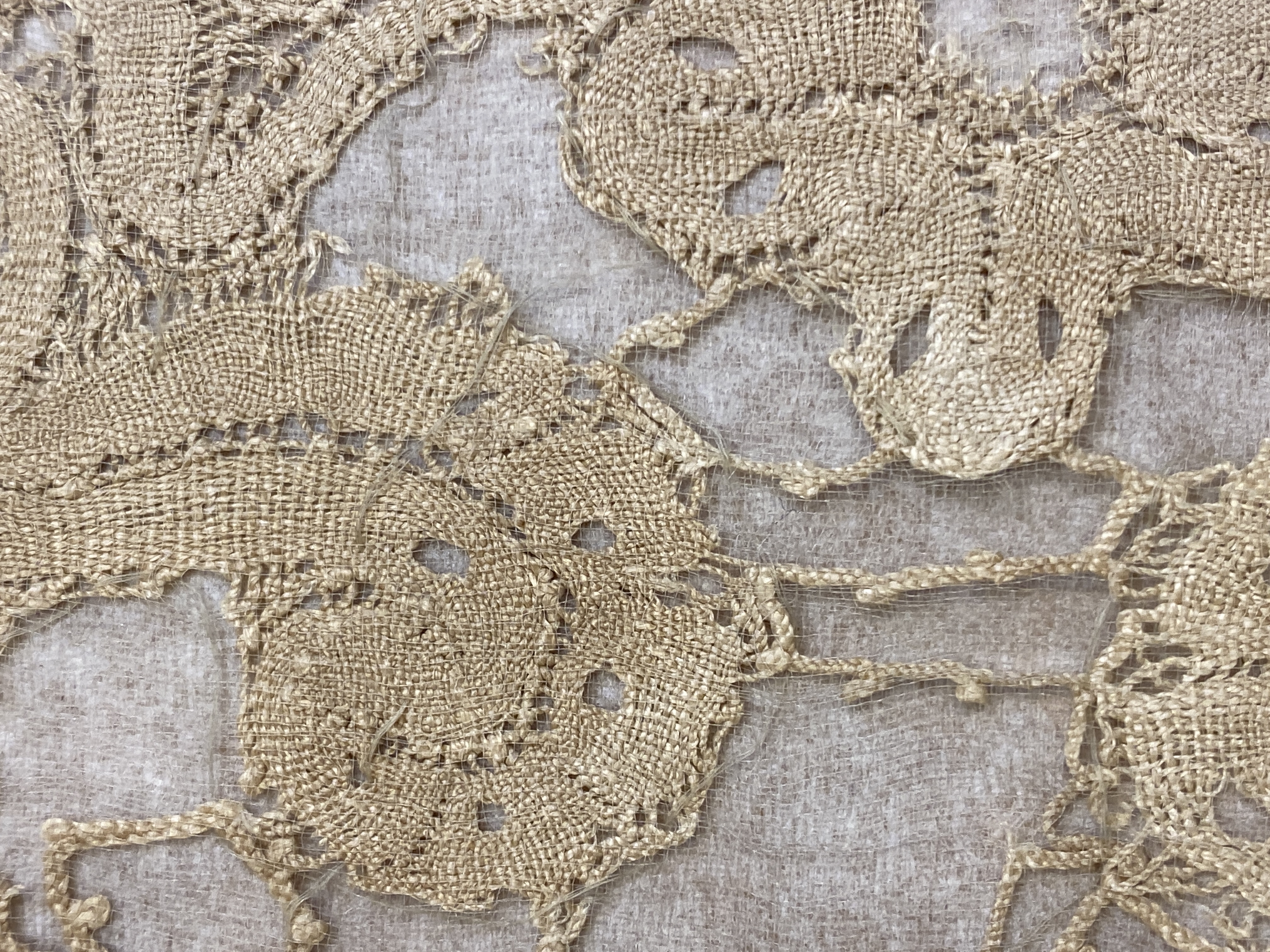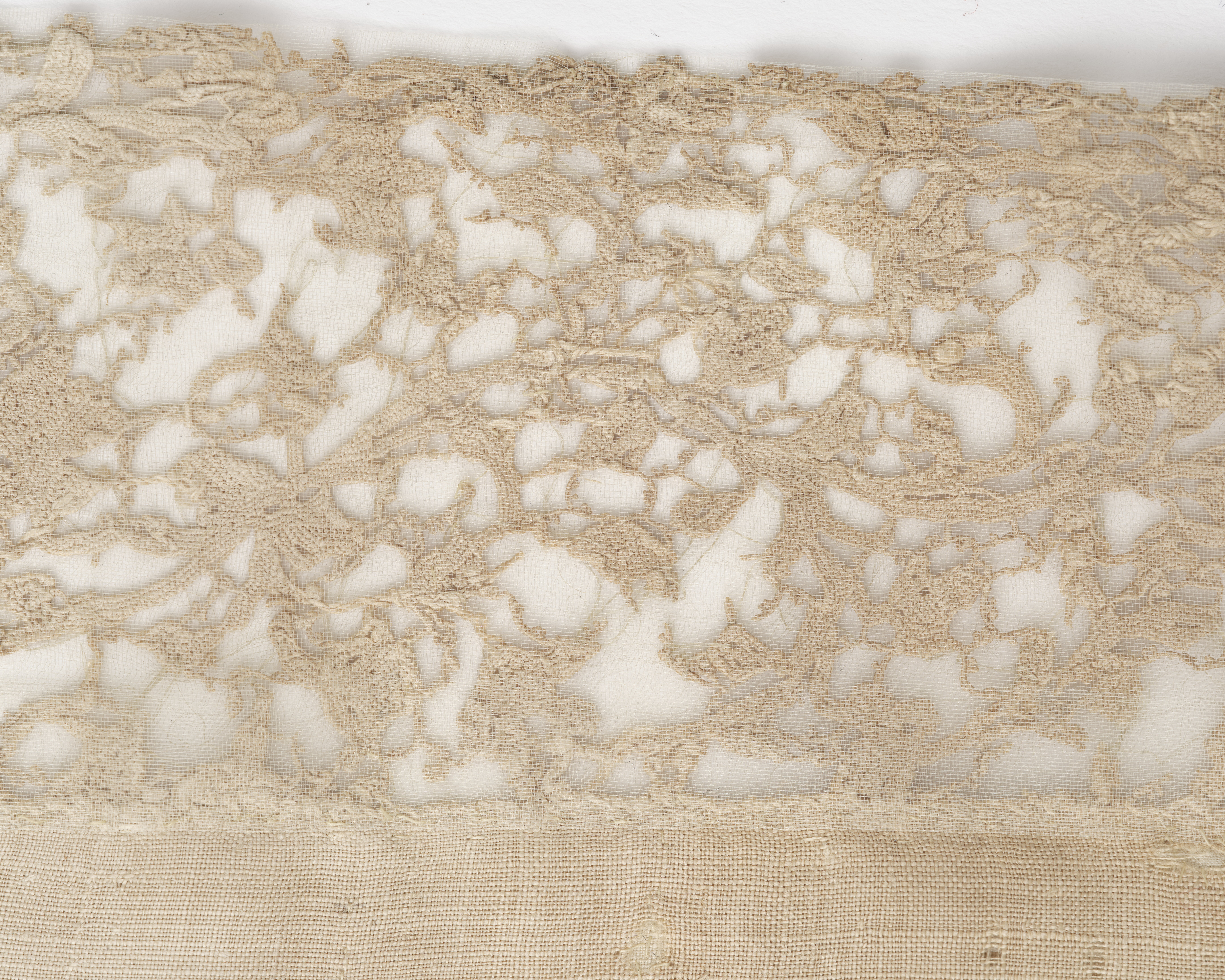 Vit linnelärft med knypplad spets i kortändarna och sydd spets utmed framsidans kant. Deponerad.