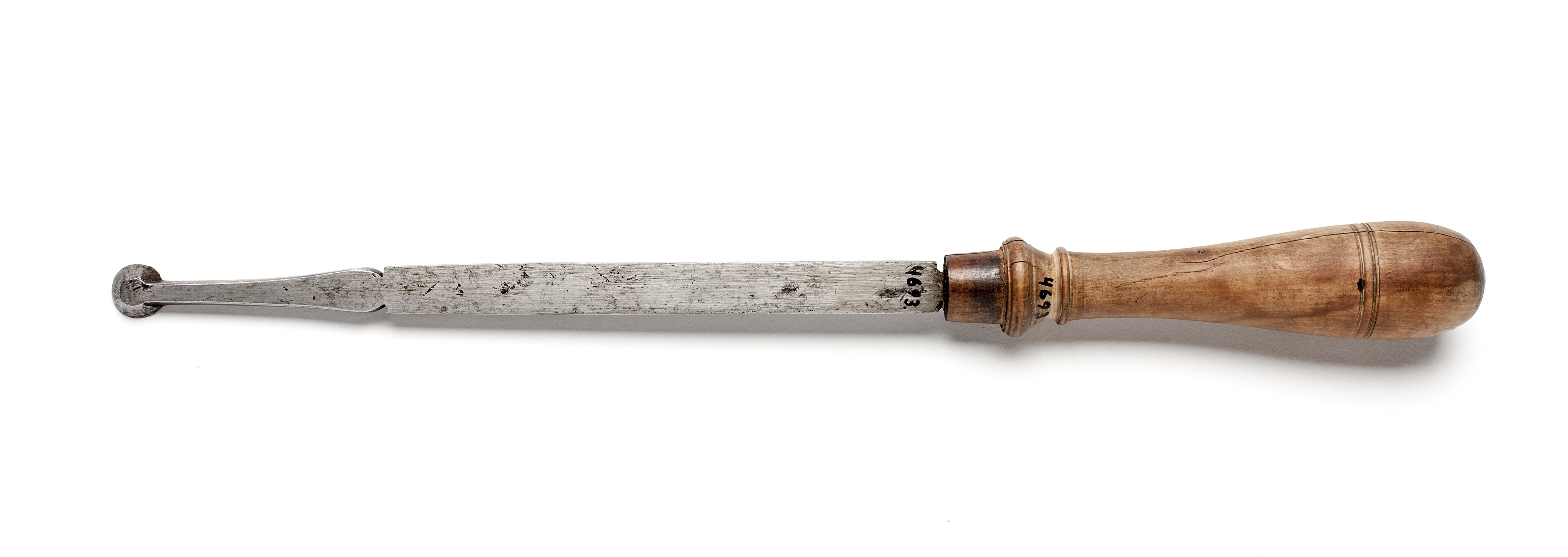 Klinga med rektangulär genomskärning, via profilering övergående i smalare ände med runt stål. Svarvat skaft av päronträ med två vulster nedtill ("rydboholmstyp"). Ringen bortfallen.