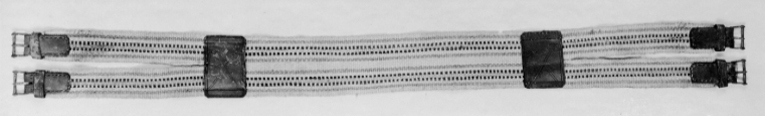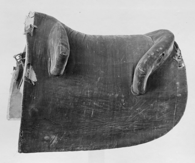 Sadel av ljust sämskat skinn fodrat med brunt läder överklädd med röd sammet. Rektangulära kåpor, baktill rundade. Tvådelad frambom 450 mm bred, 80 mm hög. Låg bakbom 520 mm bred, 80 mm hög. Bossor av naturfärgat linne kantat med brunt läder. Fyra stroppar för sadelgjord, två söljor för förbygel, två byglar för stigläder. Tillbehör: Sadelgjord 1225 mm lång av naturfärgad hampa med invävda bårder av blått, gult och rött med två söljor i vardera ände.