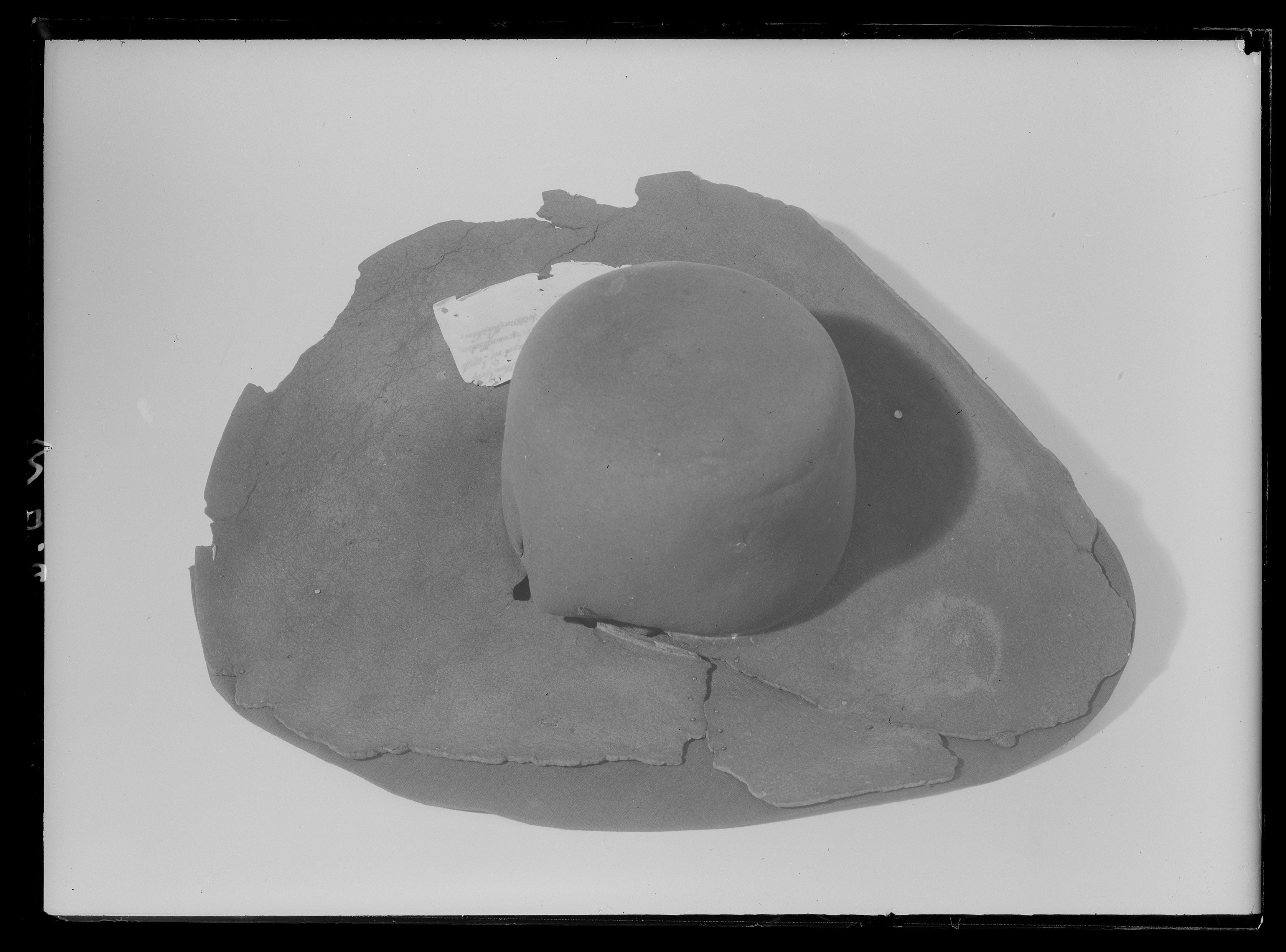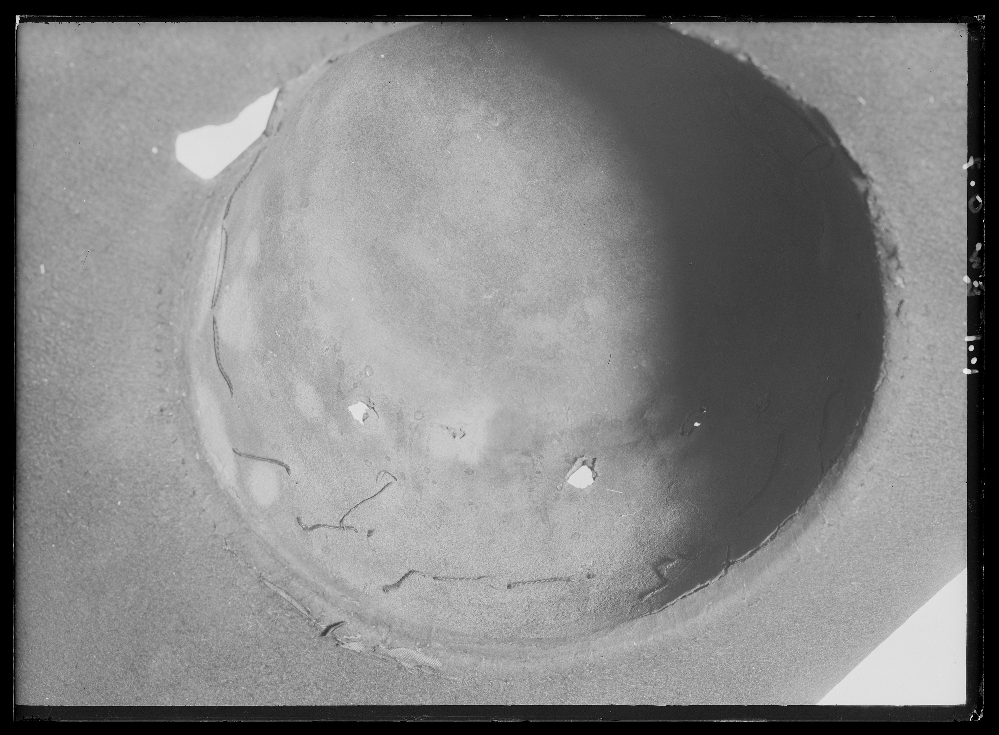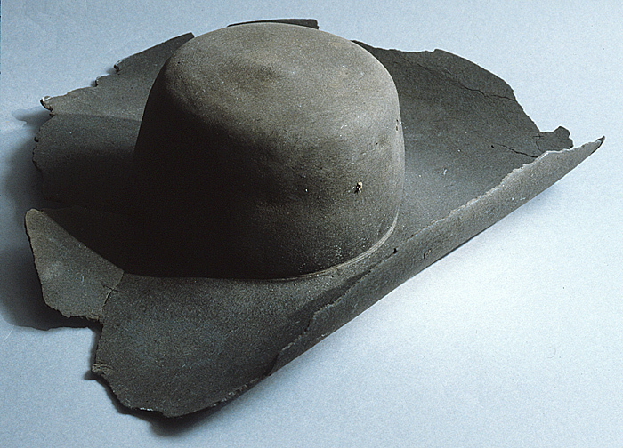 Rund, Plan kulle ca 19 cm i diameter, 12 cm hög. Tresidigt brätte, ca. 17 cm brett, med vänster sida uppvikt. Mitt för uppvikningen rester av tråd, eventuellt för fästande av dekoration. Rester av svart sidenfoder efter kullens inre kant. Tillhörande etikett från 1800-talet: Denna Hatt har Fältmarskalken Gref Nils Bjelke nyttjat uti Slaget vid Lund 1676 och är då blifven igenomskjuten på hans hufvud, men Fältmarskalken blef dock oskadd.