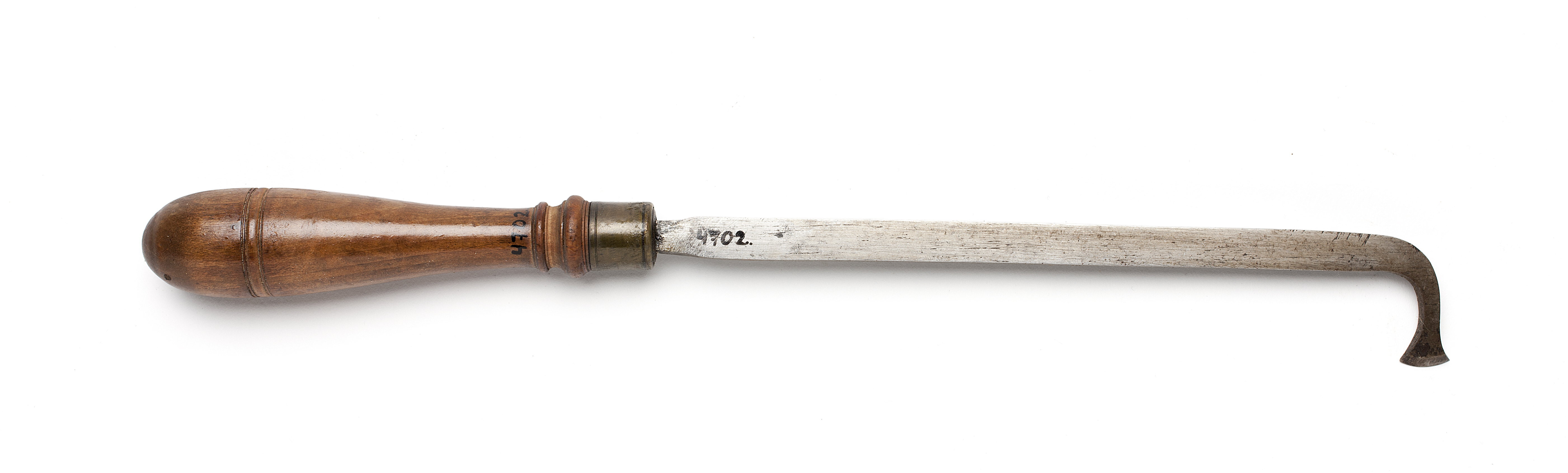 Klinga med rektangulär genomskärning. Böjd ände med utsvängd, svagt rundad egg. Svarvat skaft av päronträ med två vulster nedtill. Mässingsring.
