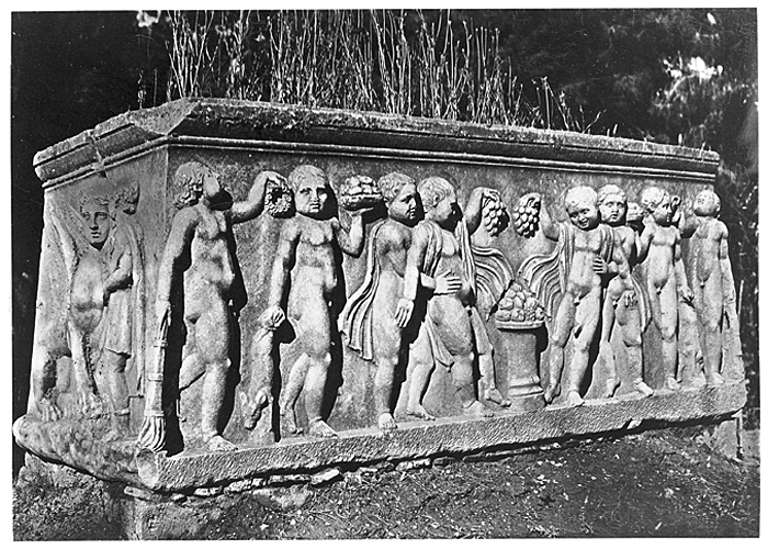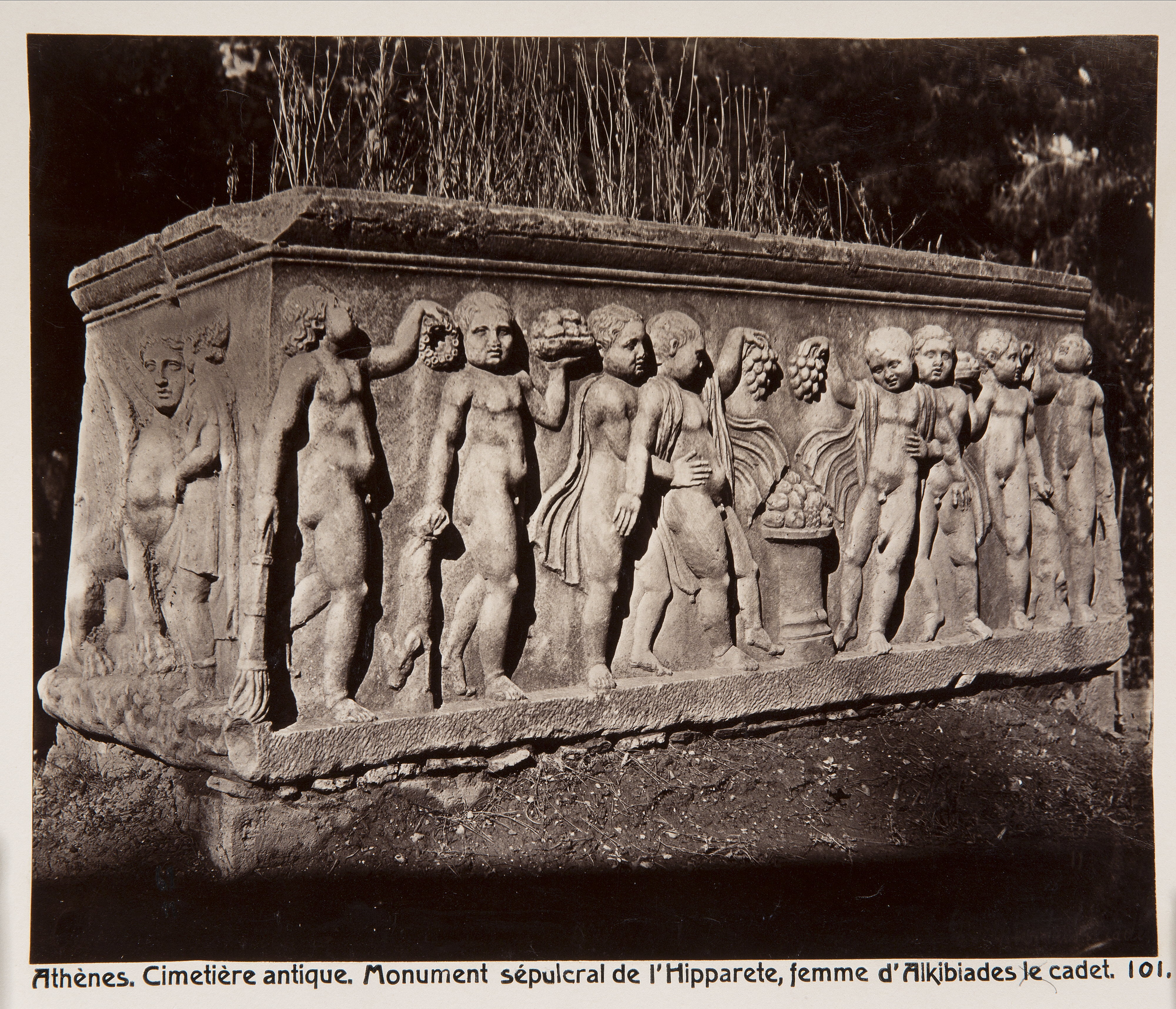 Monument på den antika kyrkogården i Aten, Grekland. Text på originalet: Athènes. Cimetière antique. Monument sépulcral de l`Hipparete, femme d`Alkibiades cadet. Foto från resa genom Grekland, Makedonien och Serbien, 15 mars-6 juni 1896. Fotografierna LXVI:K.18.-147. är köpta av Wilhelmina von Hallwyl, f. Kempe på Korfu samt i Patras, Nafplion, Aten, Thessaloniki och Belgrad. Med på resan var maken Walther von Hallwyl och fröken Ida Uhse. Uppgifterna kommer från Ida Uhses reseanteckningar.