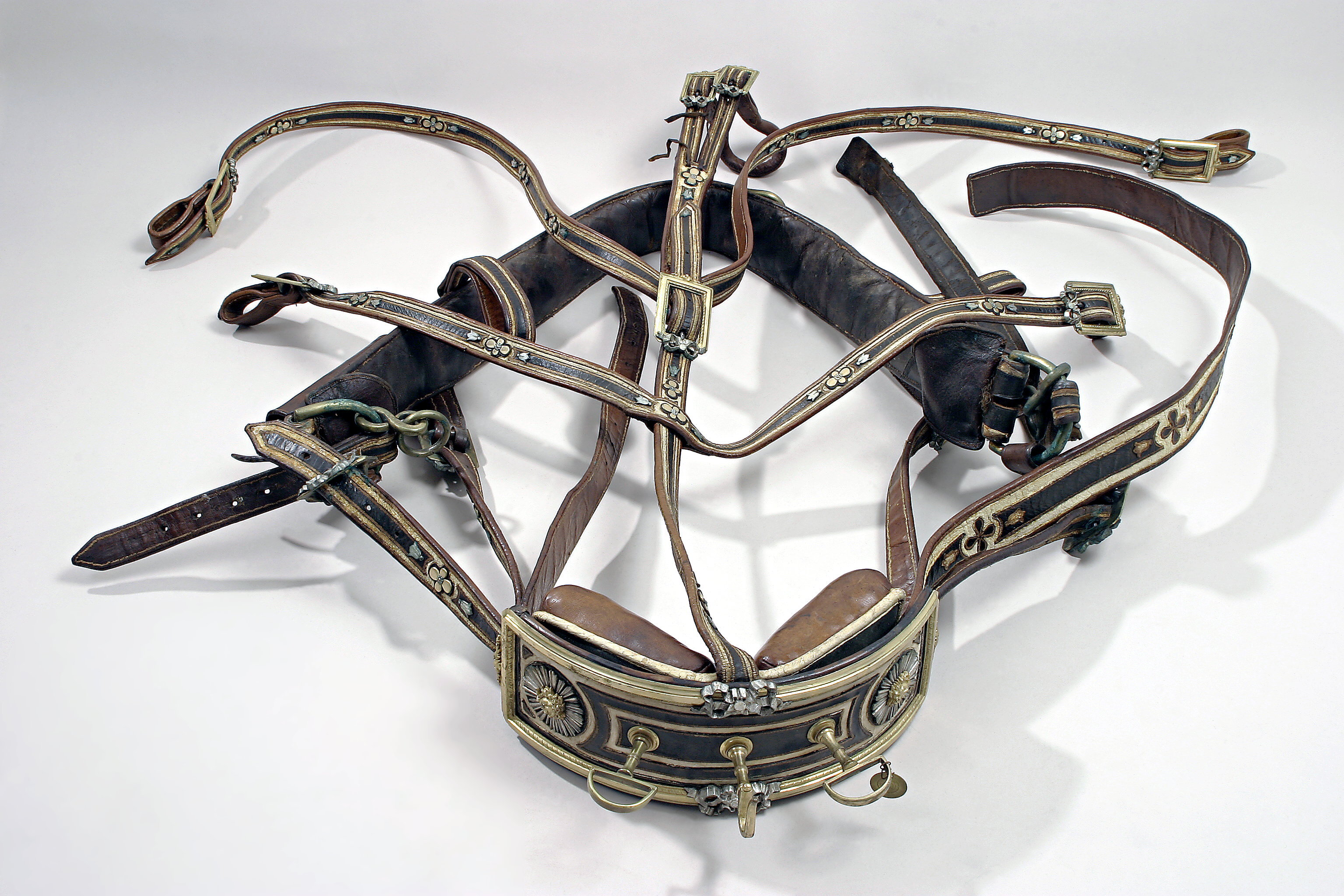 Seltyg av svartmålat läder med dekorsömmar och imålade vita ränder. Stöd- och bärremmar med grupper om en förgylld fyrklöver med två försilvrade klockor var. Brösta, bukgjord och draglinor med ditsydda grupper om en fyrklöver med två klockor var. 90 mm bred brösta med stångkappring. På var sida om bröstan läderstropp för draglinor. I bröstans ändar halvrunda söljor av förgylld mässing i vilka draglinor, bukgjord, deckel och mässingsring är fästade. Mankremmen är snedställd och går från deckeln till bröstan, spännes med rektangulär, förgylld gjuten mässingssölja med fastnitad försilvrad rosett, rembredd 31 mm. Deckeln, b: 420 mm, L: 125 mm, av svart läder med dekorsömmar och vita fältin- delningar, på var ytterkant ett förgyllt Medusahuvud på försilvrade strålar. Ram av profilerad förgylld gjuten mässing med två försilvrade mässingsrosetter. Två halvrunda tömlöpare och en tränshake av förgylld mässing. Bossa av sömlöst läder. Deckelgjort, b: 60-35 mm med förgylld slät sölja. Bukgjord, b: 35 mm, fodrad med läder med förgylld slät sölja. Främre bärrem rörlig med nedtill en ögla för dragrem. Bakre stödrem L: 980 mm fastsydd vid ryggstyckets sölja och nedtill med en ögla, för dragrem. Båda remmarna med två rektangulära, förgyllda och försilvrade söljor. Svansremmen kluven, med två mindre förgyllda och försilvrade söljor. I grenen en smal, svart läderrem fastsatt. Draglinor 2530 mm, b: 42 mm med skarvbit 750 mm L, resp. 740 mm L, med mässingsöglor för svänglar.