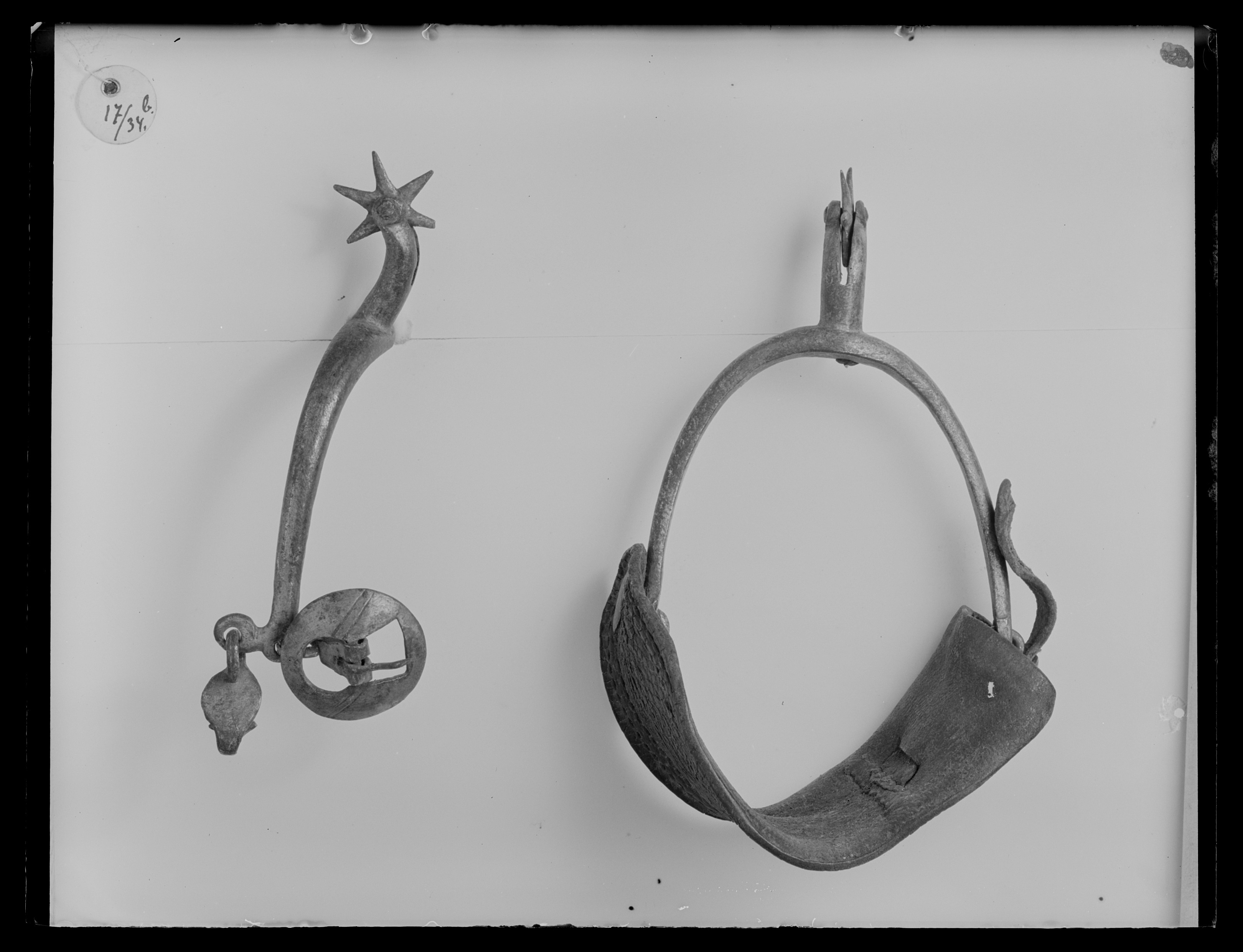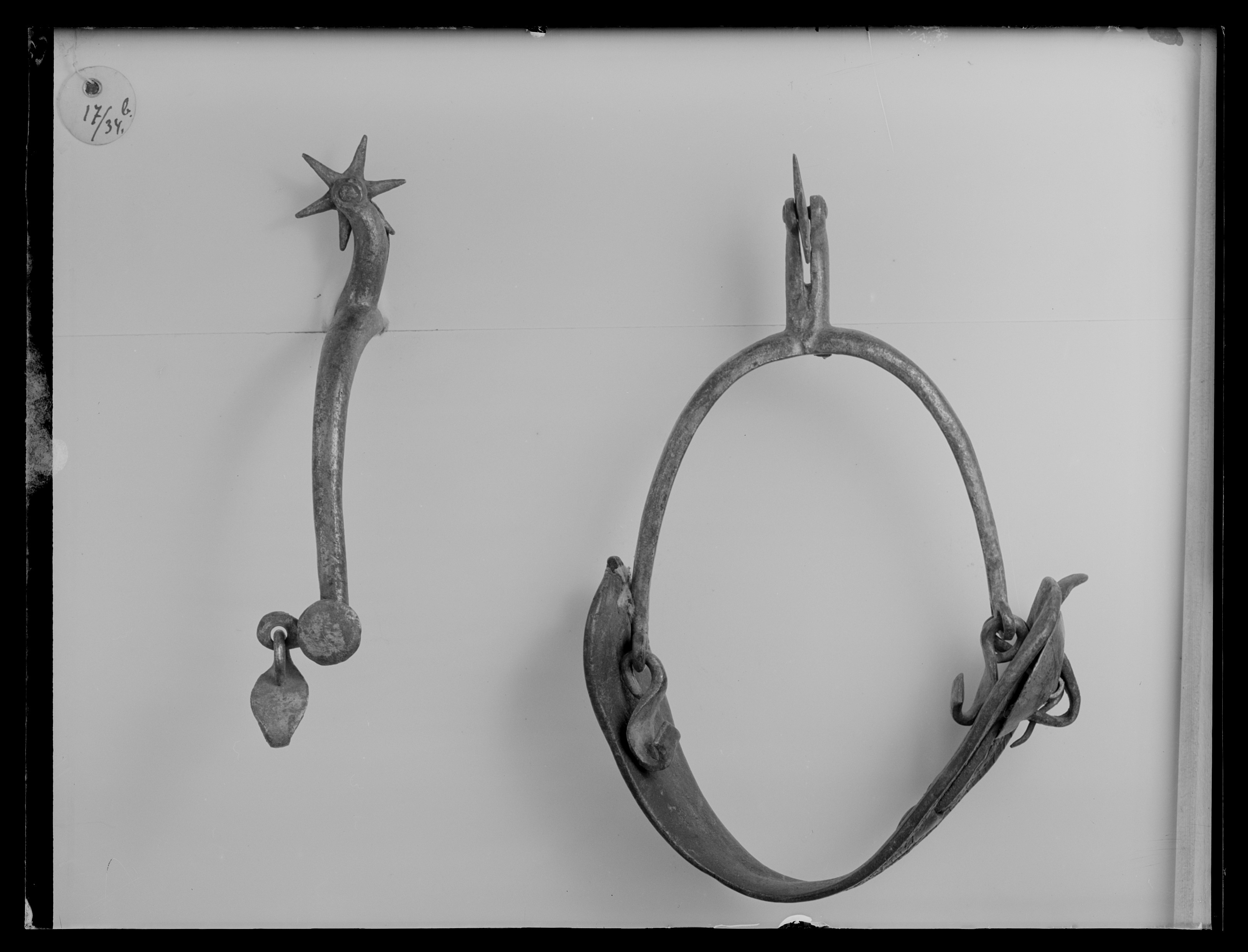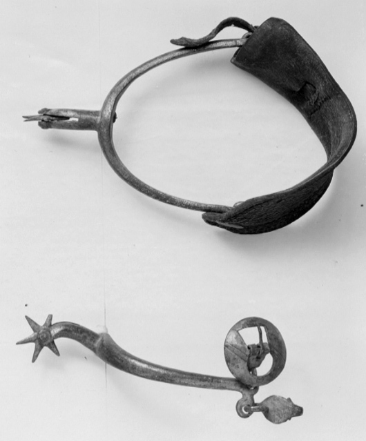 Sporre av stål med u-formade skänklar och 37 mm lång hals, något nedåtböjd med sexuddig klinga. Vid ena skänkelns ände rund knapp på hals. I den andra rund kraftig remsölja med bred kant. Mellan dessa 62 mm bred vristrem av läder med kantstickning. Vid ändarnas nedre kant kraftiga hakar (för hålfotsrem). Tillsammans med nr 30-45 inköpt för kr 217:55 av Claes Wachtmeister, Knutstorp genom Rudolf Cederström.