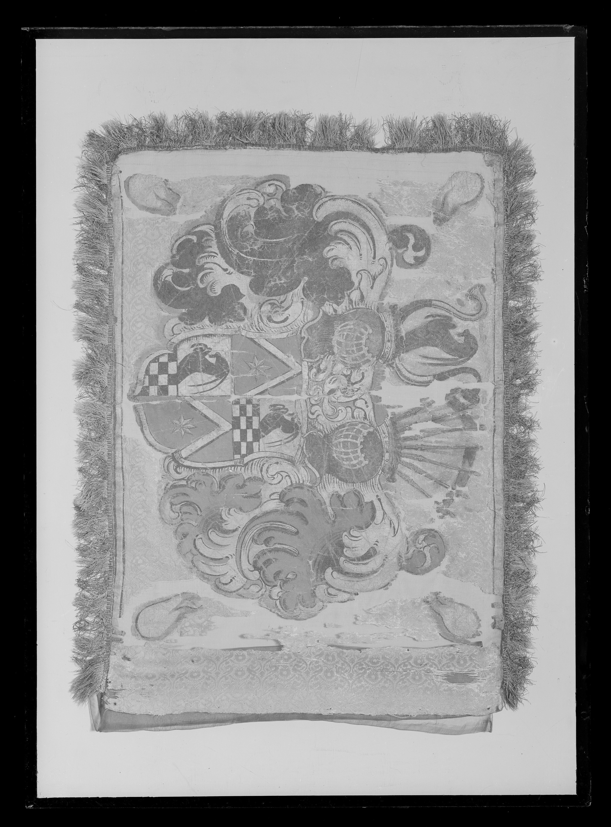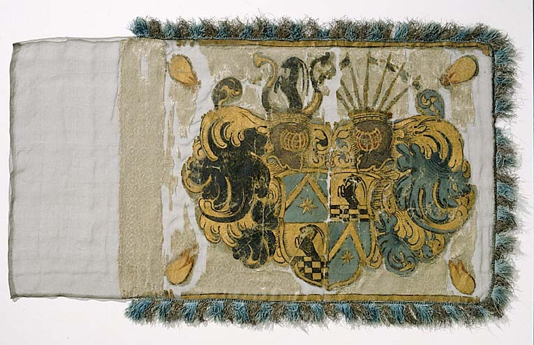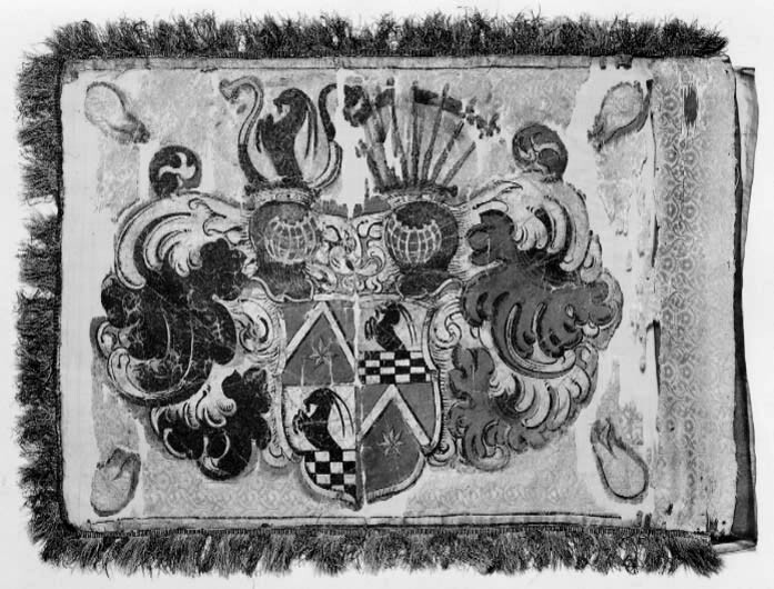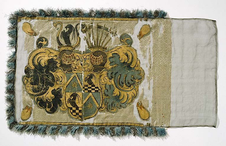 Duken av småmönstrad grå sidendamast. Duken kantad runtom med fransar i intervall om ca 25 mm av blå linnesnoddar och silvertråd. I varje hörn av duken ljungeldar i guld med brandgula kanter. En målad kant i svart och guld löper längs kanten, runt hela duken. Barock emblematik, målad på sidenduken. I mitten en vapensköld, avdelad i fyra fält, med svarta stegrande bockar på guldbotten över en schachrutig nedre del på två fält. Resterande två fält med sparrar i guld över en stjärna i guld, på blå botten. Barocka former (blad/vingar?) i svart och guld på vänstra sidan om skölden, i blått och guld till höger om skölden. Skölden krönt med två tornerhjälmar, bärandes friherrliga kronor. Ovan den vänstra en stegrande svart bock, omgiven av horn i svart och guld på vardera sidan. Ovan högra hjälmen syns sju lansar md tvåtungade vimplar i blått och svart (motiv går ej att utläsa pga. skador i måleriet).