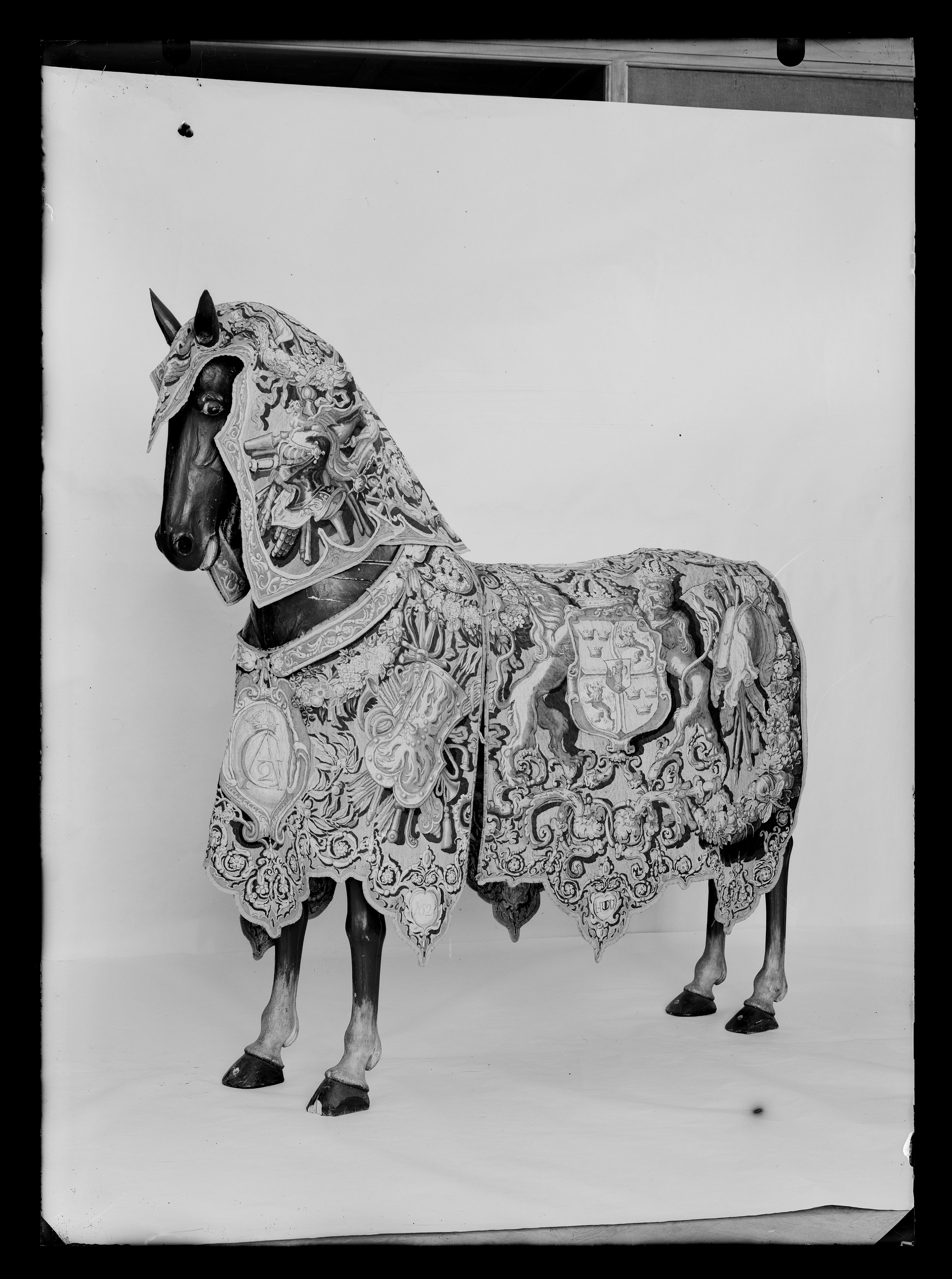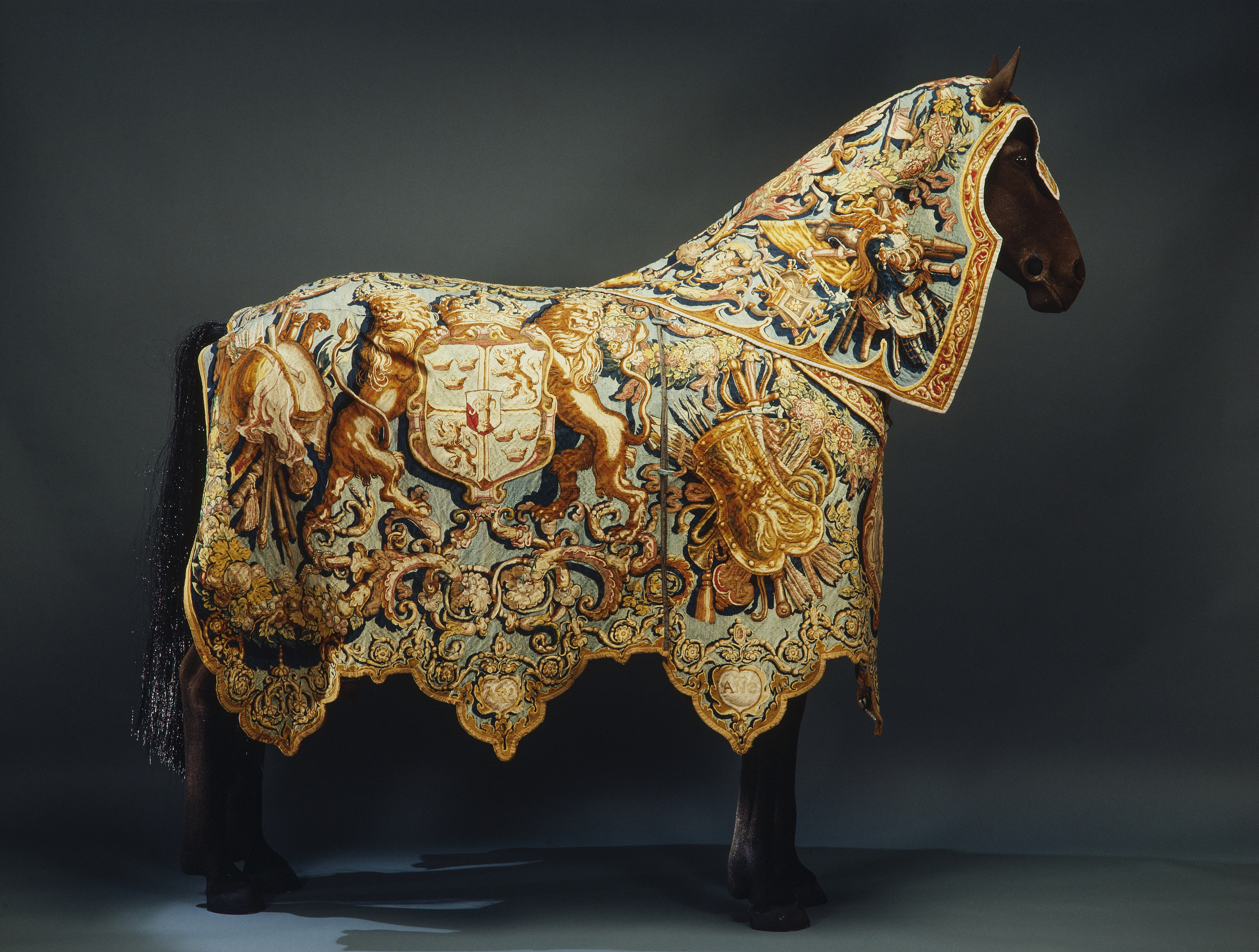 Två romerska hästtäcken, hvardera med halskappan och bröststycke, i gobelinsväfvnad af ull och silke, med ornamenter af trofeer, kronor och vapen, Gustaf II Adolfs namnchiffer samt "Anno 1621".