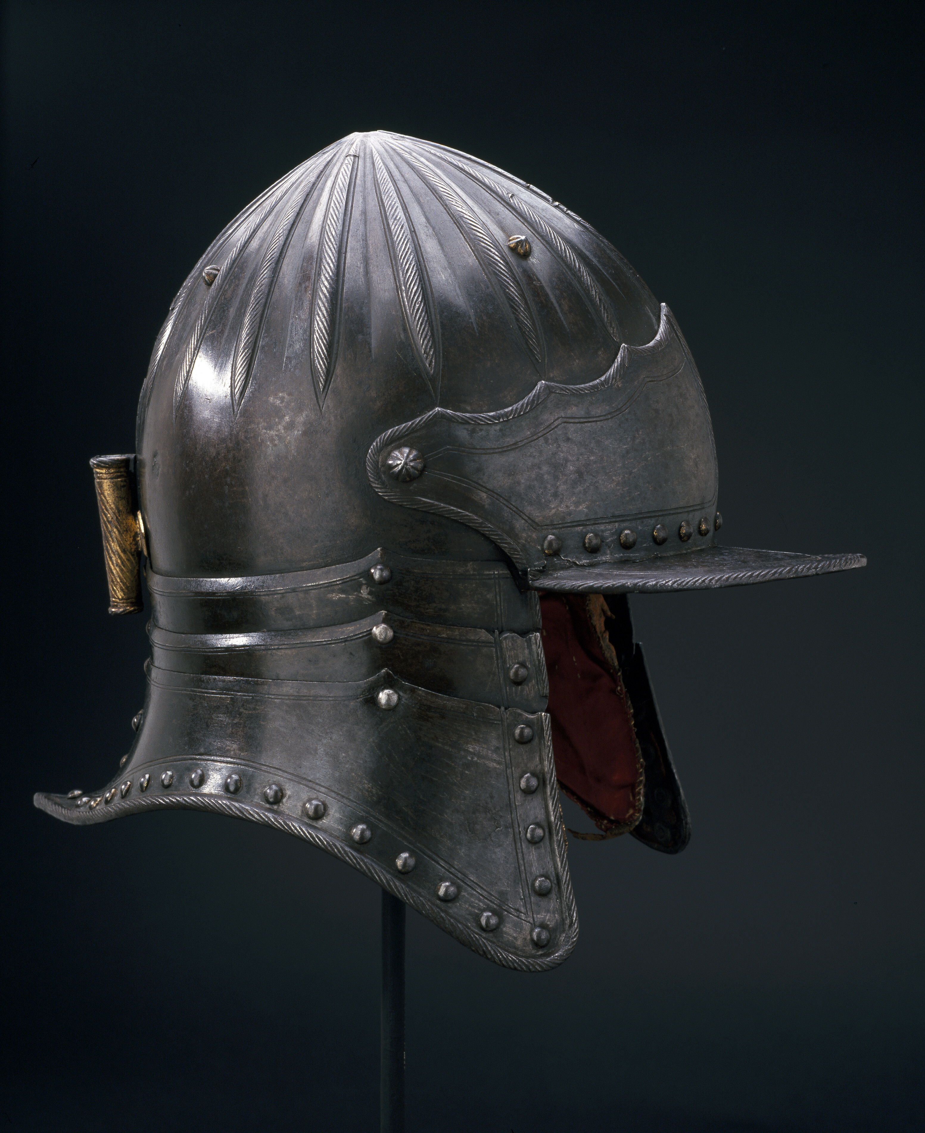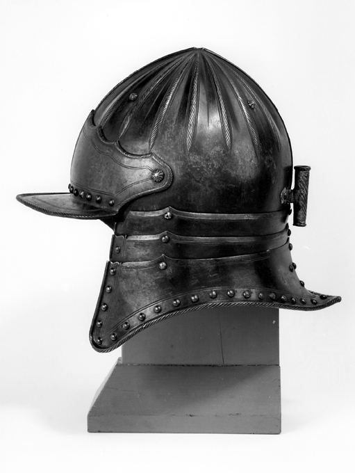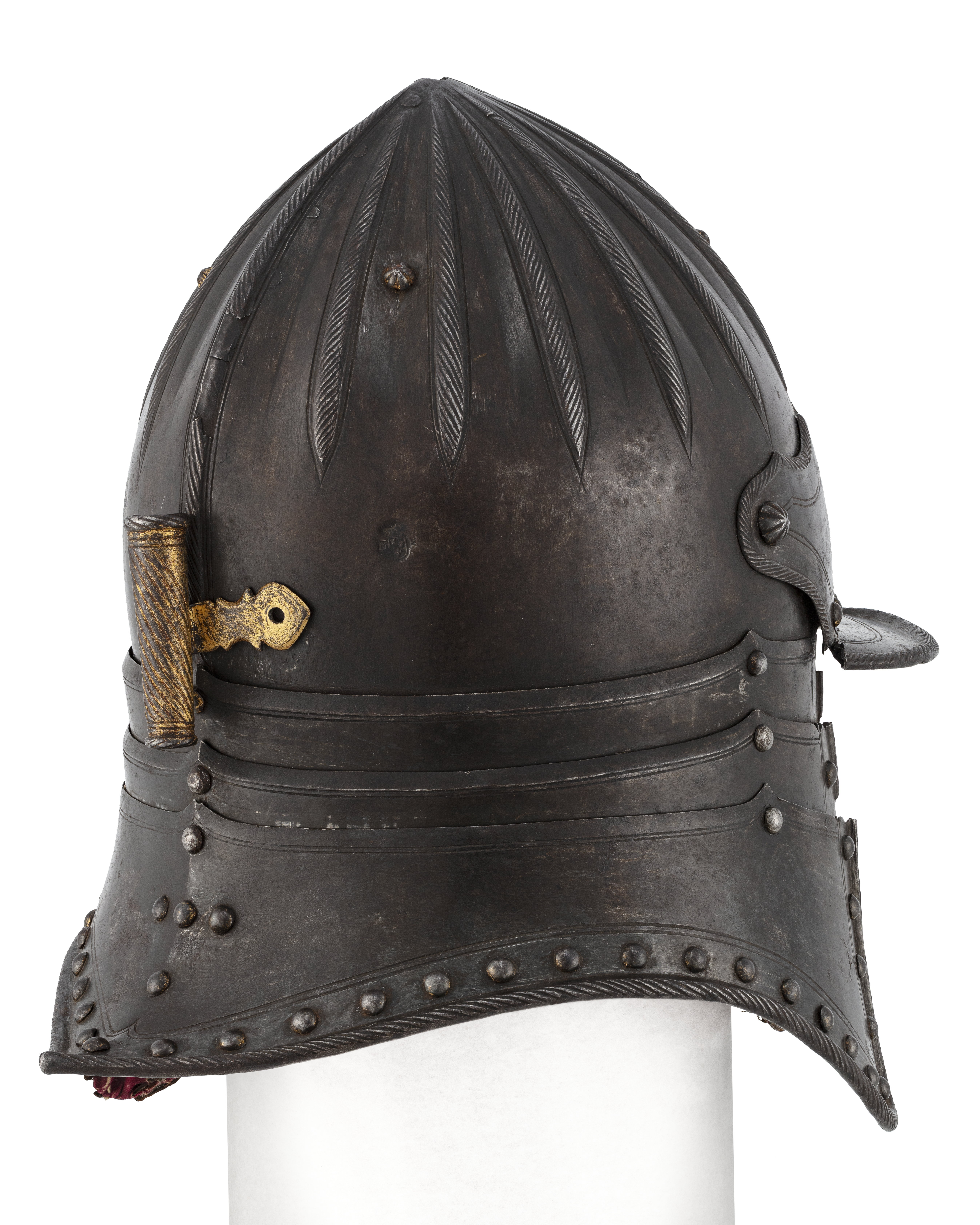 Hjälm av svärtat stål med förgyllda nithuvuden, förgyllningen till största delen bortnött. Från mitten av hjälmklockan strålformigt utgående vulster med snedräfflad ytornering, mellan vulsterna vinkelformiga nedsänkningar. På hjälmklockan fyra blomformiga nitar. Mitt bak en plymhållare med snedräfflad ornering.