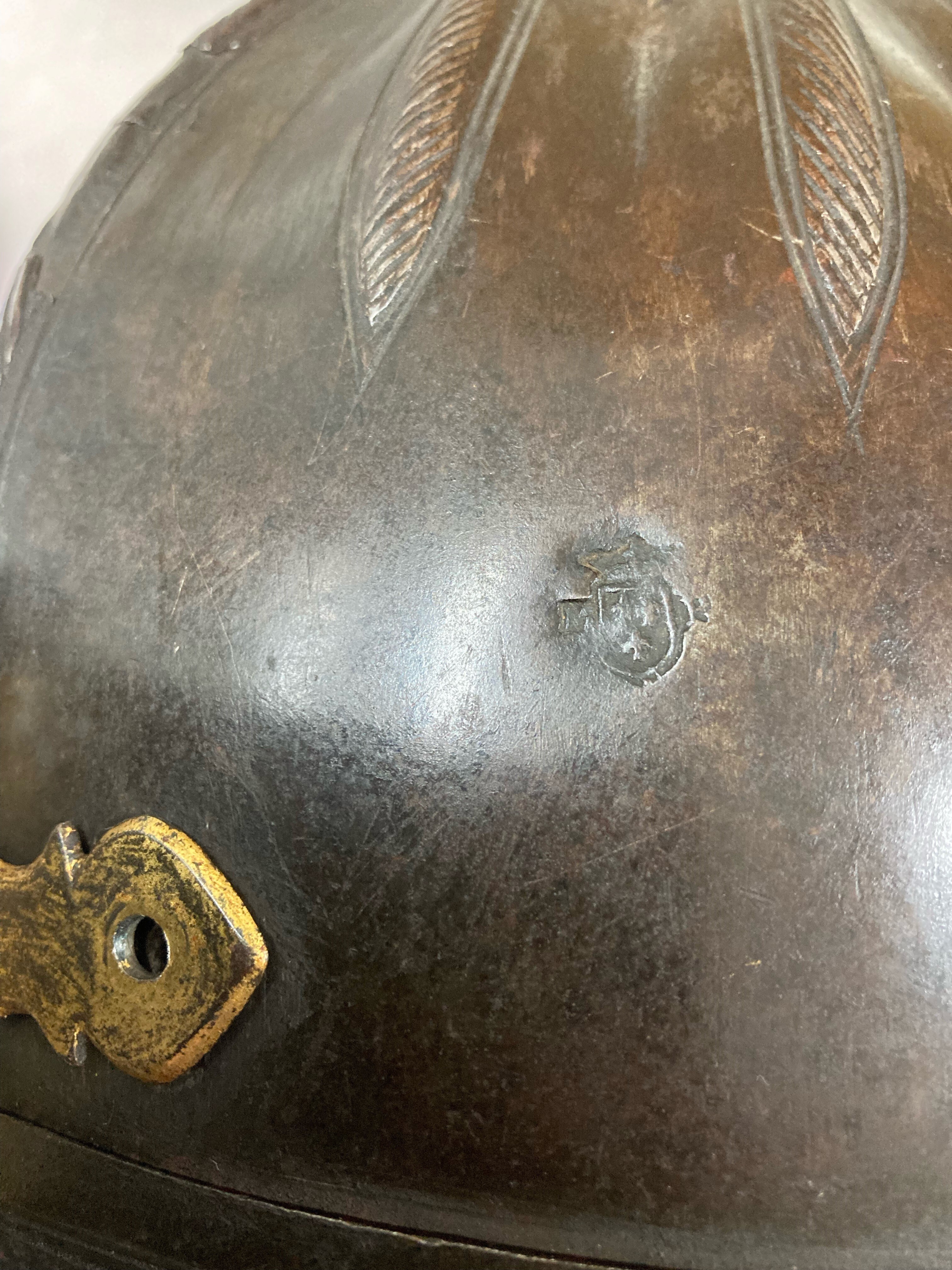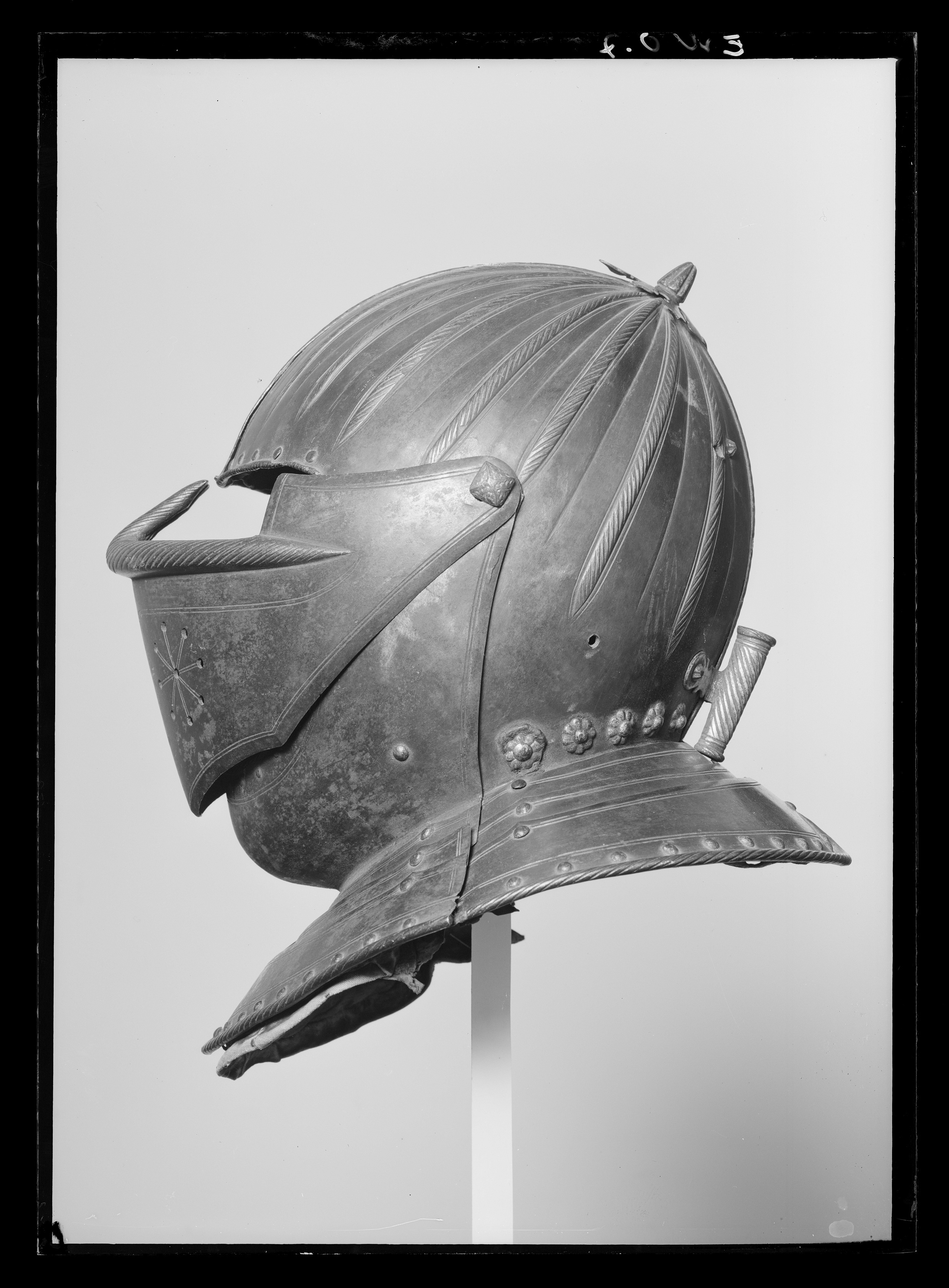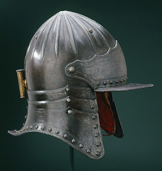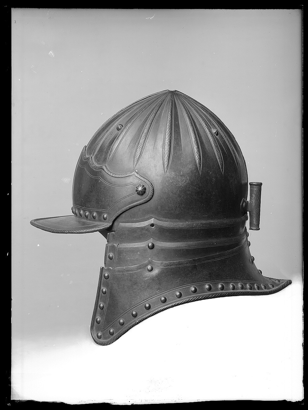 Hjälm av svärtat stål med förgyllda nithuvuden, förgyllningen till största delen bortnött. Från mitten av hjälmklockan strålformigt utgående vulster med snedräfflad ytornering, mellan vulsterna vinkelformiga nedsänkningar. På hjälmklockan fyra blomformiga nitar. Mitt bak en plymhållare med snedräfflad ornering.