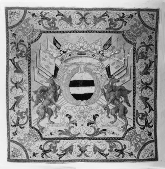 Nästan kvadratiskt täcke. Framsida: Gult kläde med applikationer av kläde i flera färger. I mittfältet grevliga ätten Bielkes vapen. Kartusch av ullgarn med gula (urspr. röda) snoddar. Sköld, tre gånger delad av gult och blått kläde, kantade med röda snoddar. Kronan har applicerade rundlar av vitt kläde, broderade med blått ullgarn och "stenar", markerade med brunt och grönt ullgarn, stoppade med ylletyg i rött och grönt. Sköldhållare två bakåtseende gripar, broderade i grått och grågrönt ullgarn på applicerat, grönt, kyprat ylle. Bakom krona och vapen korslagda fanor av kläde i gult, blått och vitt, broderade med ullgarn i gult, vitt och blått, dekor av öppna kronor. Fanorna är kantade med snoddar i gult, vitt, rött och blått. Fanstängerna markeras av gula snoddar av ullgarn. Vapnet står på en symmetriskt uppbyggd sockel i form av ett trappstegsformigt anbringat, jämntjockt band av gult kläde med gula snoddar. Sockelns mittparti prydes av akantuslöv i grönt, rött och vitt kläde. Mellan löven gula prickar av ullgarn i läggsöm (urspr. röda). Kring täckets kant sitter en ca 355 mm bred bård av akantusslingor i rött, grönt och vitt. Bården begränsas av remsor av kläde, b: 35 mm, den inre grön, den yttre röd. Samtliga dessa applikationer är kantade av snoddar i grönt och vitt. Partierna mellan akantusbladen har broderade prickar av urspr. rött ullgarn. Hörnsvicklarna är avskurna med en rund båge. Mellan bågarna i varje hörn ett spegelmonogram B krönt av grevekrona, bokstäverna och kronorna är av gult kläde med kantmarkering av gula, urspr. röda snoddar. Kronans detaljer är utförda på samma sätt som den stora kronan över kartuschen. Foder av två våder oblekt linnelärft. Upptill sitter 14 st ringar av gulmetall, d: 30 mm, fastsydda med svart tråd.