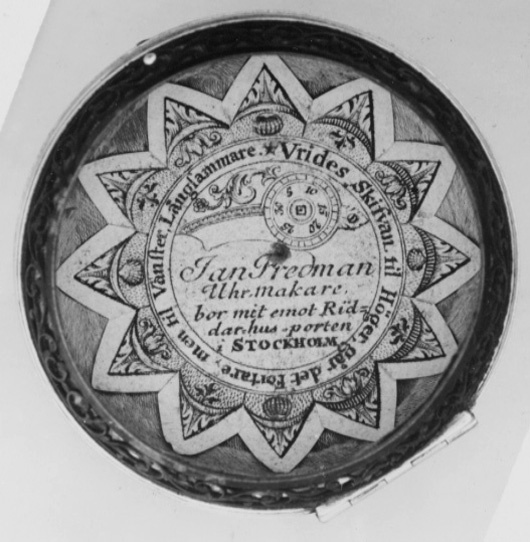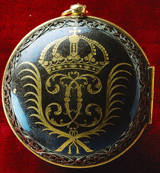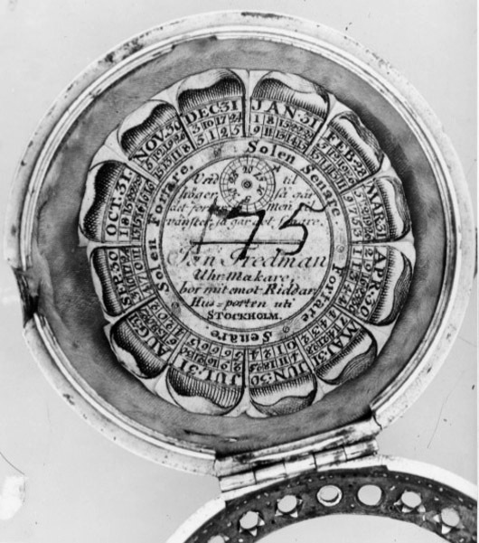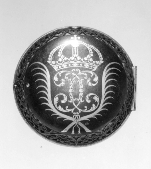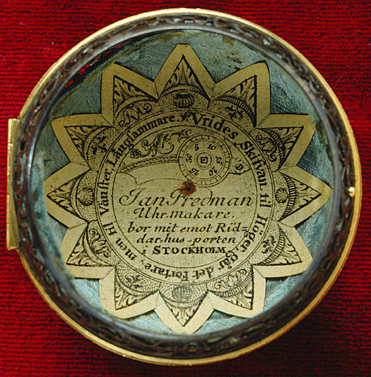 Runt foder av stål med förgylld skoning av mässing med urtag för bärringens skaft. Liten lockring med öppning för urtavlan, d: 43 mm, locket fäst med gångjärn, fjäderlås av blånerat stål. Lockets och underdelens sidor genombrutna i fint graverat rankverk. På underdelens undersida inlagt i guld och polerat i nivå med stålet ett namnchiffer krönt med kunglig krona, spegelmonogram C, däromkring två korsade och nertill sammanbundna palmkvistar. Invändigt klätt med ljusblått siden, i underdelen en lös pappersetikett med firmatryck för urmakarmästaren och åldermannen i Stockholm Jan Fredman (1712-1767).