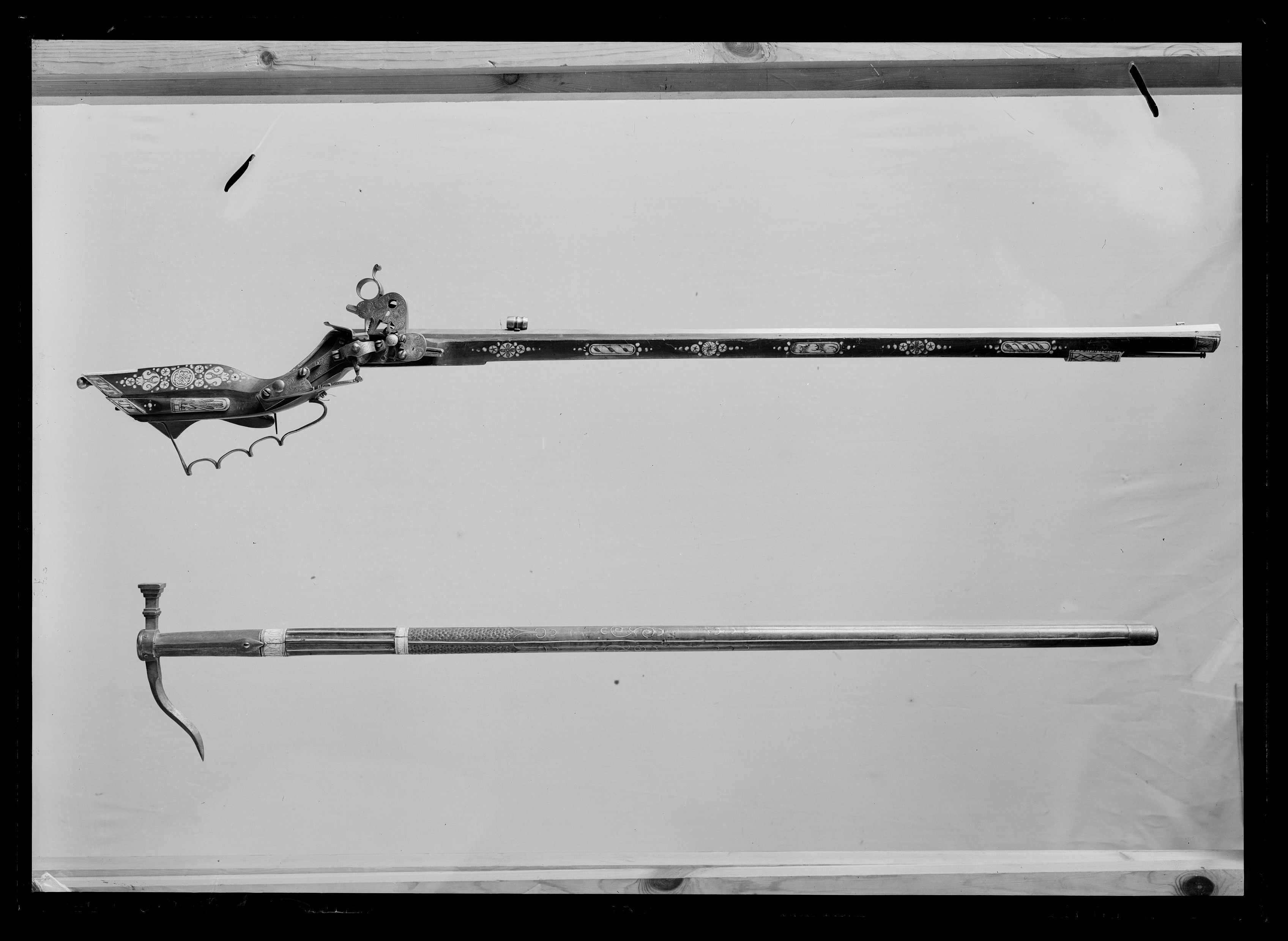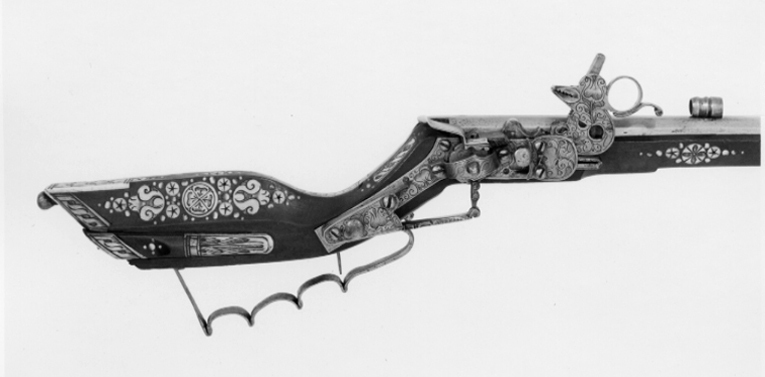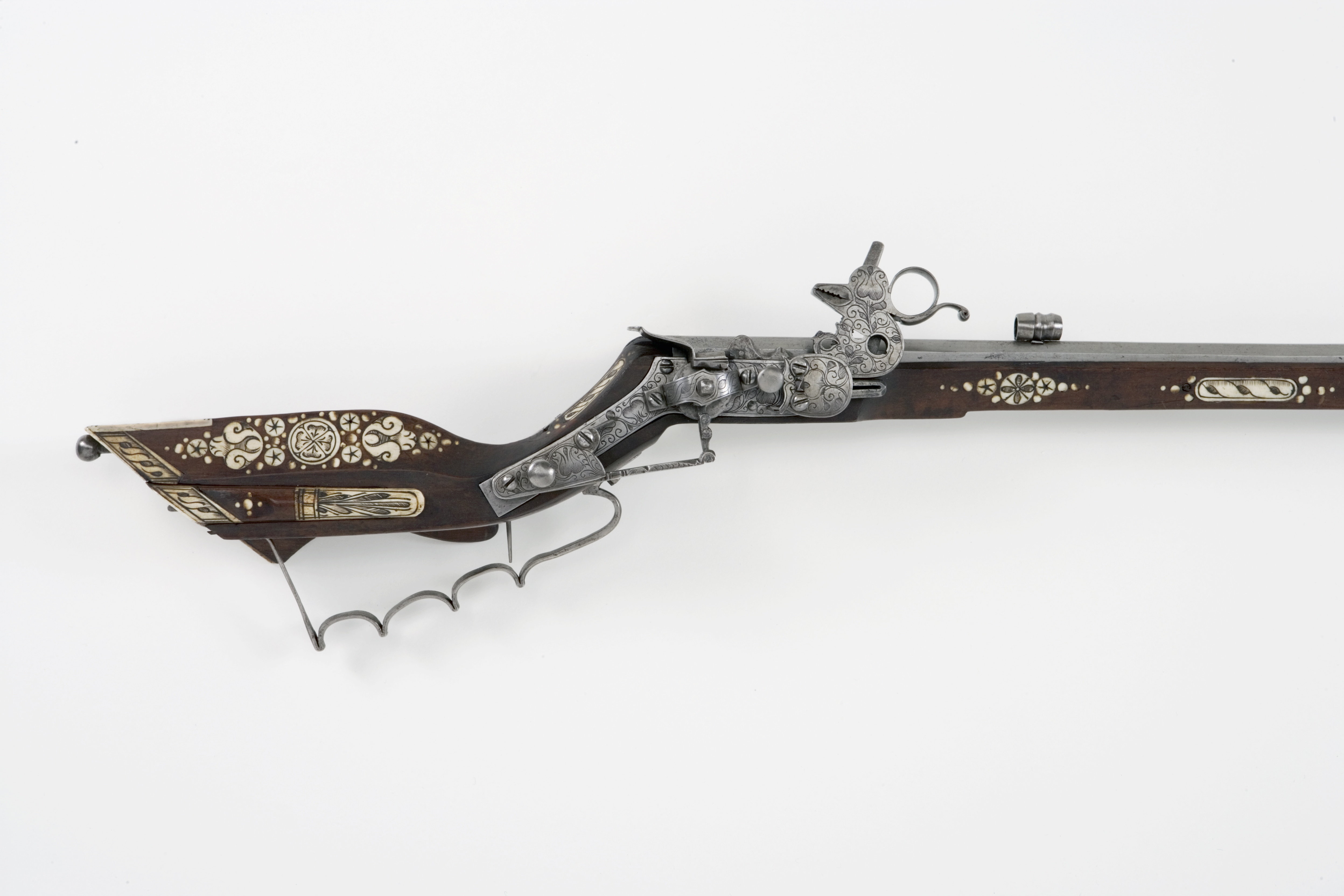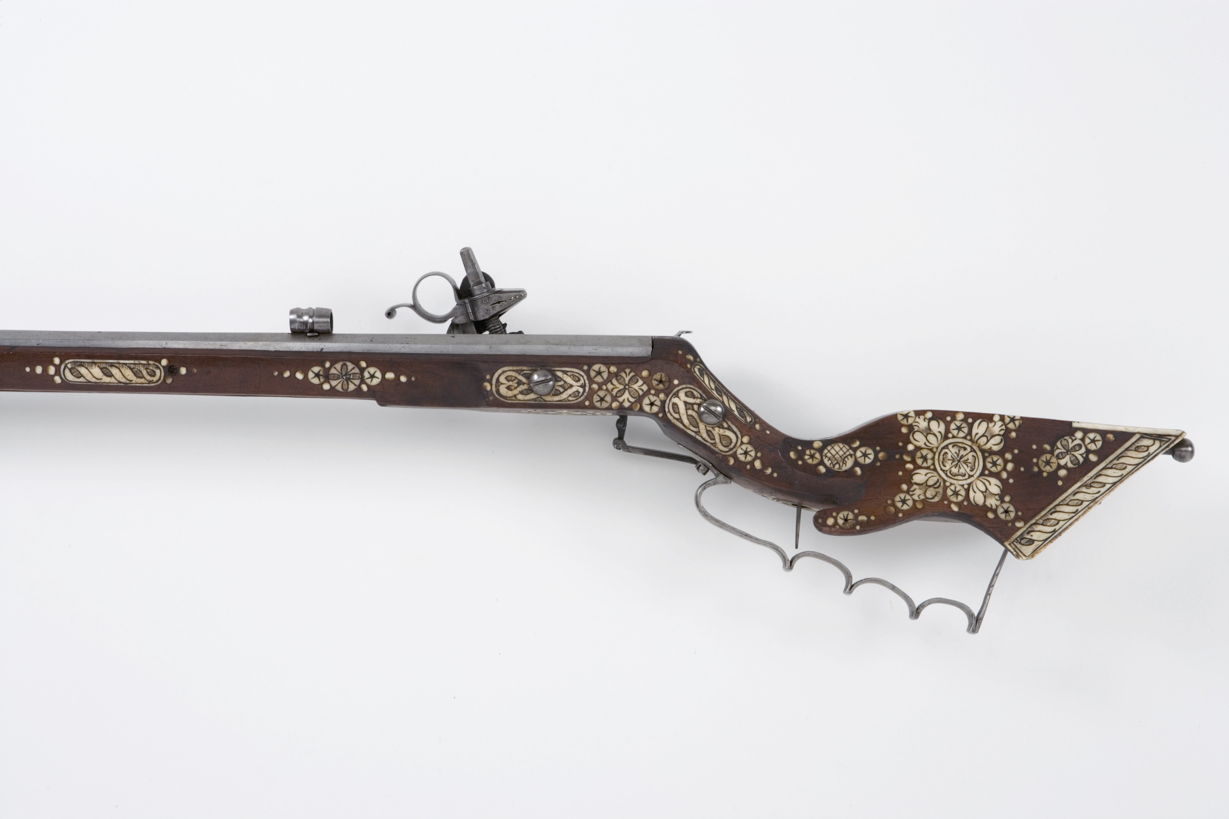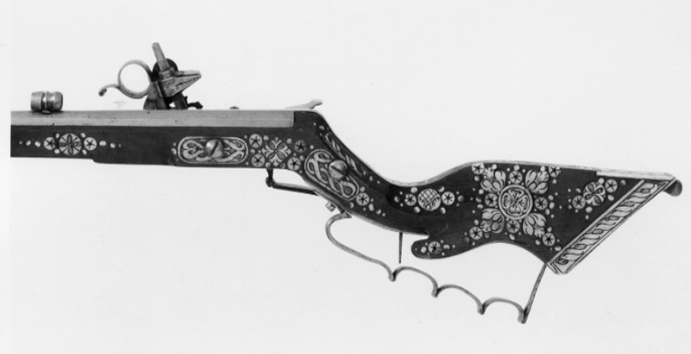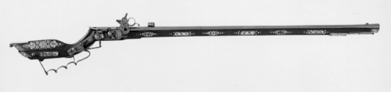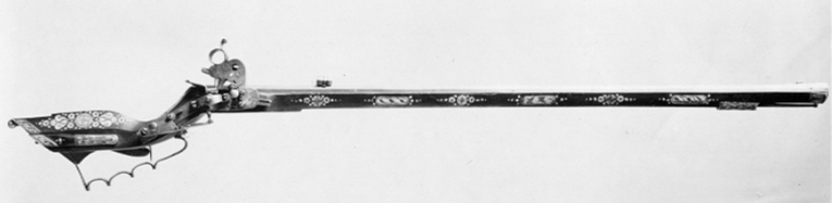 Åttsidig, räfflad pipa, 8 räfflor, bombredd 3 mm. Något förstärkt vid mynningen. Otydlig stämpel på kammaren, kluven sköld med örn(?, LRK 1921:313:1, Nürnberg?). Riktmedel: Rörsikte, solsikte av stål (sitter löst i laxningen). Stolpkorn av stål. Fästning: Pipan fäst med krysskruv underifrån (främre varbygelskruven) samt ett pipstift av stål och ett halvt av trä (urspr. tre). Hjullås av teschitztyp med utanpåliggande hjul och slagfjäder. Hane med lös överkäke, ringformigt fingergrepp med något böjd arm. Stor genombruten skärm mellan hankropp och huvud, liten skärm på huvudet. På låsbleck, hjulbrygga, hane, slagfjäder- och hanfjäderbleck samt fängpannelocket graverad dekor, barocktulpaner. Z-formig hanstudel. Svagt s-formig, rektangulär eldskärm. Två tryckknappar. Fängpannelock med rörlig, blånerad arm, blånerat mellanled mellan hjulaxel och fängpannearm. Fästning: Två låsskruvar. Avtryckaren rak. Ovalt avtryckarbleck av ben. Brun helstock av teschitztyp med enkla, graverade inläggningar av ben. Bakplåt utan dekor. Kolvlådelock av stockens trä med inläggningar. Två ovala låsskruvbrickor, en rörka samt näsband. Varbygel av stål med 3 fingerlägen. Tillbehör: Laddstock av ljusare trä, l: 910 mm, krats av stål, l: 81 mm, i ena änden.