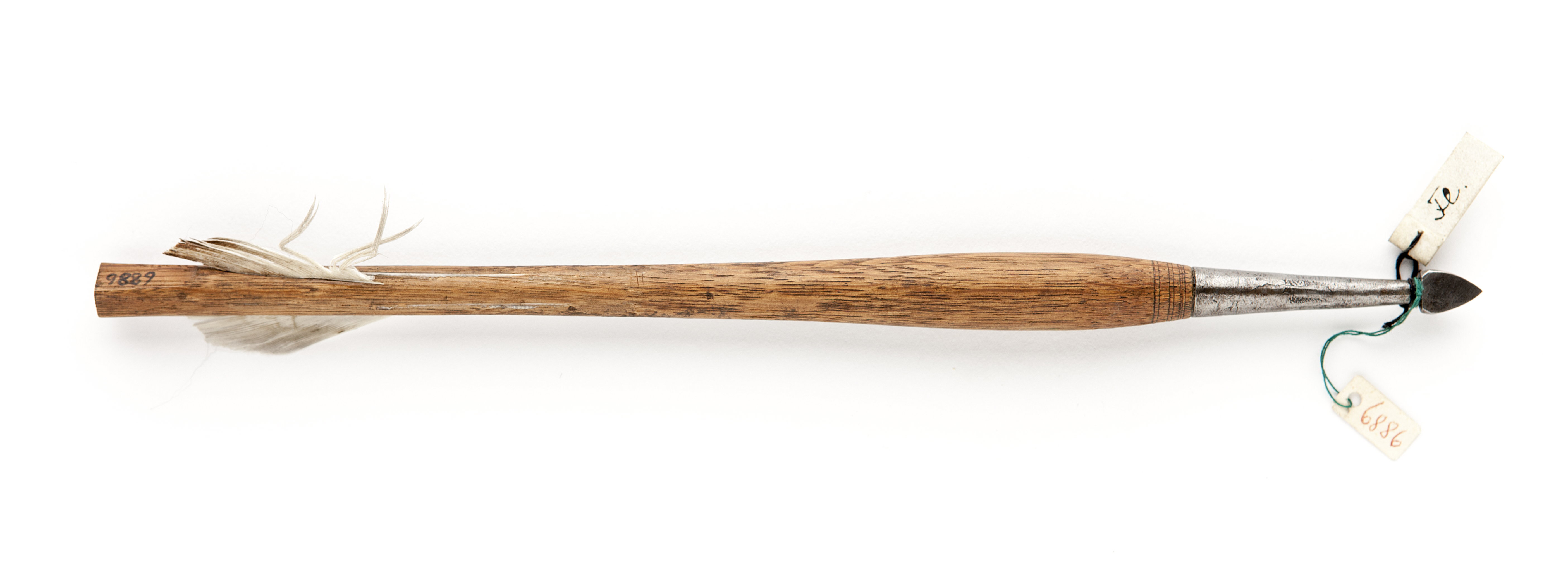 Holkförsedd spets av stål, triangulär med trekantig genomskärning. Skaft av ljust trä. Runtutom pilstjärten som har fyrkantigt tvärsnitt, vidgat intill holken och dekorerat med fina linjer. Två påklistrade styrfjädrar av vita vingpennor.