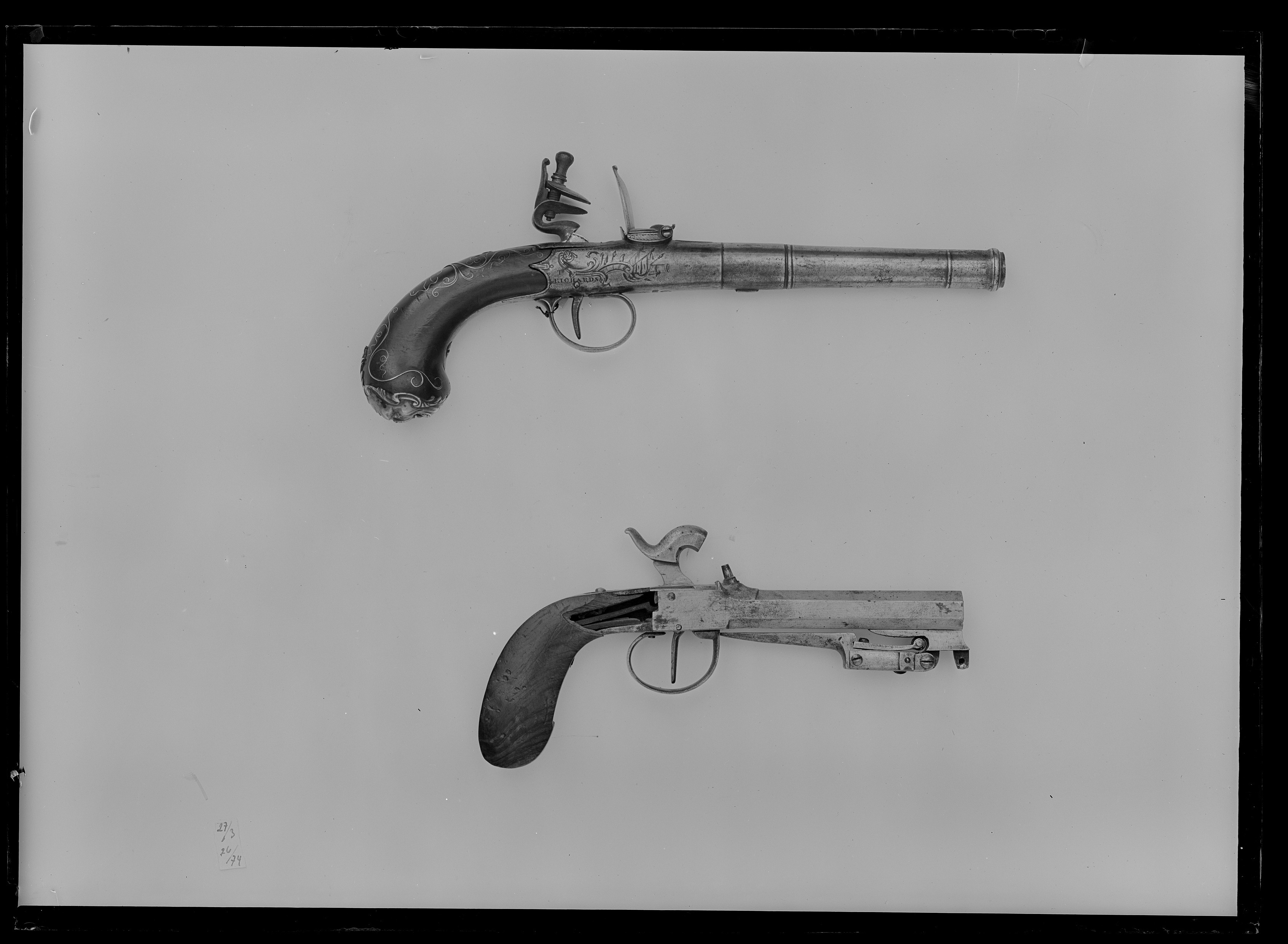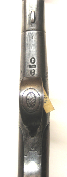 Rund, framåt något avsmalnande, avskruvbar, slätborrad pipa med profilerad mynning. 25 mm från mynningen och 29 mm från bakre änden dubbla ringar. Vid pipans bakre ände baktill en klack och därbakom graverat 1. Pipan baktill övergående i låshus av samma diameter som fortsätter bakåt i underbeslag till kolvkulan. Graverad dekor i form av rankor, framåt avslutade i tre fanor och kanonrör på h sida, vid bakänden signatur "T. // RICHARDS". På v sida ett rektangulärt lock och därpå rankverk med inflikat två fanor, stridsklubba och sabelspets (?). På undersidan framför varbygeln stämplad: London GP, T R i rektangel och London view. Centralt placerad hane med lös överkäke, käkskruv med balusterformigt huvud. Hanen fäst med skruv från v sida igenom lock fäst med skruv bakom fängpannan samt genom "svansskruvbladet". Närmast kvadratisk fängpanna med svängd undersida, graverad dekor på sidorna, batteri med åsad rygg och liten klack upptill, graverad kantbård, batterifjädern infälld i pipans ovansida. Böjd avtryckare med rundad framsida. Nedåtsvängd kolv av valnöt med inläggingar av silvertråd längs ryggen och ner till kolvkappan. Kolvkappa i form av lejonmaskaron fäst med skruv i gapet, till v om skruven otydlig stämpel J A. Varbygel av stål fäst på undersidan, på bygeln en oval graverad mittdekor med skrafferad inre del.
