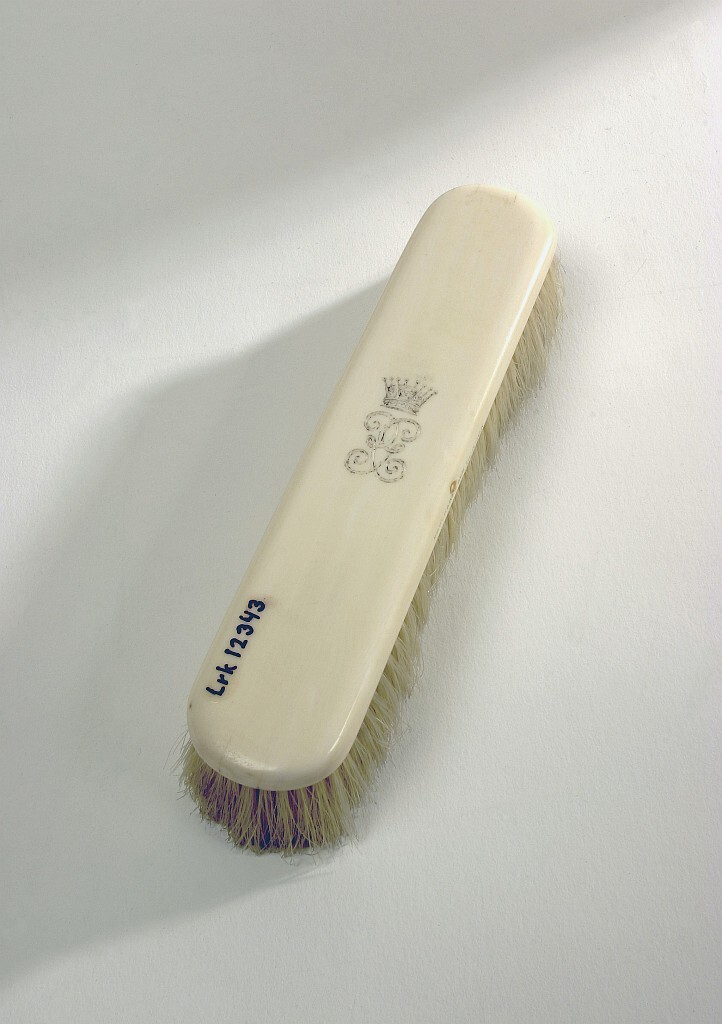 Borste av elfenben med äkta borst. På ovansidan Gustav V:s monogram krönt med kronprinskrona. På kanten stämplat: LEUCHARS & SON LONDON.