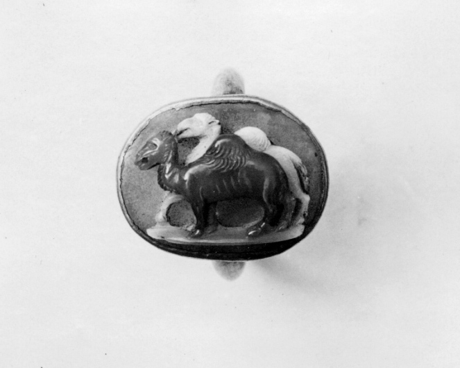 Transparent oval kamé av agat med skuren hög relief, en brun kamel framför en vit. Grå, genomsynlig botten. Kistfattning av guld med fasad sida och undersida med tvärgående skålning. Ring med rak insida och välvd utsida.
