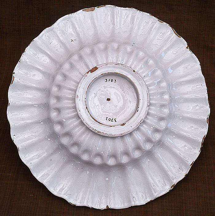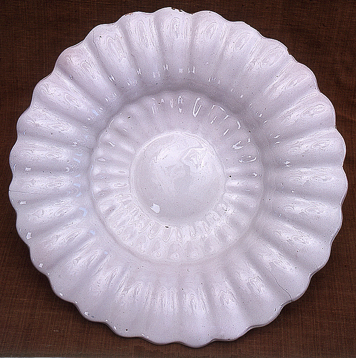 Låg fotring , välvd spegel , räfflad kep , räfflat , något nedvikt brätte med runduddig kant. Platt fotring.