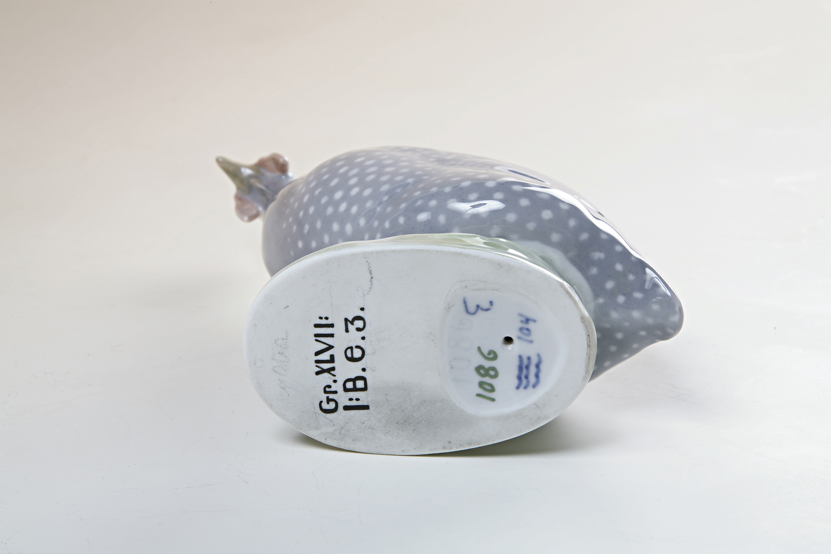 FIGUR. Pärlhöna med grålila fjäderskrud med vita prickar stående på ljusgrön fotplatta. Underglasyrmålning i naturliga färger. Fabriken grundlagd med privilegium av 13 mars 1775 av ett aktiebolag med historikerna Suhm och konferensrådet Holm som direktörer samt med Franz Heinrich Müller som teknisk ledare. Företagets grundande hade föregåtts av experiment utförda sedan 1752 under olika personers ledning, den mest kände var fransmannen Louis Fournier. Genom en kansliskrivelse 1779 kungjordes fabrikens överlåtelse till kung Christian VII varefter den kom att kallas Den Kongelige Porcelainsfabrik