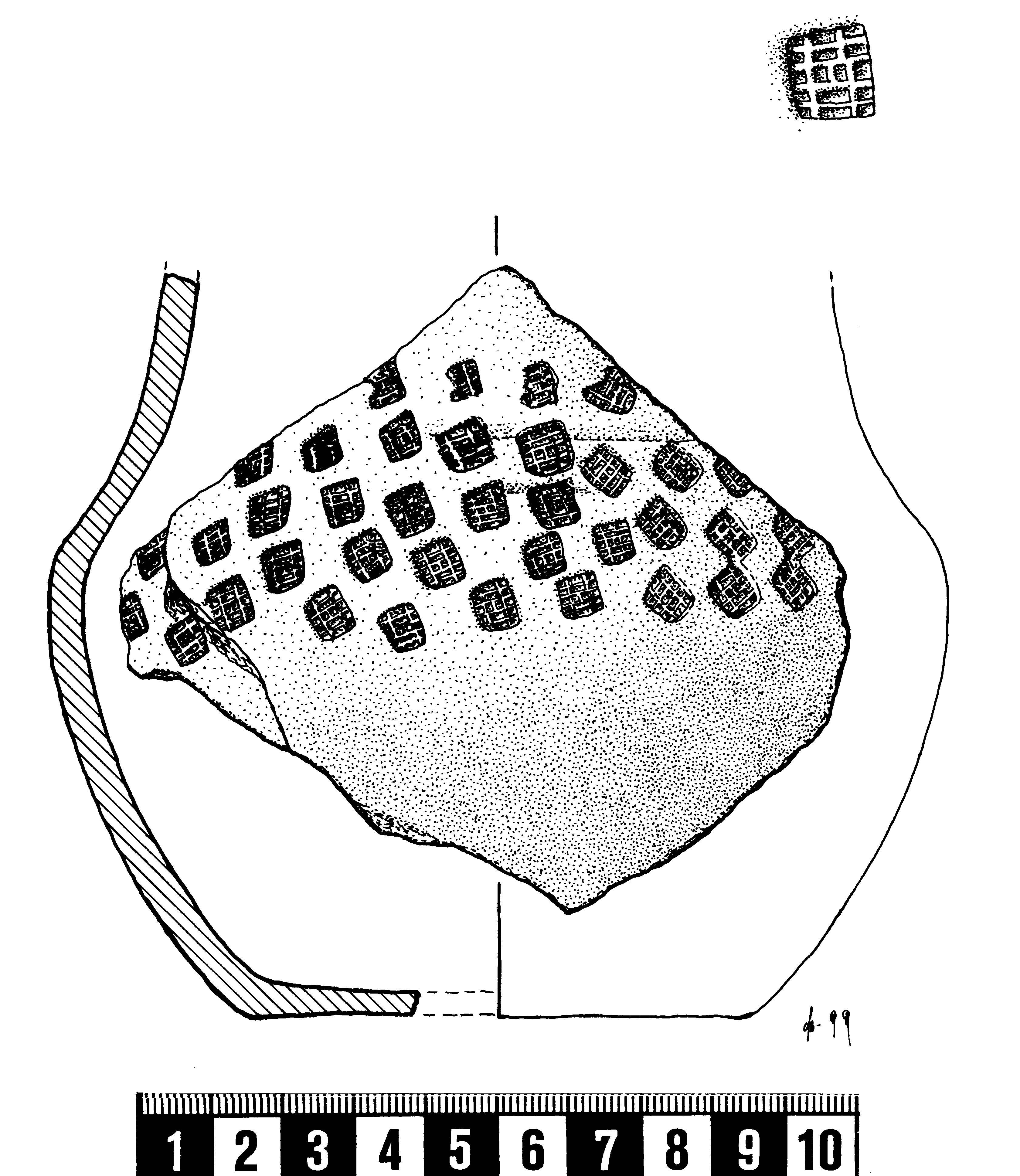 Kraftigt utsvängt bukfragment med fyrkantiga stämplar med rutmönster. Delvis rekonstruerat.