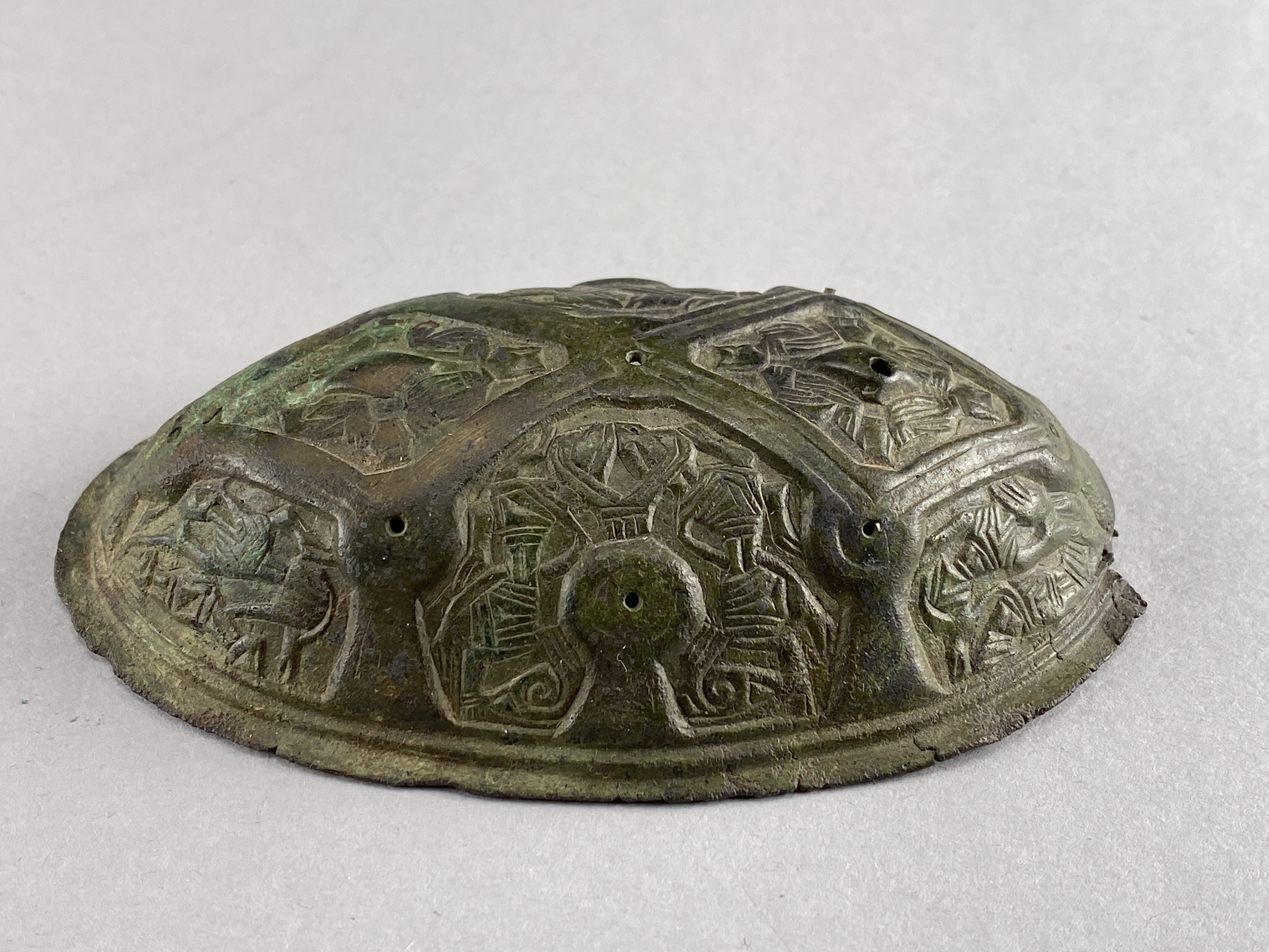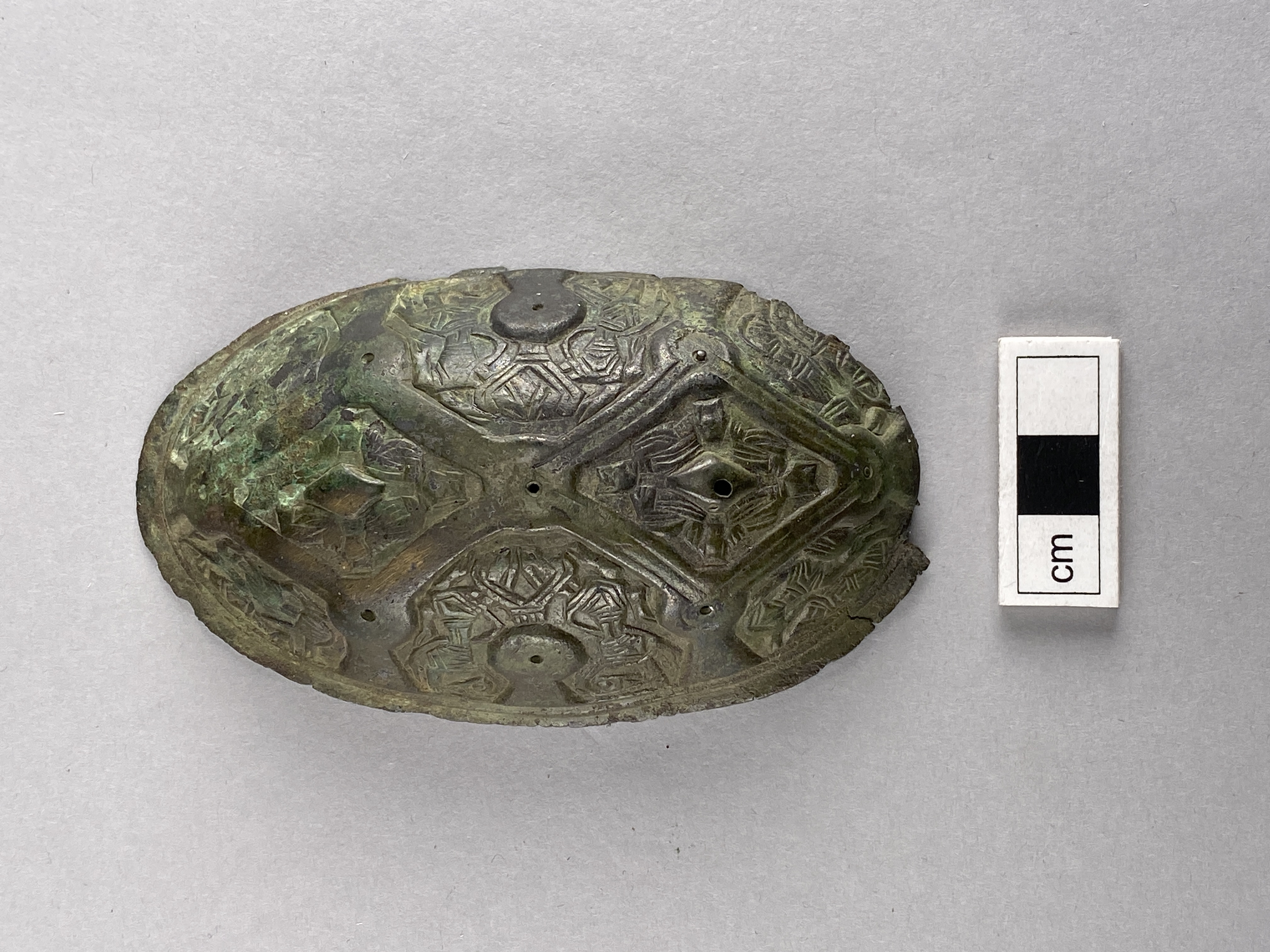 Oval, dubbelskalig spännbuckla med 9 genombrutna knoppar på överskållan. Järnnålen saknas.