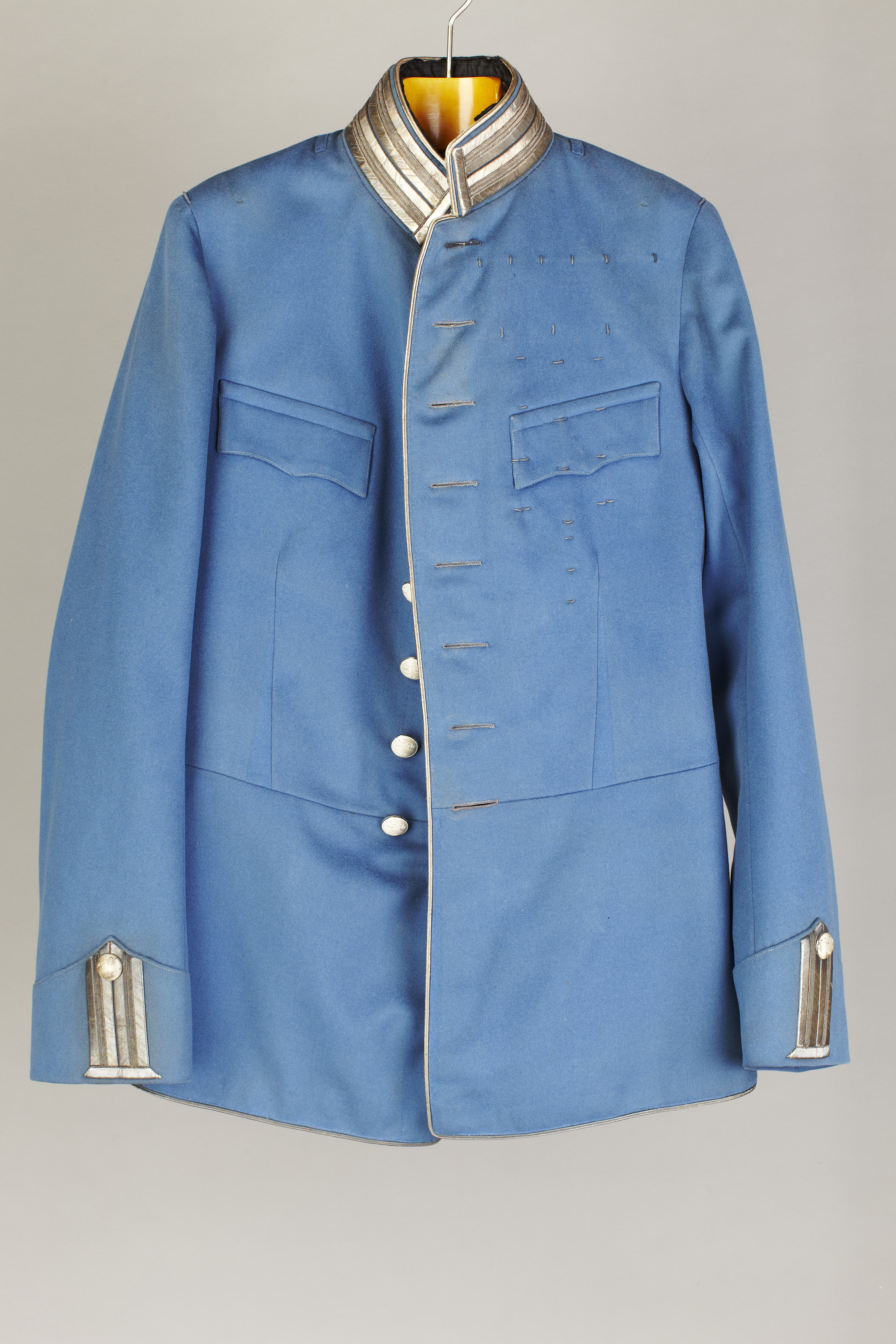Vapenrock av ljusblått kläde, enkelradig med ståndkrage, åtta försilvrade knappar, på insidan firmamärke: "C. C. SPORRONG & CO STOCKHOLM". Rocken är kantad med silversnören. Krage och uppslag med dubbla silvergaloner, 25 mm breda på kragen, 23 mm på ärmen. På v. framstycke 26 tränsar för bröstdekorationer. Falska bröstfickor med lock. Skört med hopsytt sprund med fyra knappar och en ficka på var sida om sprundet. På axlarna en träns och en hälla för axelklaffar. Foder av vit bomull med matelasserat liv. I livet två spänntampar fästade med spänne av gulmetall. Knapphålskanten fodrad med vitt kläde, ärmarna med vitt siden. En innerficka med firmamärke: "M. L.Anker // H. K. H. // Hertigen av Wästergötland // 14.10.11" (af?).