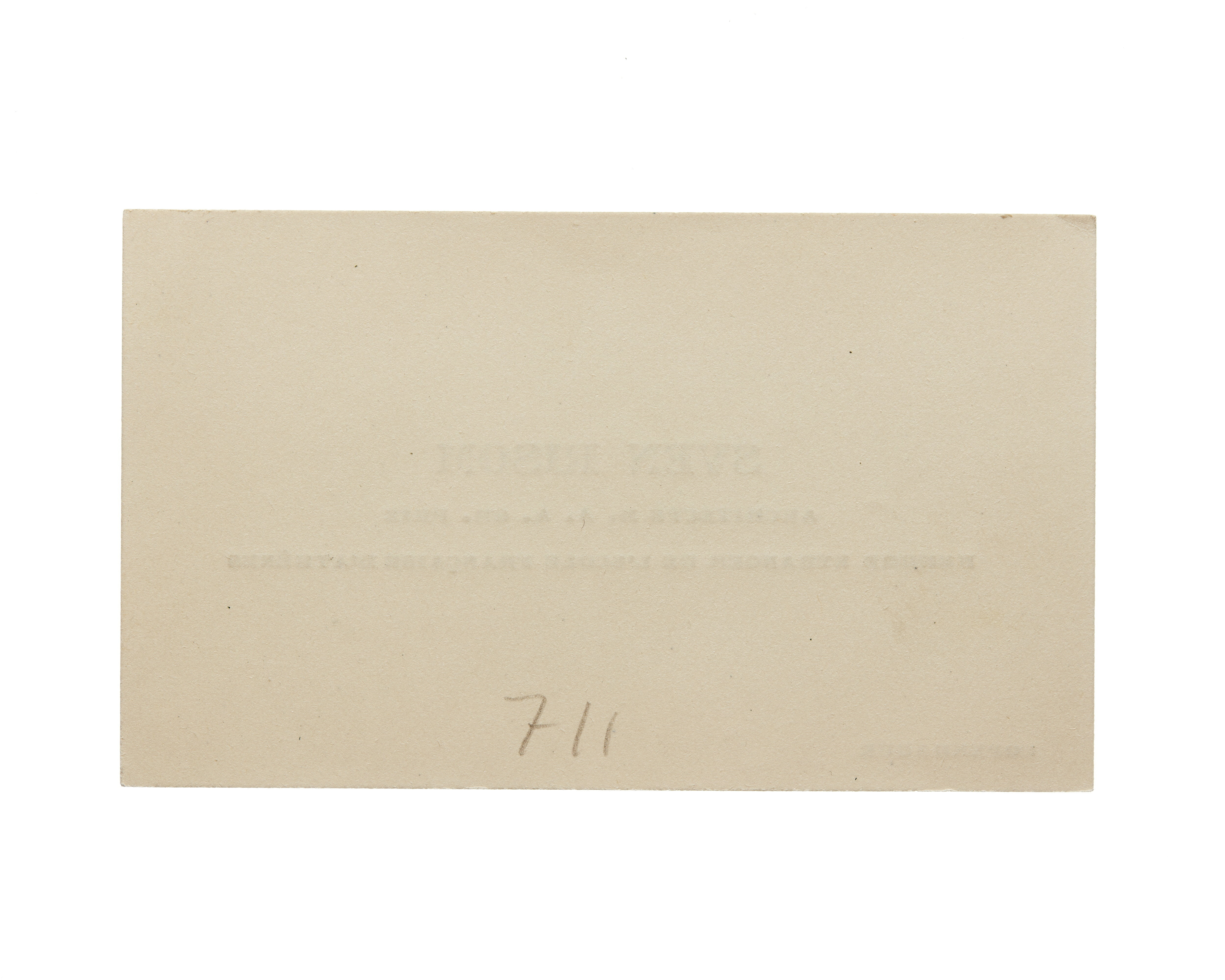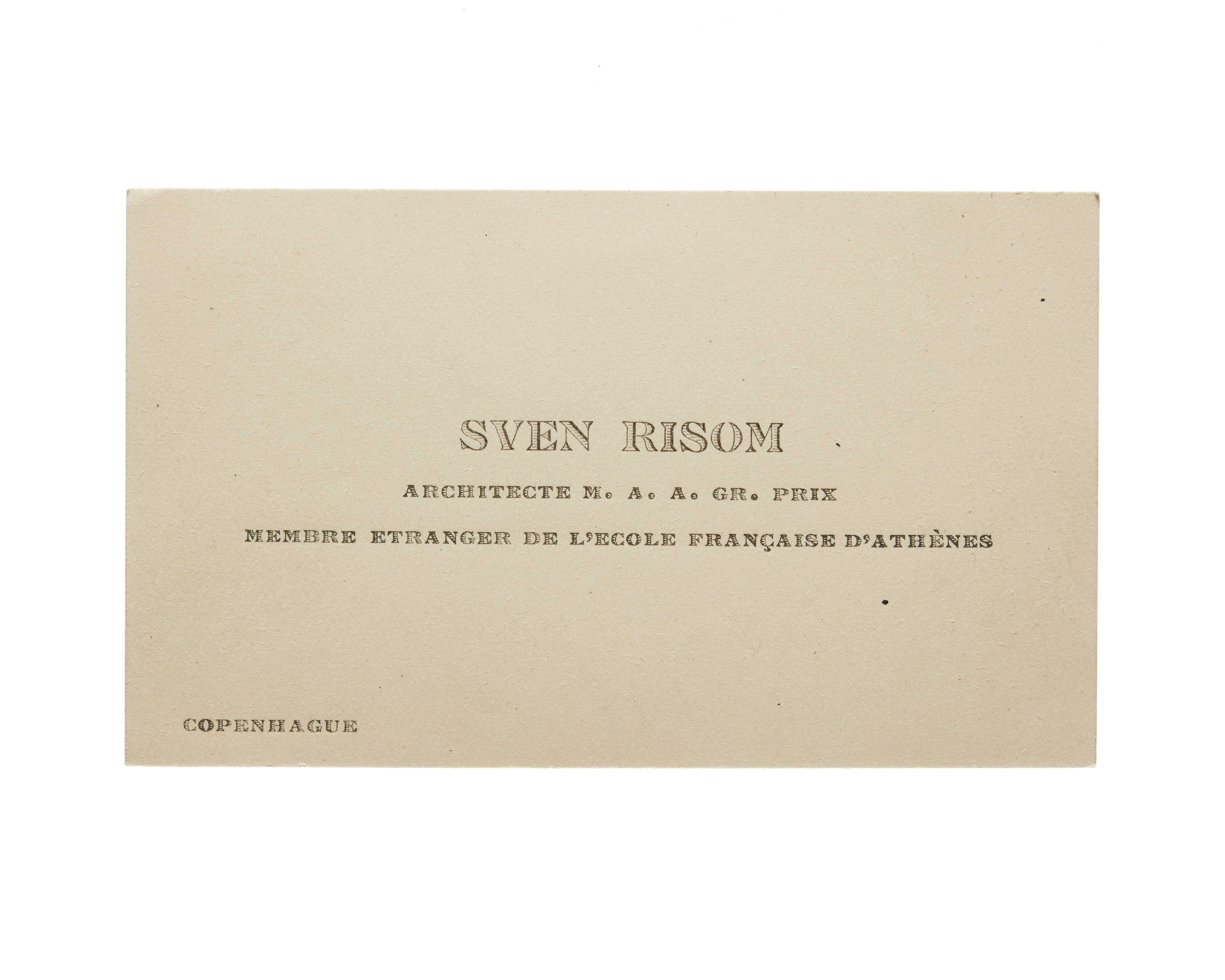 Ett visitkort från Sven Risom, Architecte M. A.A. Gr. Prix, Membre Etranger de L'ecole Française D'athenes, utan datum. Adress (nedre vänstra hörnet) "Copenhague" Köpenhamn.