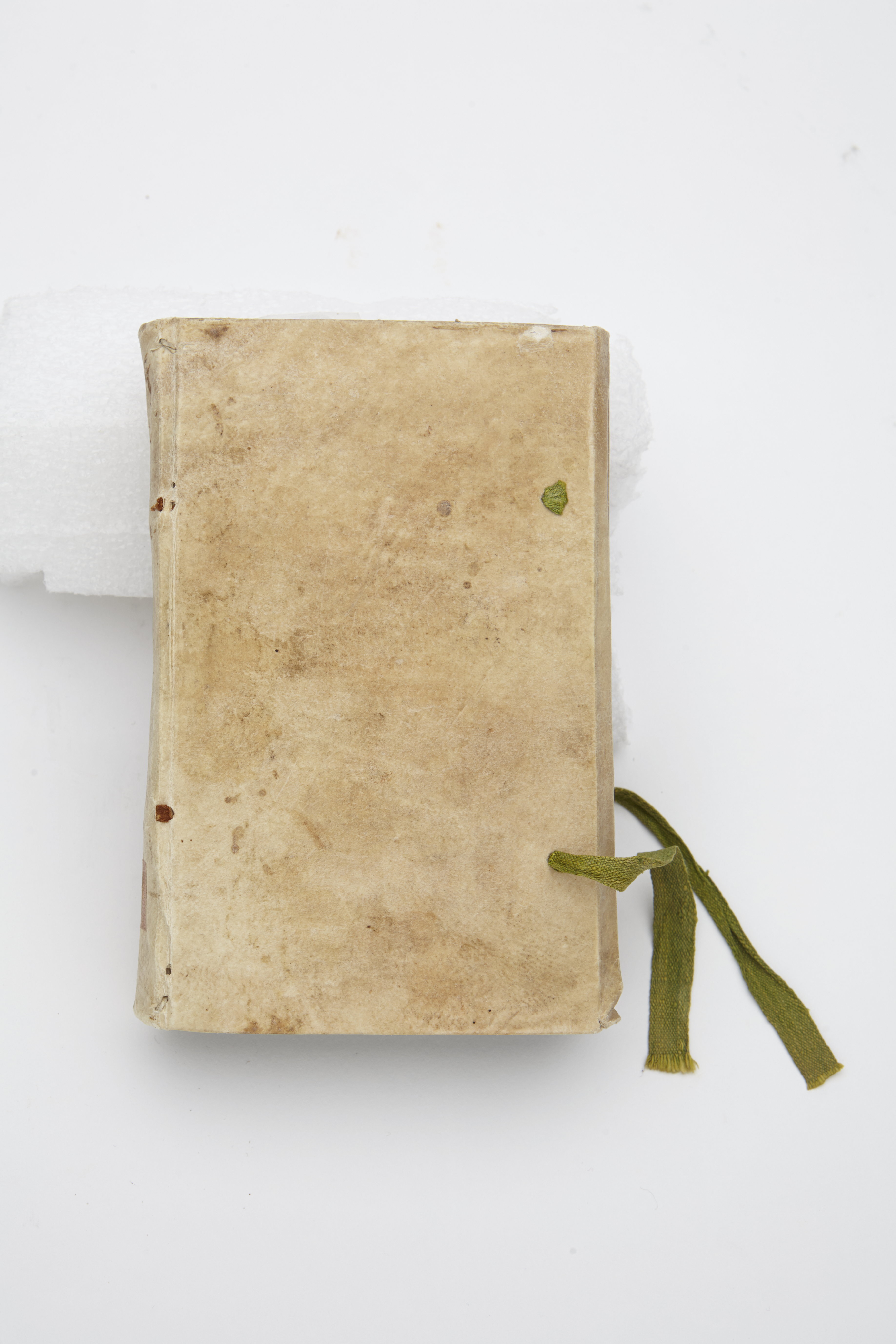 Pergamentband. Knytband av grönt linne. Blått snitt.